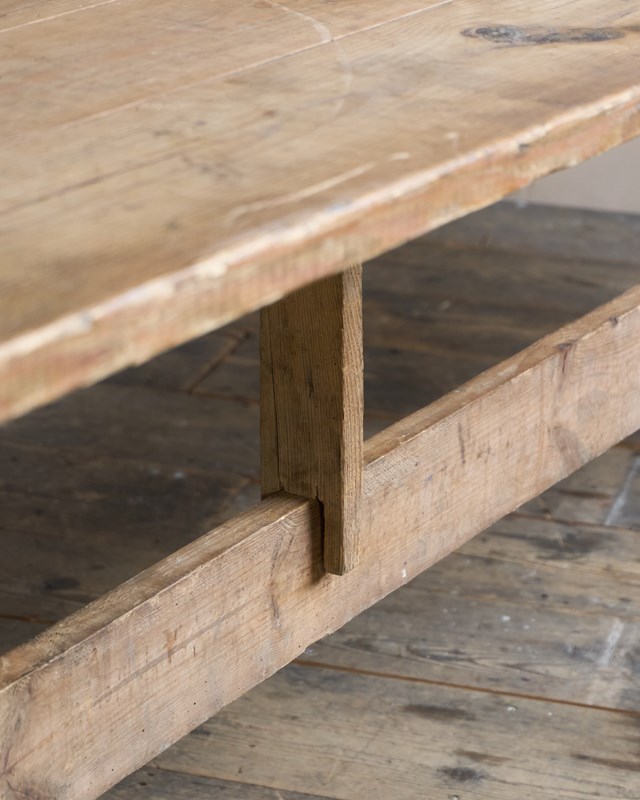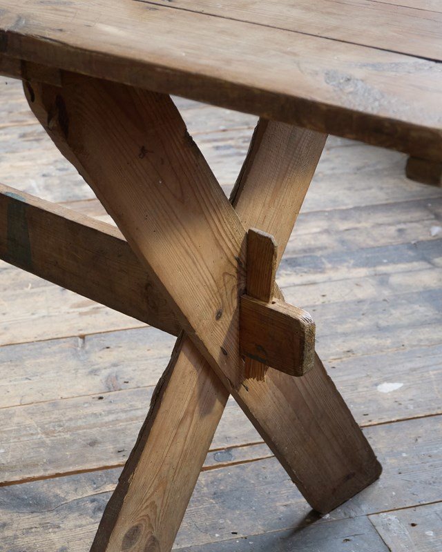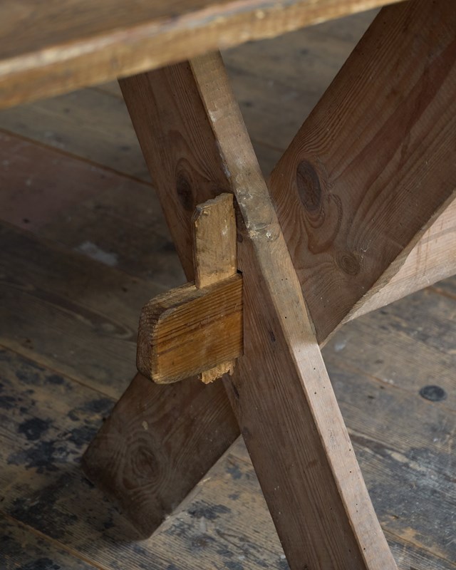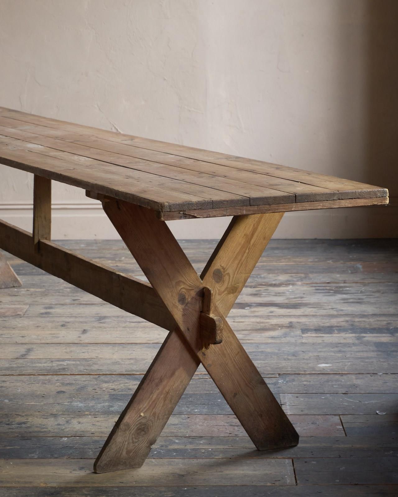 Pine construction which has weathered over time. These long tables would of been brought out of storage, knocked together, and used for village gatherings - weddings, harvest festivals and anything that involved drinking and eating as a large group.