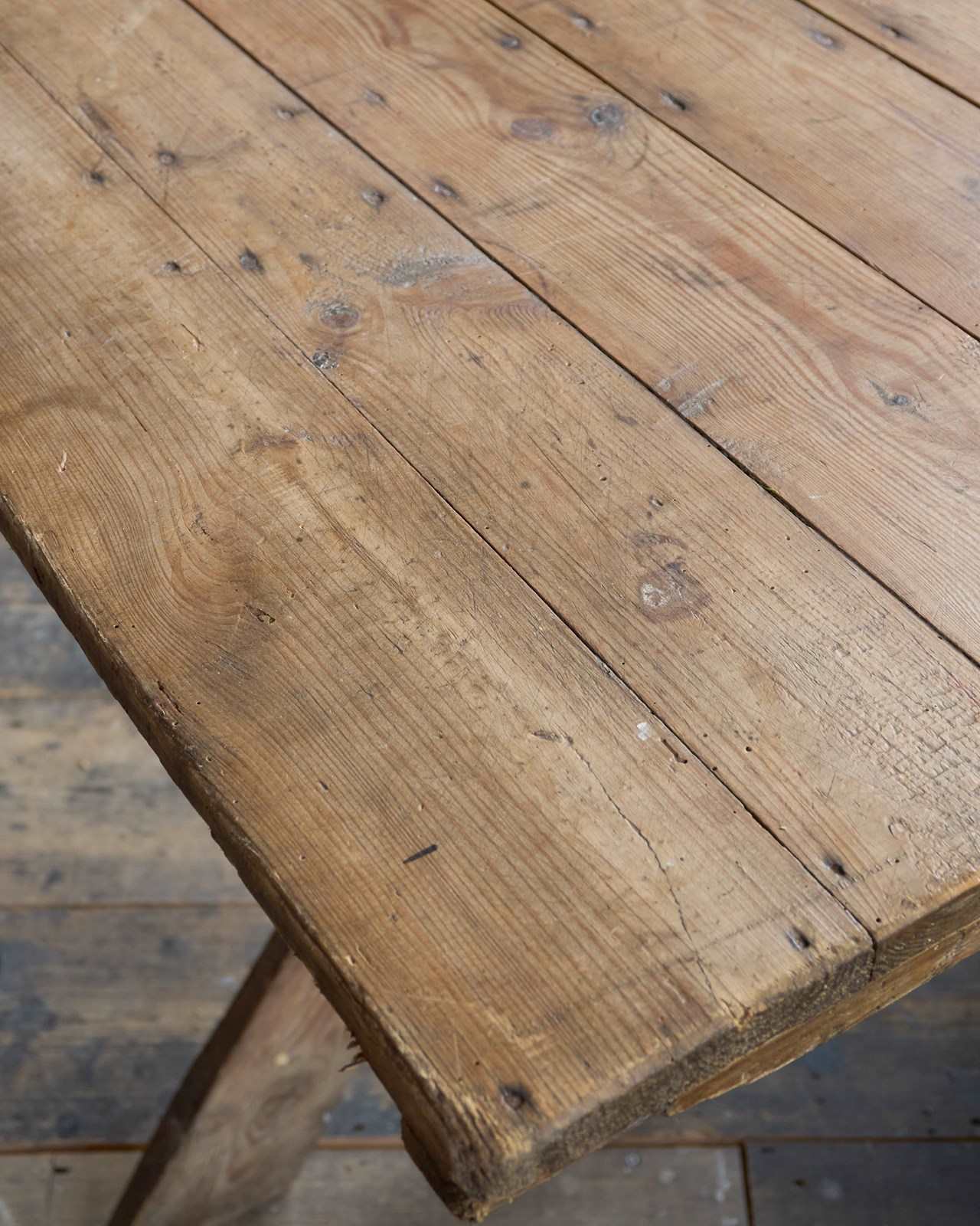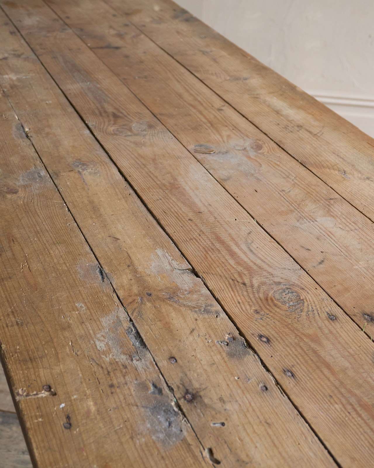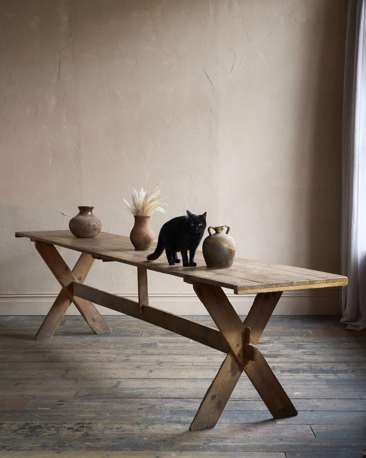 Pine construction which has weathered over time. These long tables would of been brought out of storage, knocked together, and used for village gatherings - weddings, harvest festivals and anything that involved drinking and eating as a large group.