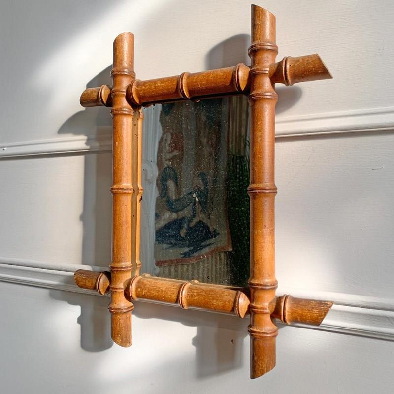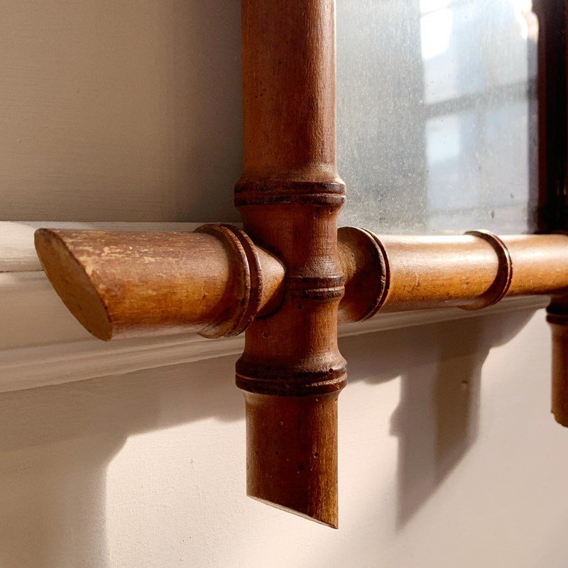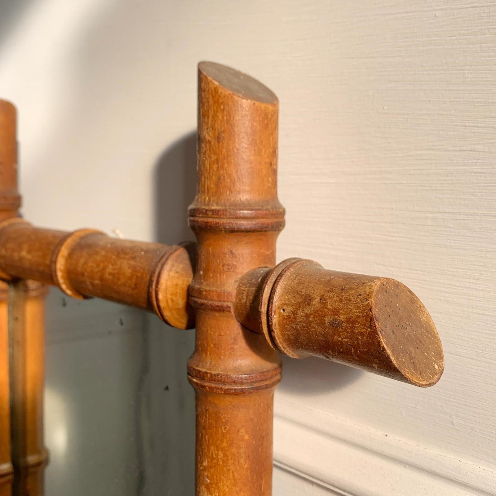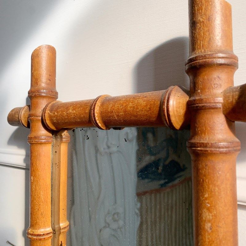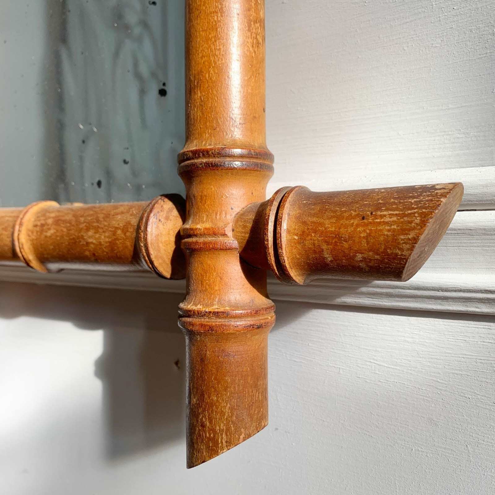 Antique French turned fruitwood faux bamboo mirror. Some light foxing to the mirror plate.