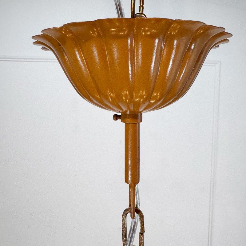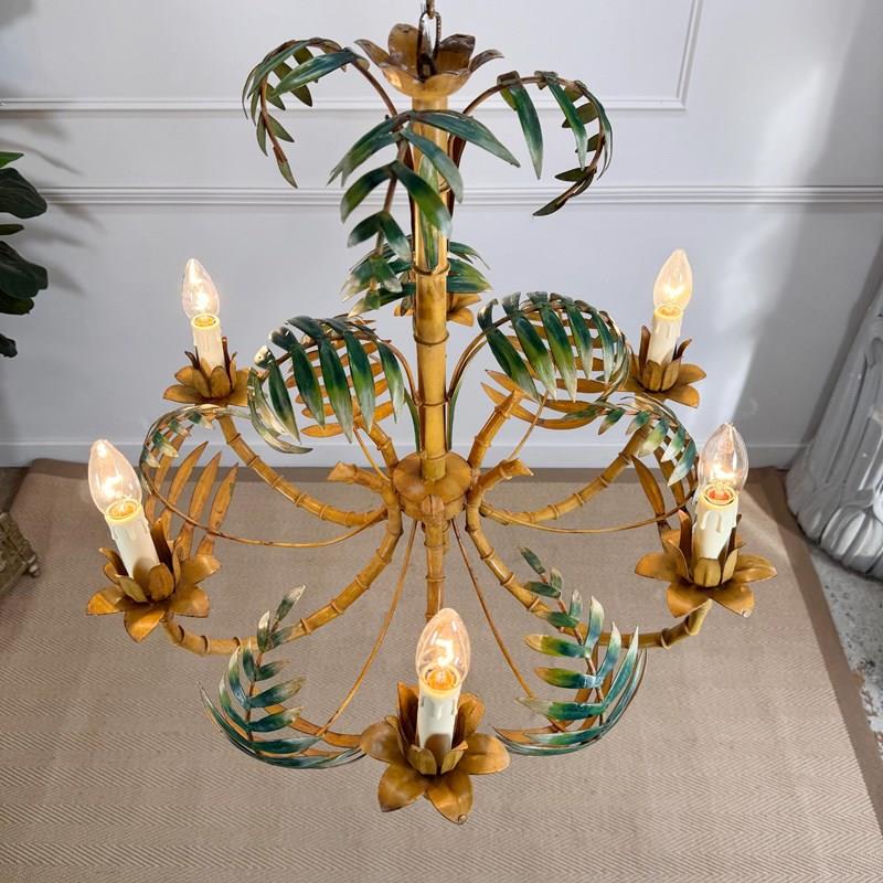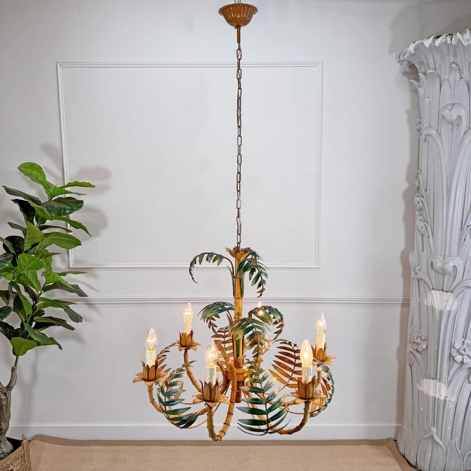 Large Faux Bamboo Palm Leaf Italian Tole Chandelier 1960'S