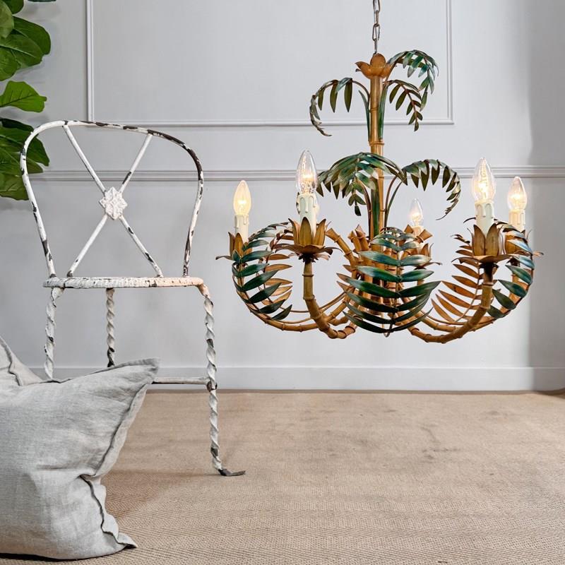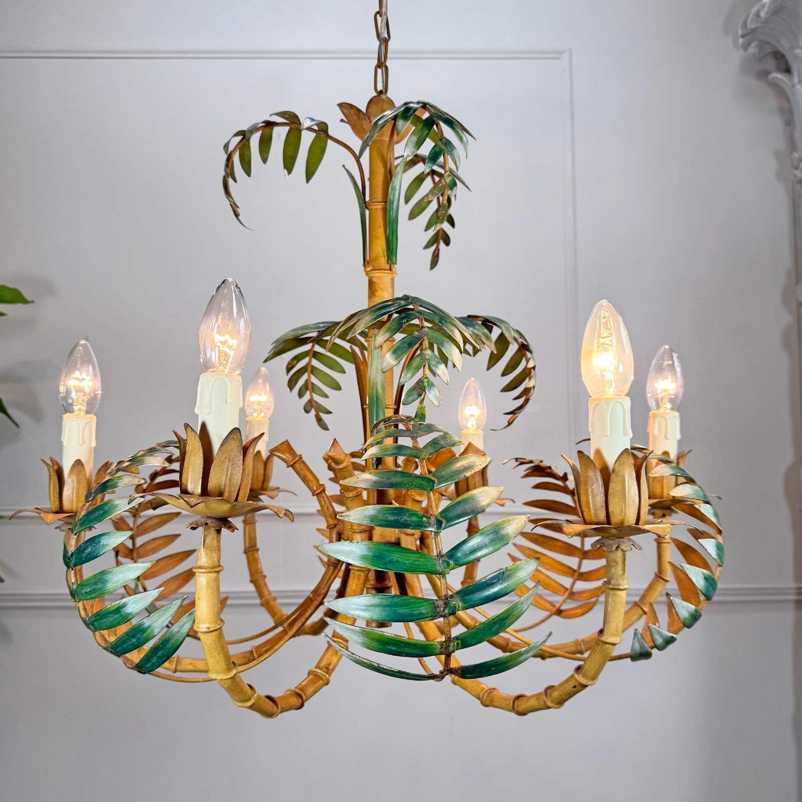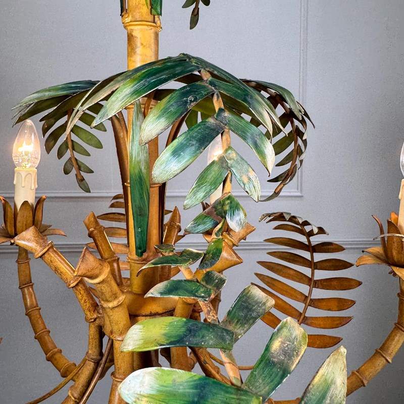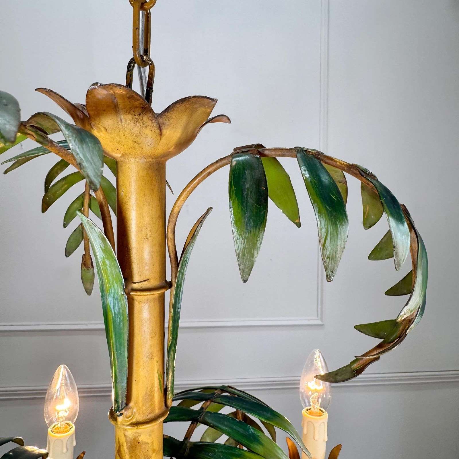 A beautiful chandelier featuring polychrome painted faux bamboo stems with palm leaf fronds throughout