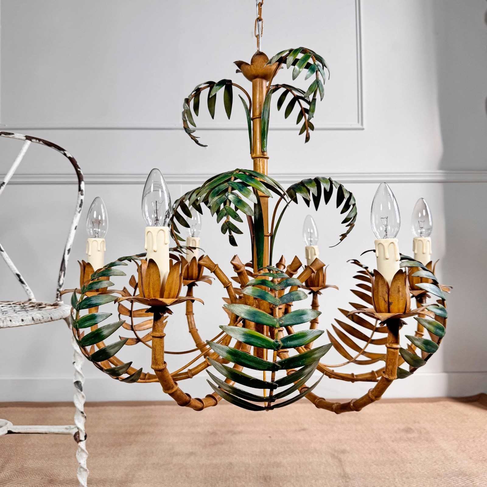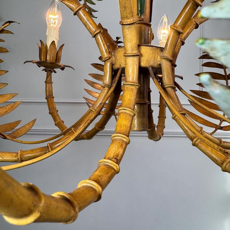 Very Large palm leaf and faux bamboo tole chandelier, 1960s