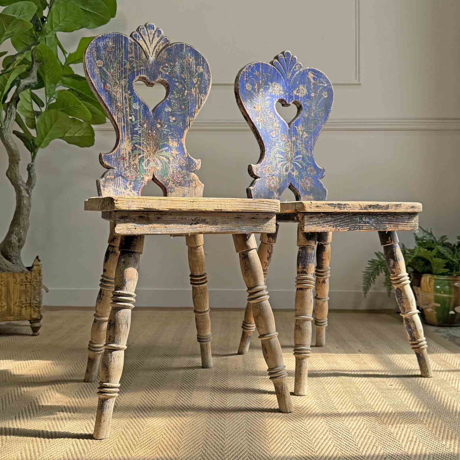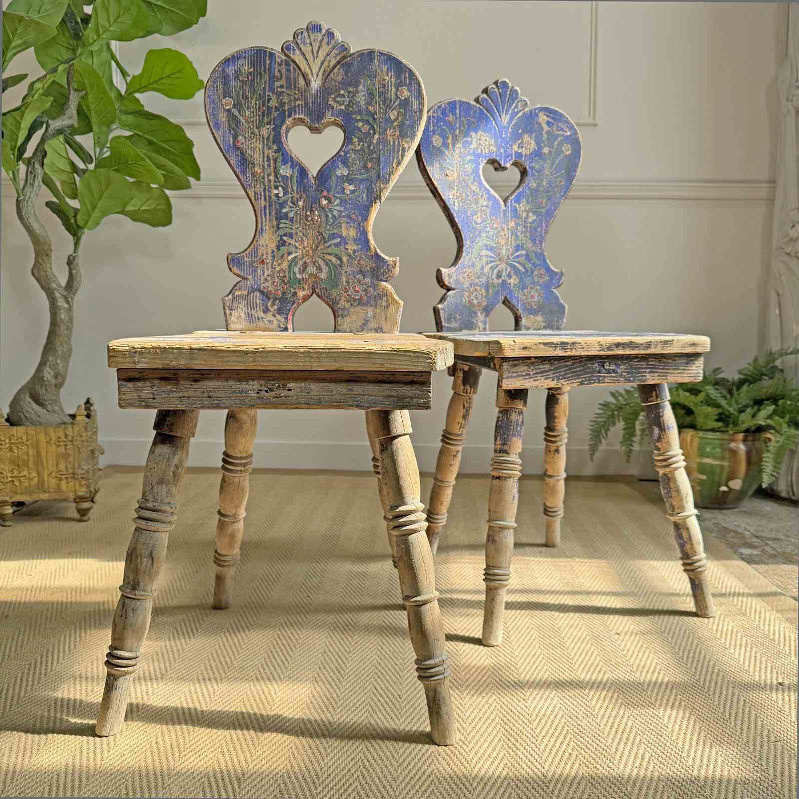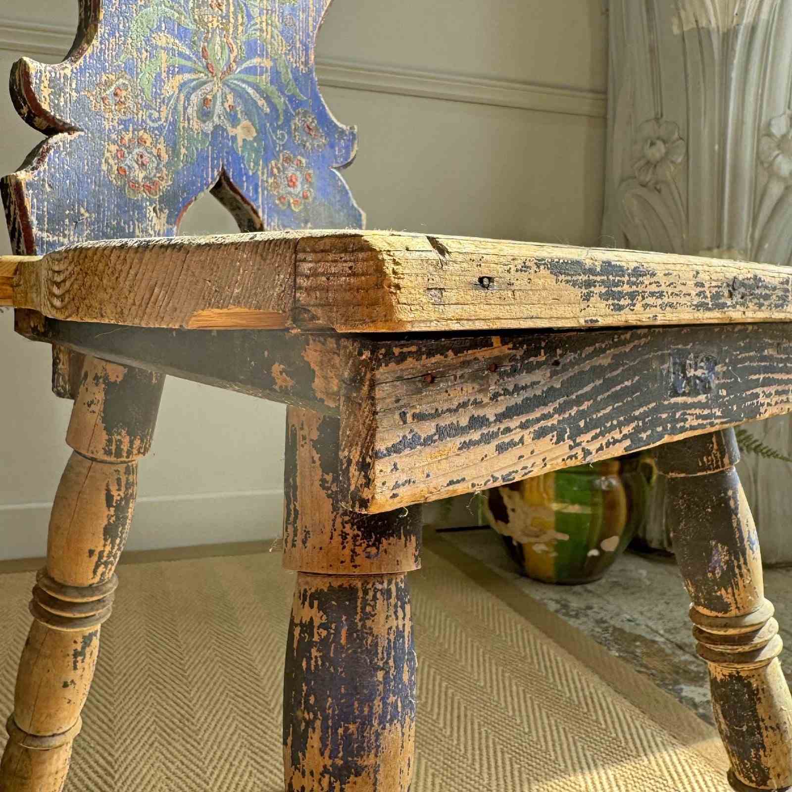 A rare and beautifully preserved examples of late 19th-century Alpine folk art chairs, most likely originating from the Tyrol or southern Bavaria regions.