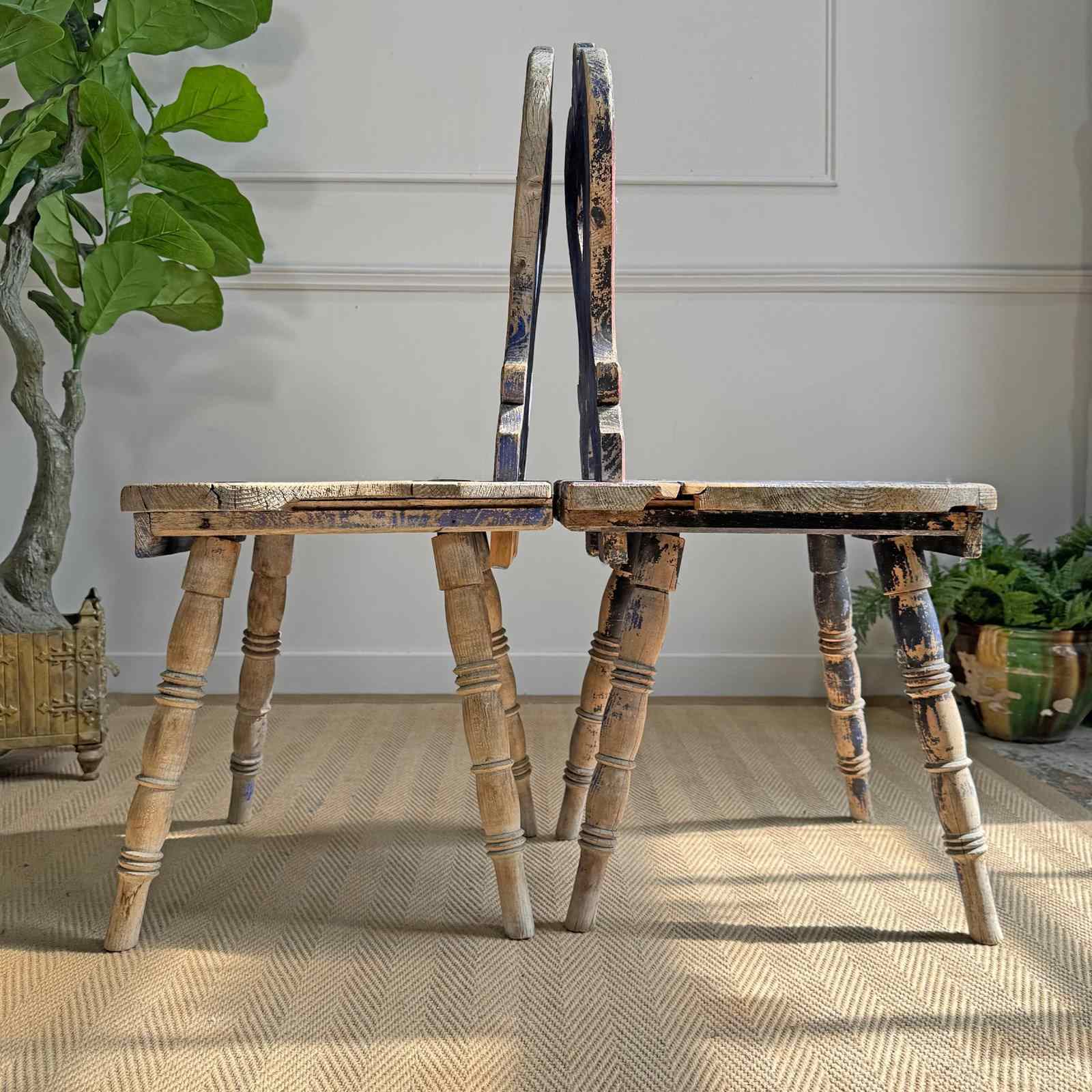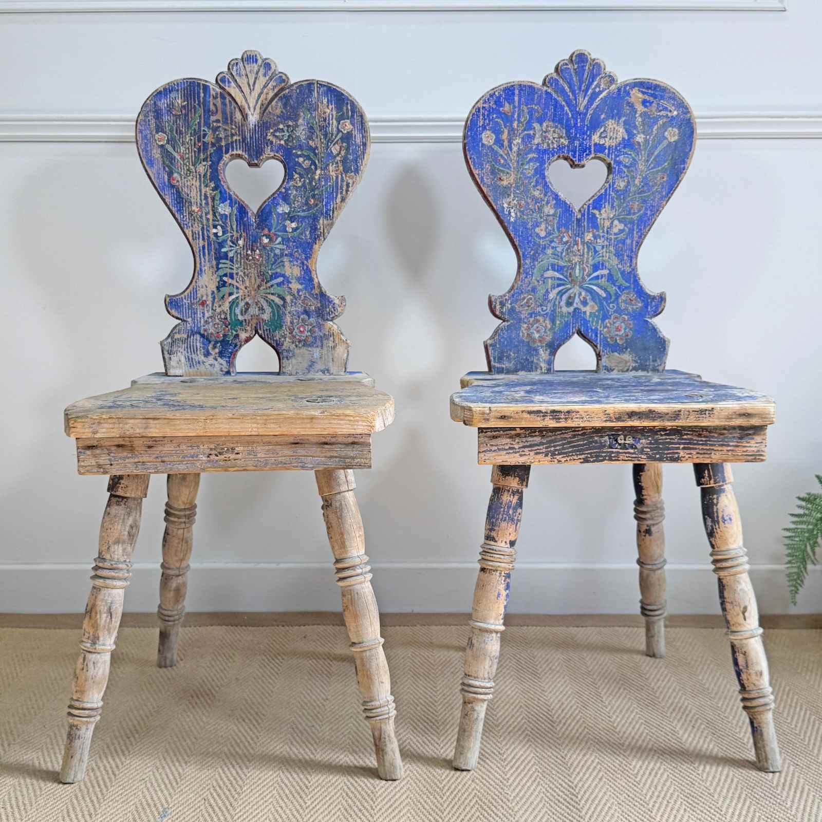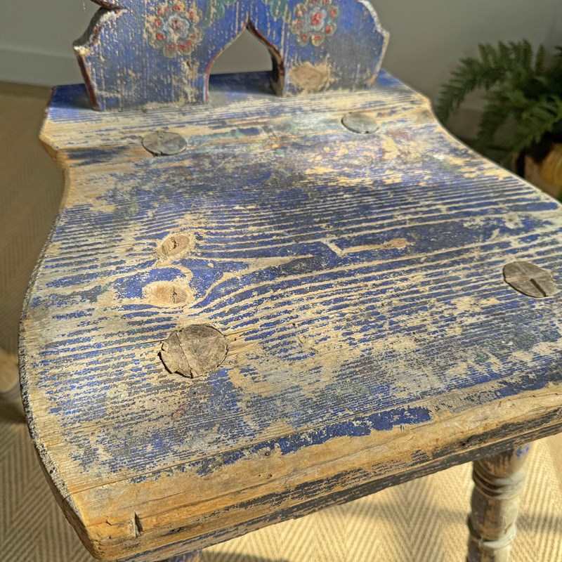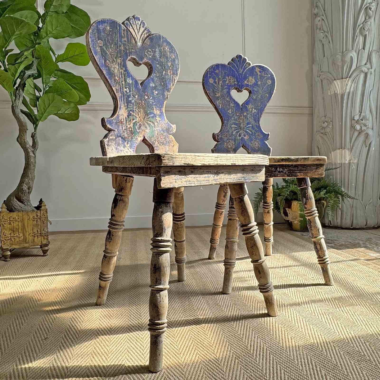 A rare and beautifully preserved examples of late 19th-century Alpine folk art chairs, most likely originating from the Tyrol or southern Bavaria regions.