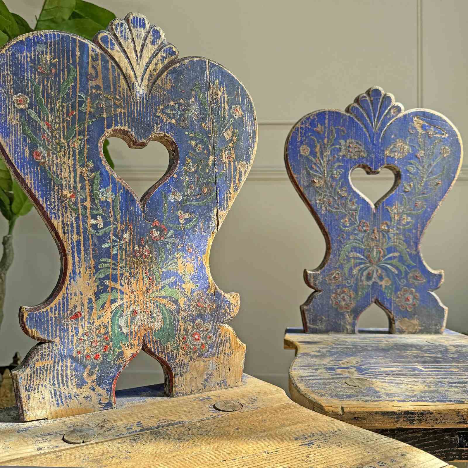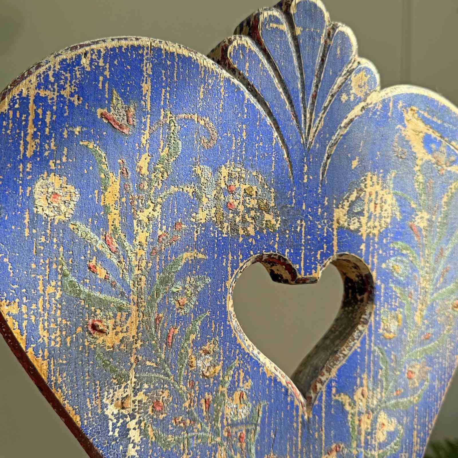 The "heart-back" is a classic Tyrolean motif, historically representing love and devotion. These were often created as gifts to mark significant life events like weddings.