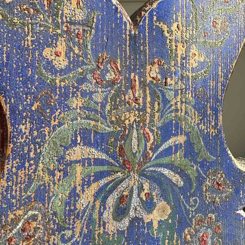 This pair retains a striking Prussian blue ground and the backrests feature delicate, hand-painted floral bouquets in a palette of ochre, soft pink, and muted greens, traditional to the "folk baroque" style.