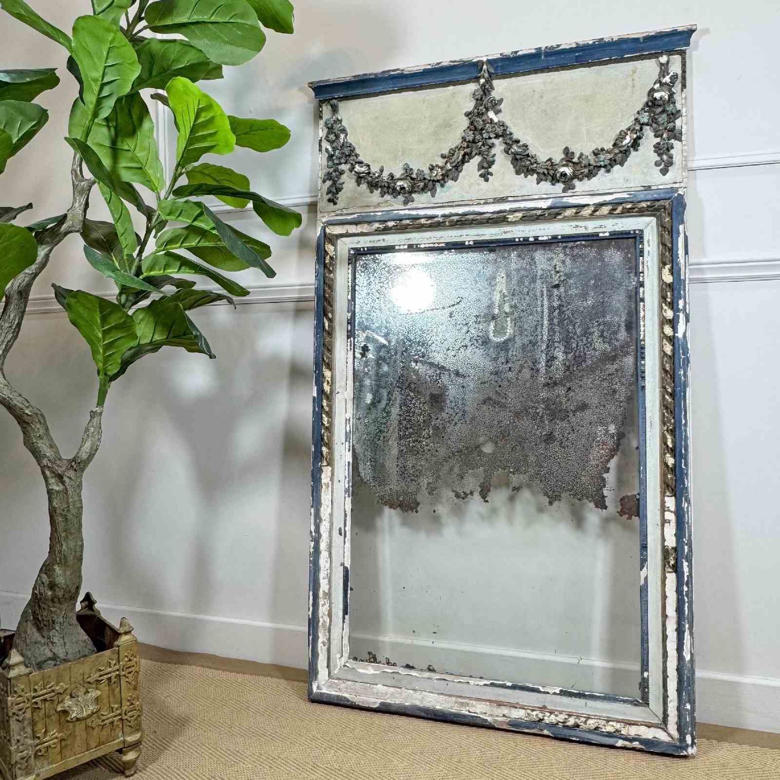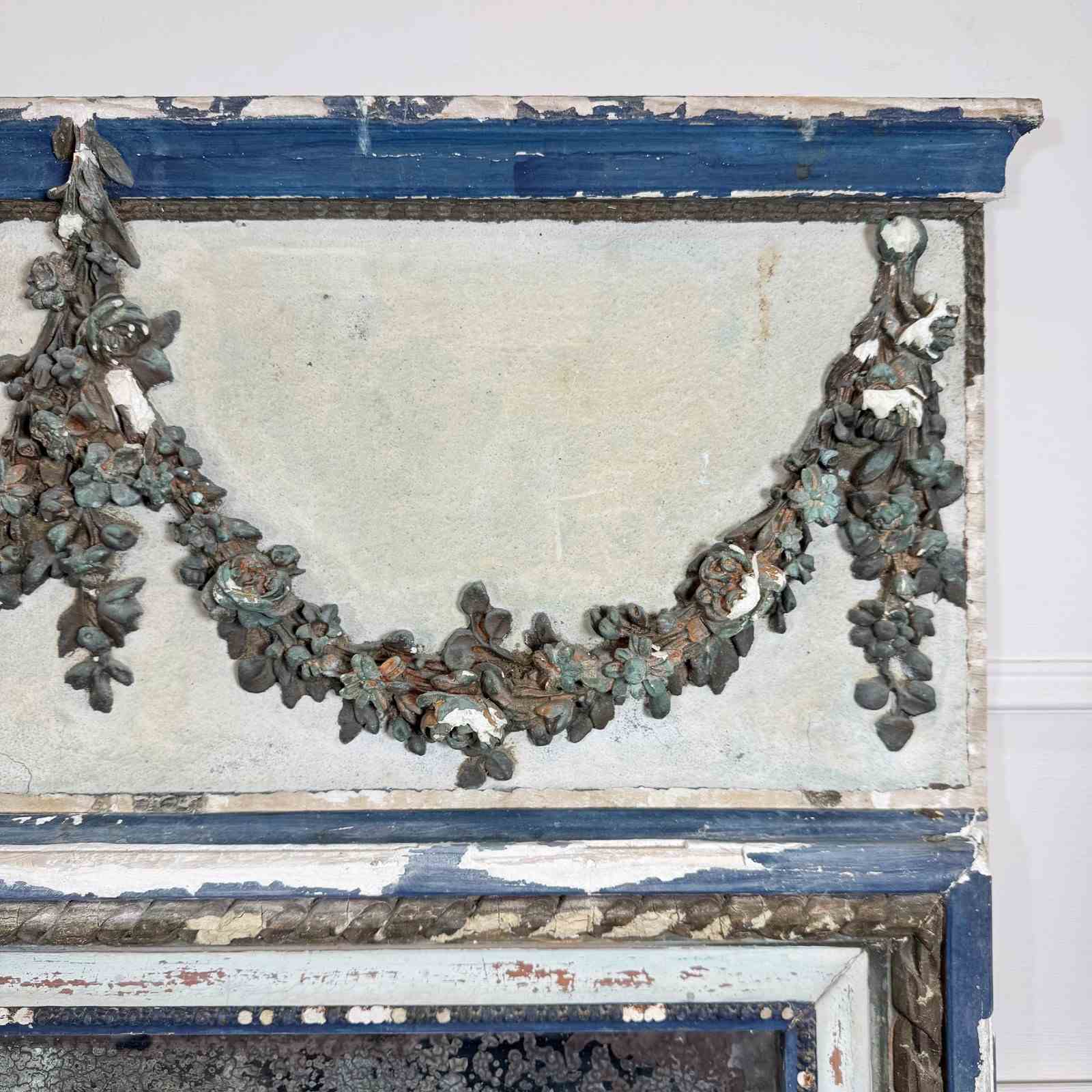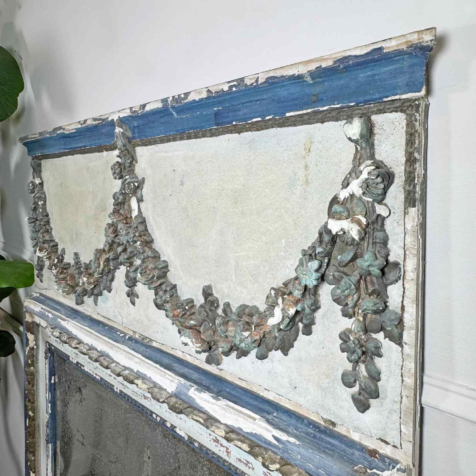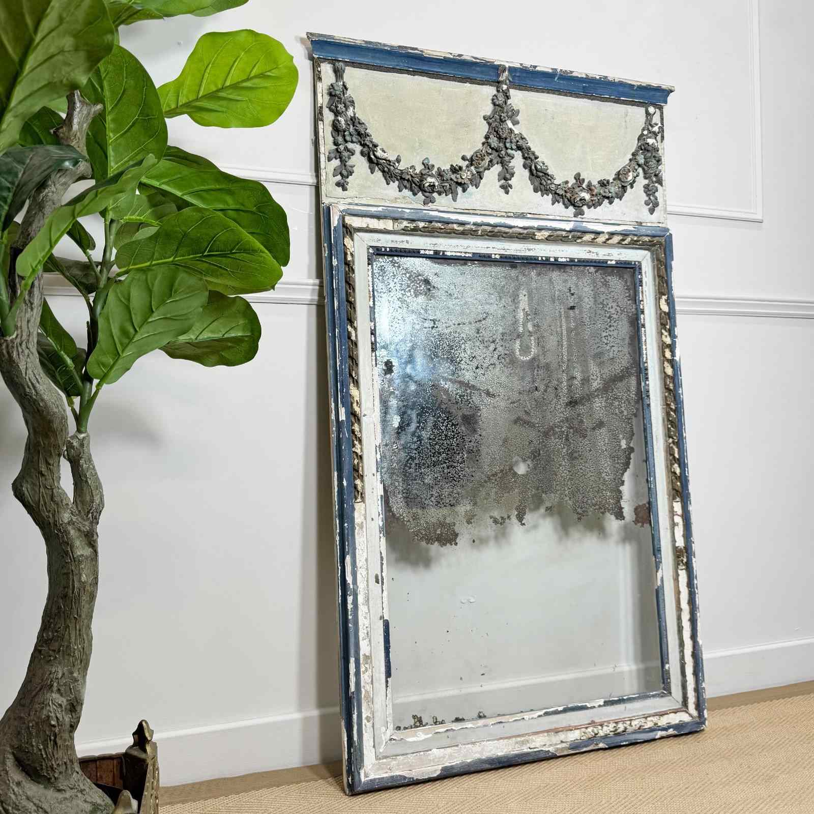 A beautiful gilt gesso wall mirror, most likely was originally a mirrored central panel, the gesso floral swags and raised beaded edge clearly and wonderfully time worn, areas of lost gesso, incredible foxing to the mercury mirrored plate, completely worn away to the bottom. Truly a decorators dream, in aged blue and white paint, with flourishes of gilt throughout, looks like it has been lifted straight out of an 18th century chateau, (which it was), gorgeous!