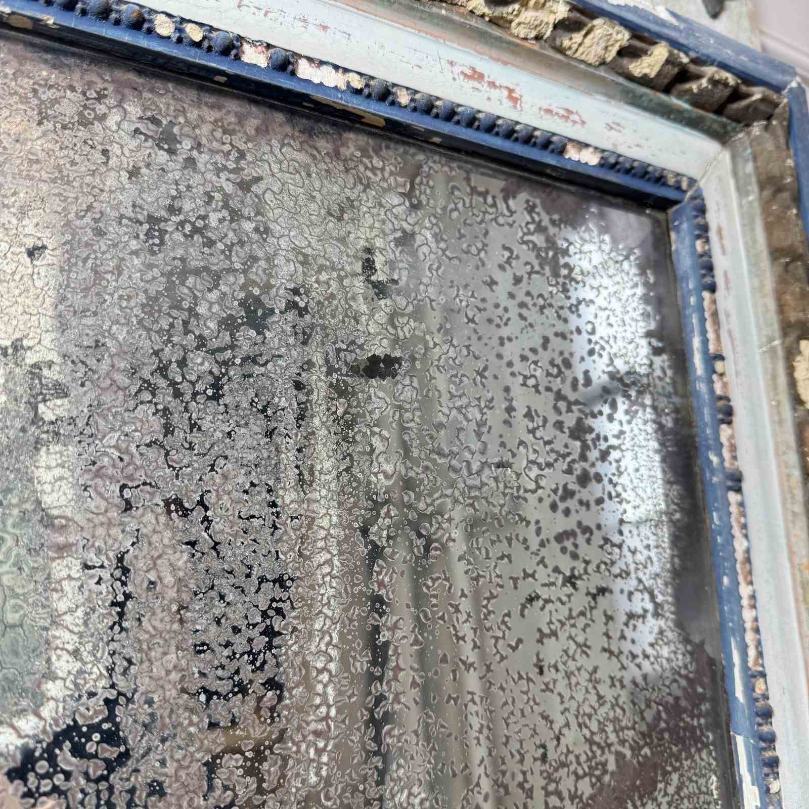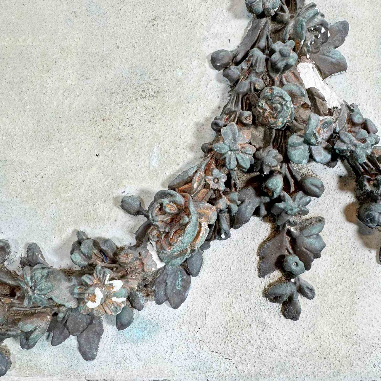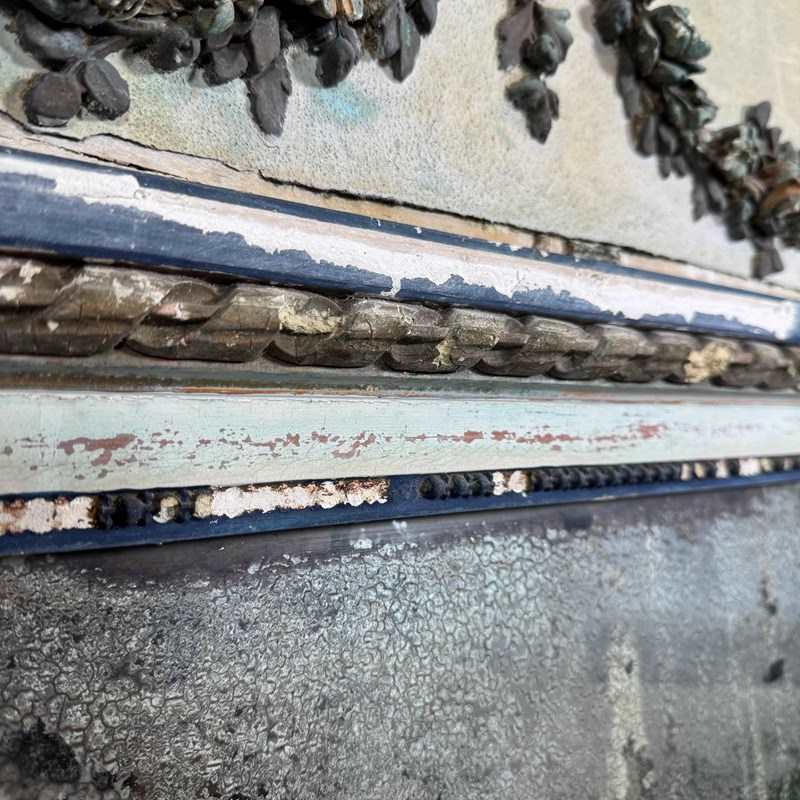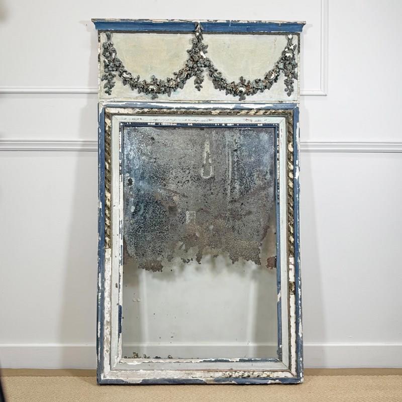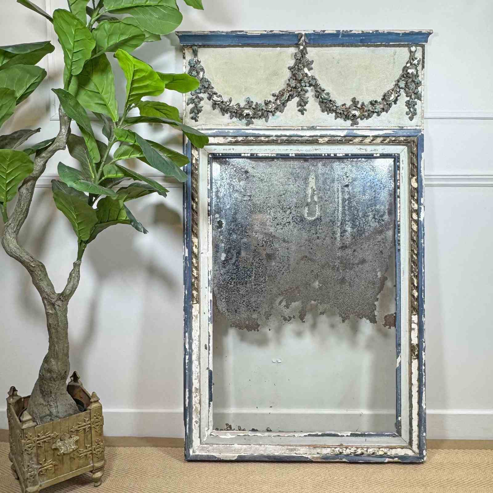 A beautiful gilt gesso wall mirror, most likely was originally a mirrored central panel, the gesso floral swags and raised beaded edge clearly and wonderfully time worn, areas of lost gesso, incredible foxing to the mercury mirrored plate, completely worn away to the bottom. Truly a decorators dream, in aged blue and white paint, with flourishes of gilt throughout, looks like it has been lifted straight out of an 18th century chateau, (which it was), gorgeous!