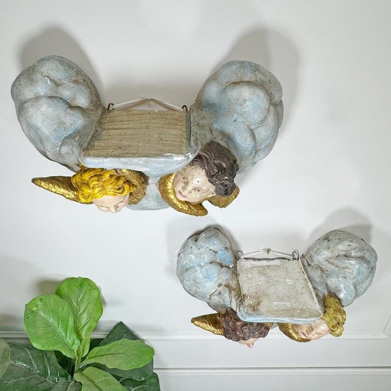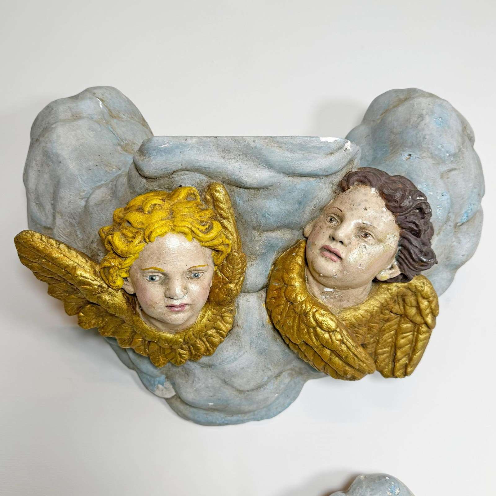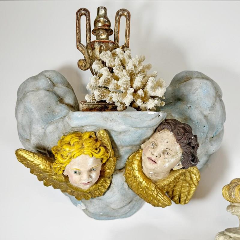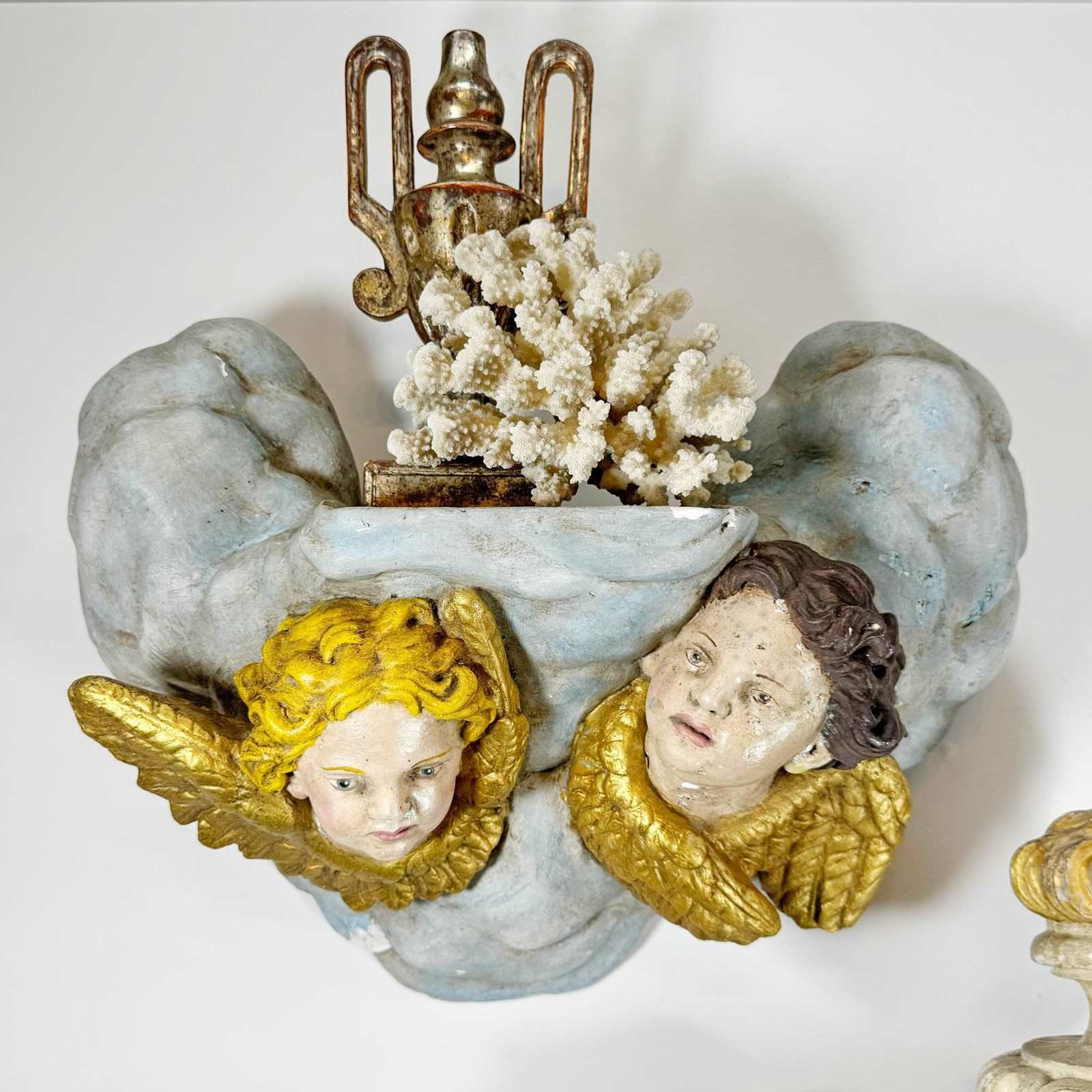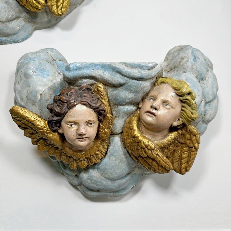 Stunningly detailed Italian plaster wall shelves, formed as two winged putto / cherubs sat amongst clouds, with a fine gesso overlay and beautifully hand painted, originally from a church to hold a santo or religious statue.