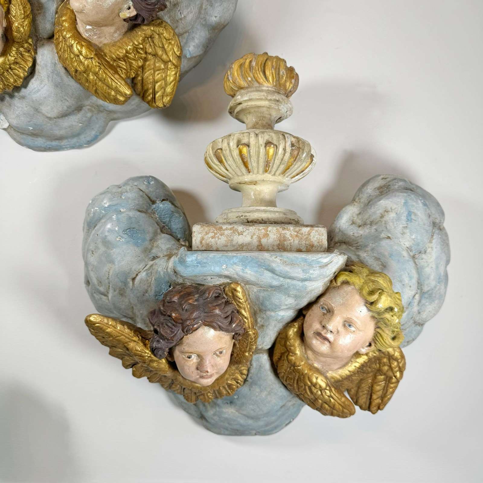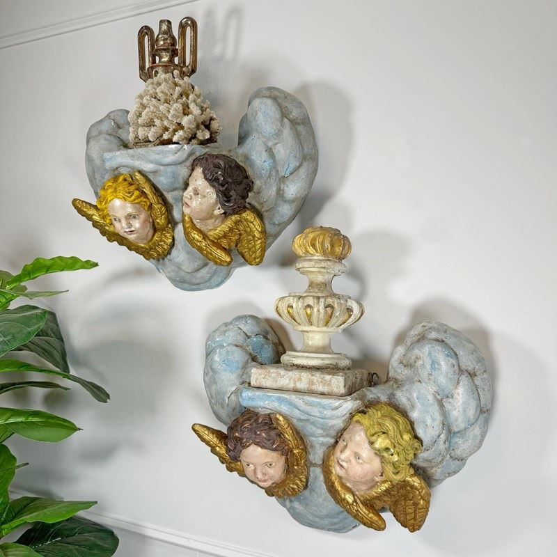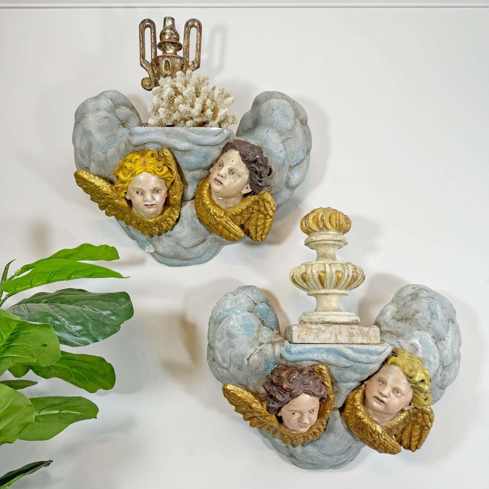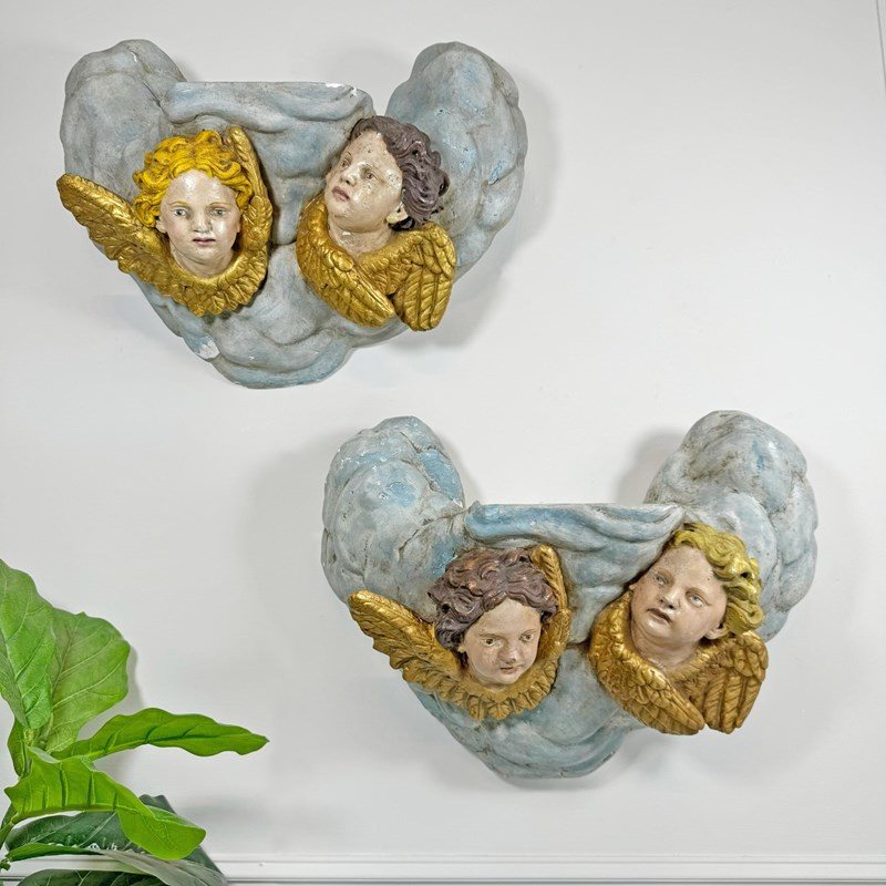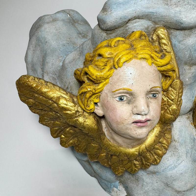 Stunningly detailed Italian plaster wall shelves, formed as two winged putto / cherubs sat amongst clouds, with a fine gesso overlay and beautifully hand painted, originally from a church to hold a santo or religious statue.