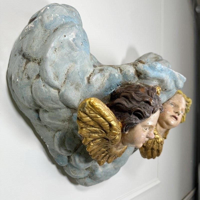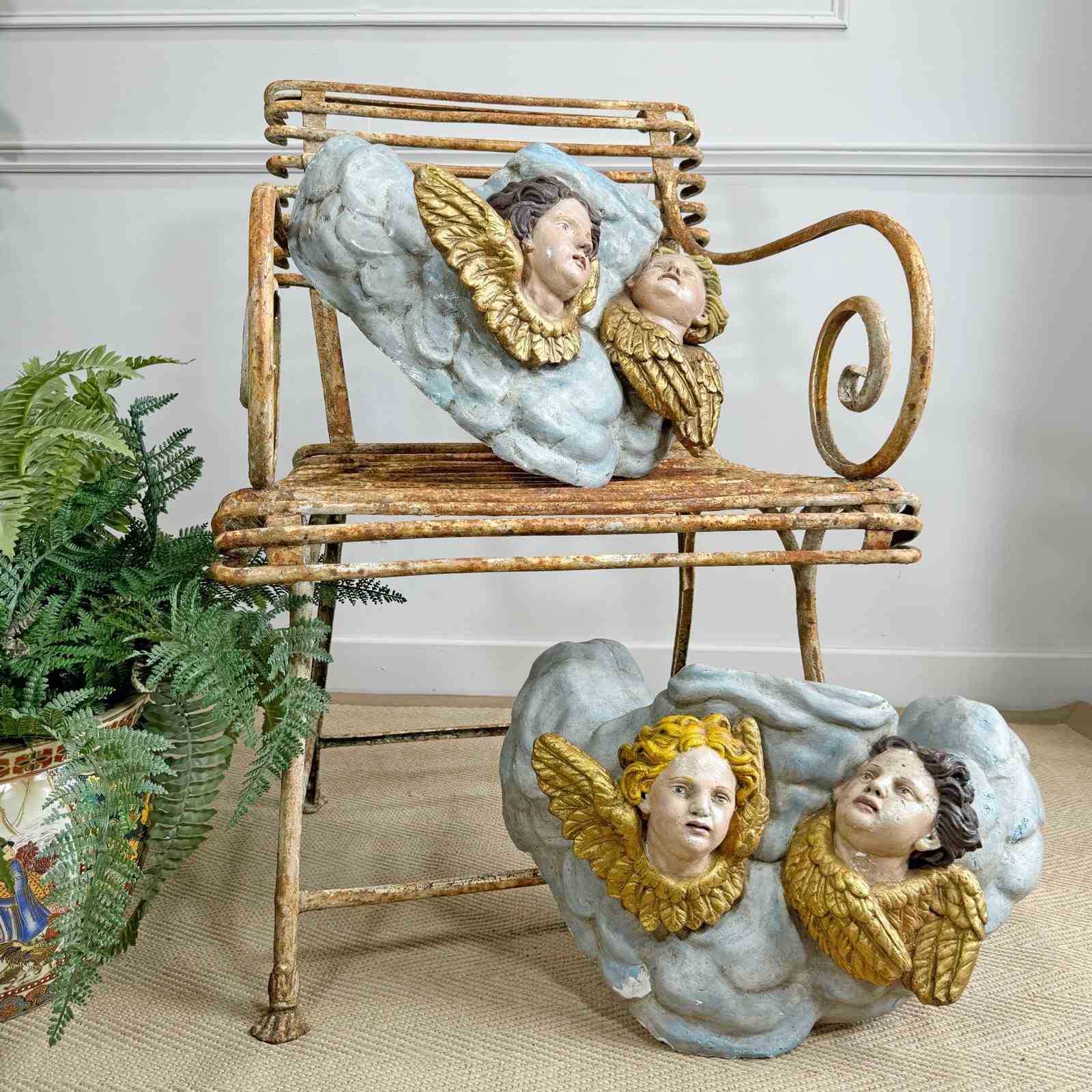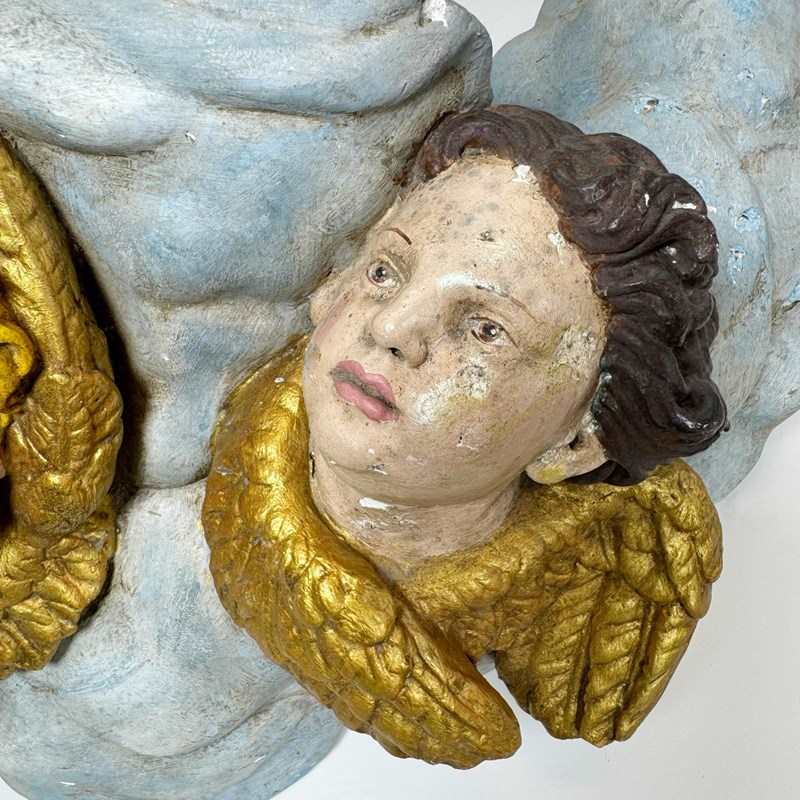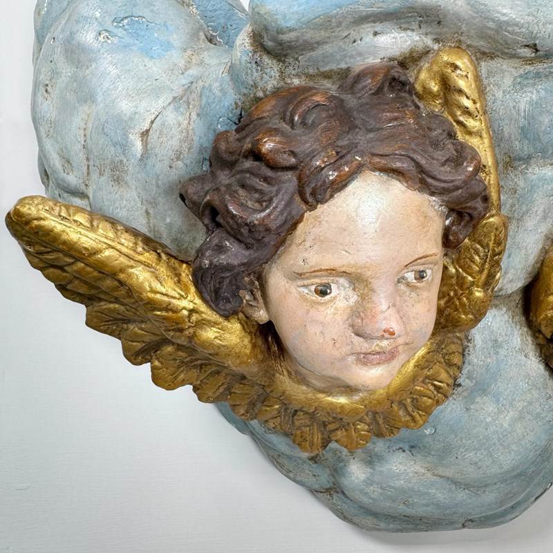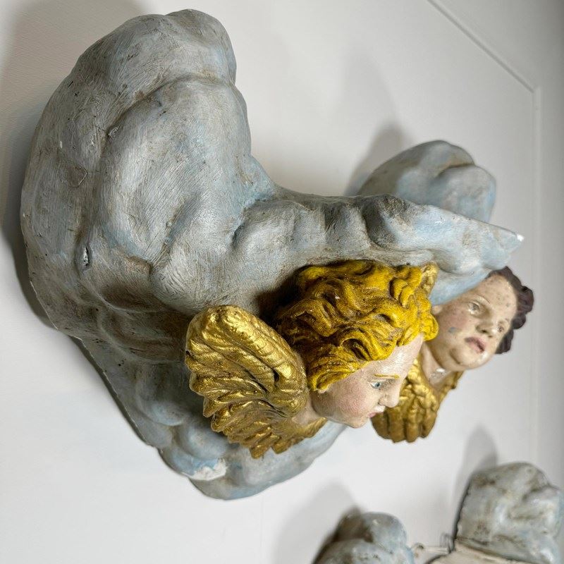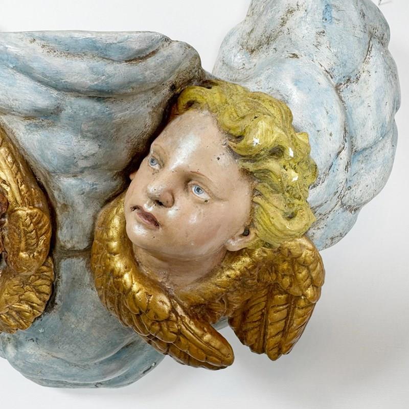 Stunningly detailed Italian plaster wall shelves, formed as two winged putto / cherubs sat amongst clouds, with a fine gesso overlay and beautifully hand painted, originally from a church to hold a santo or religious statue.