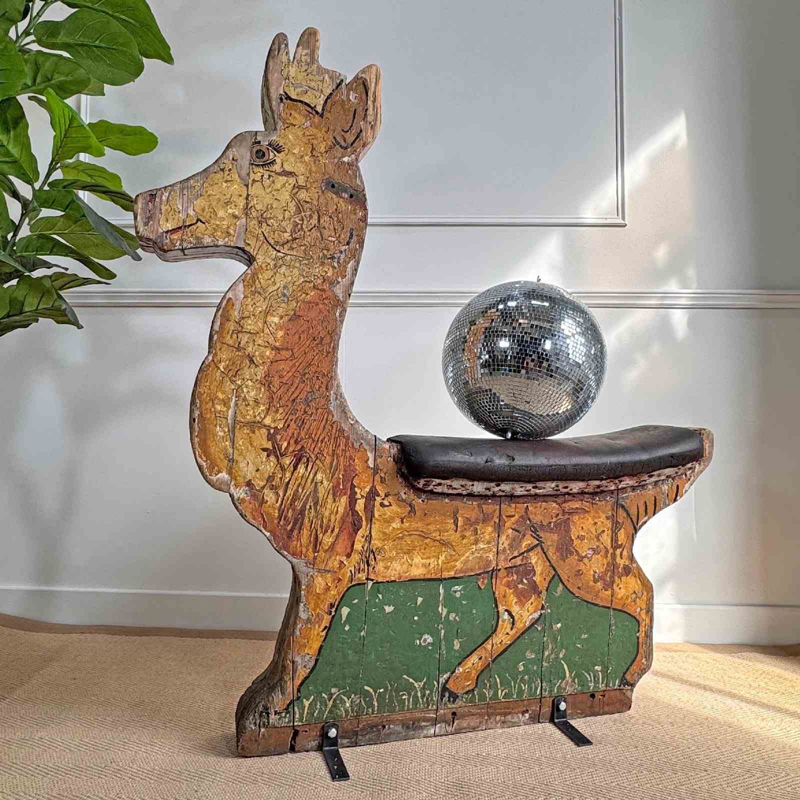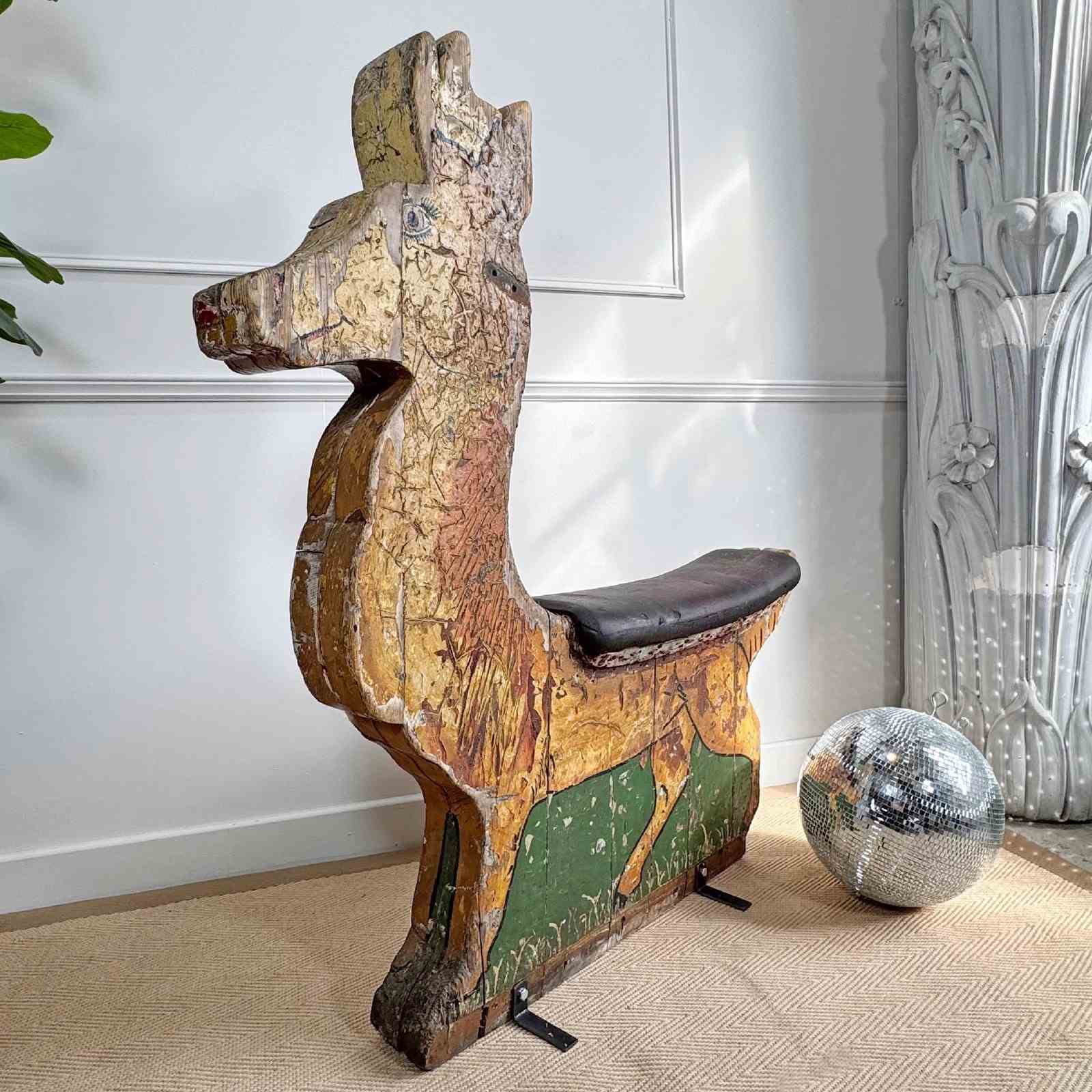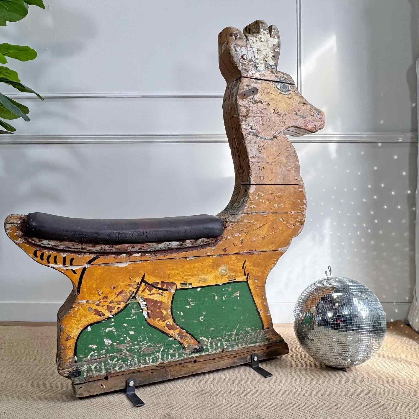 Large 1930's Antique English fairground wooden Reindeer carousel ride. Wonderful aged patina, two sided original paint. Faux leather padded seat. Has been fitted with cast iron brackets so it can stand freely.