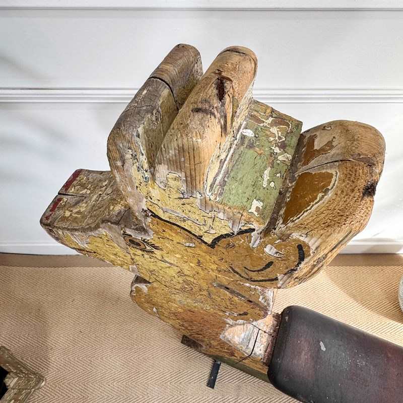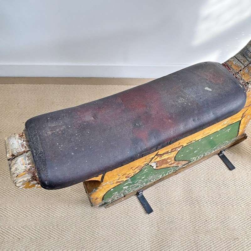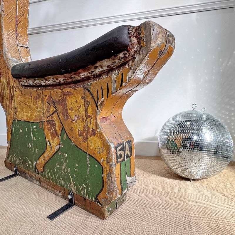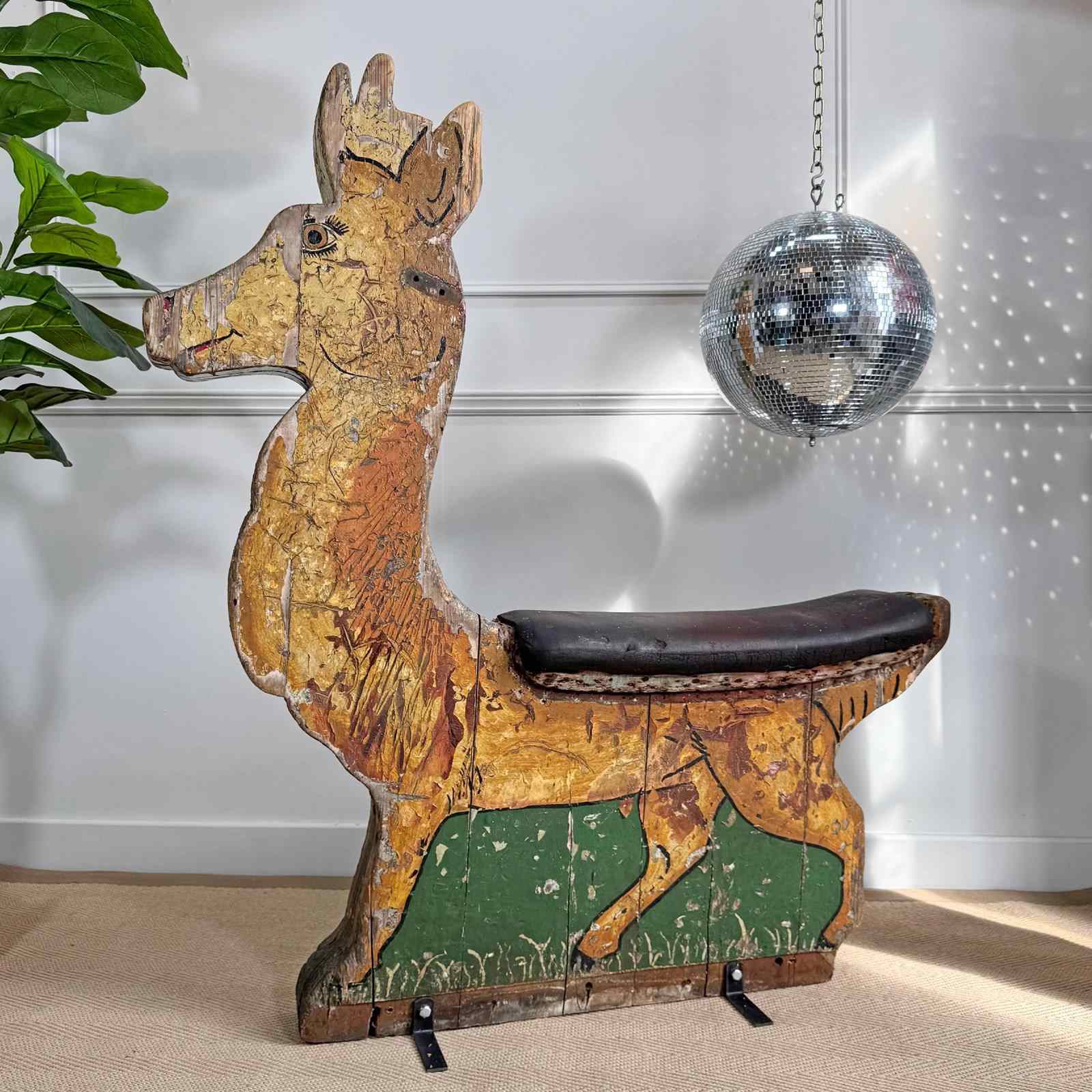Large 1930's Antique English fairground wooden Reindeer carousel ride. Wonderful aged patina, two sided original paint. Faux leather padded seat. Has been fitted with cast iron brackets so it can stand freely.