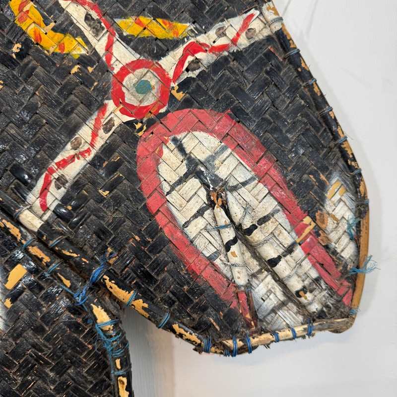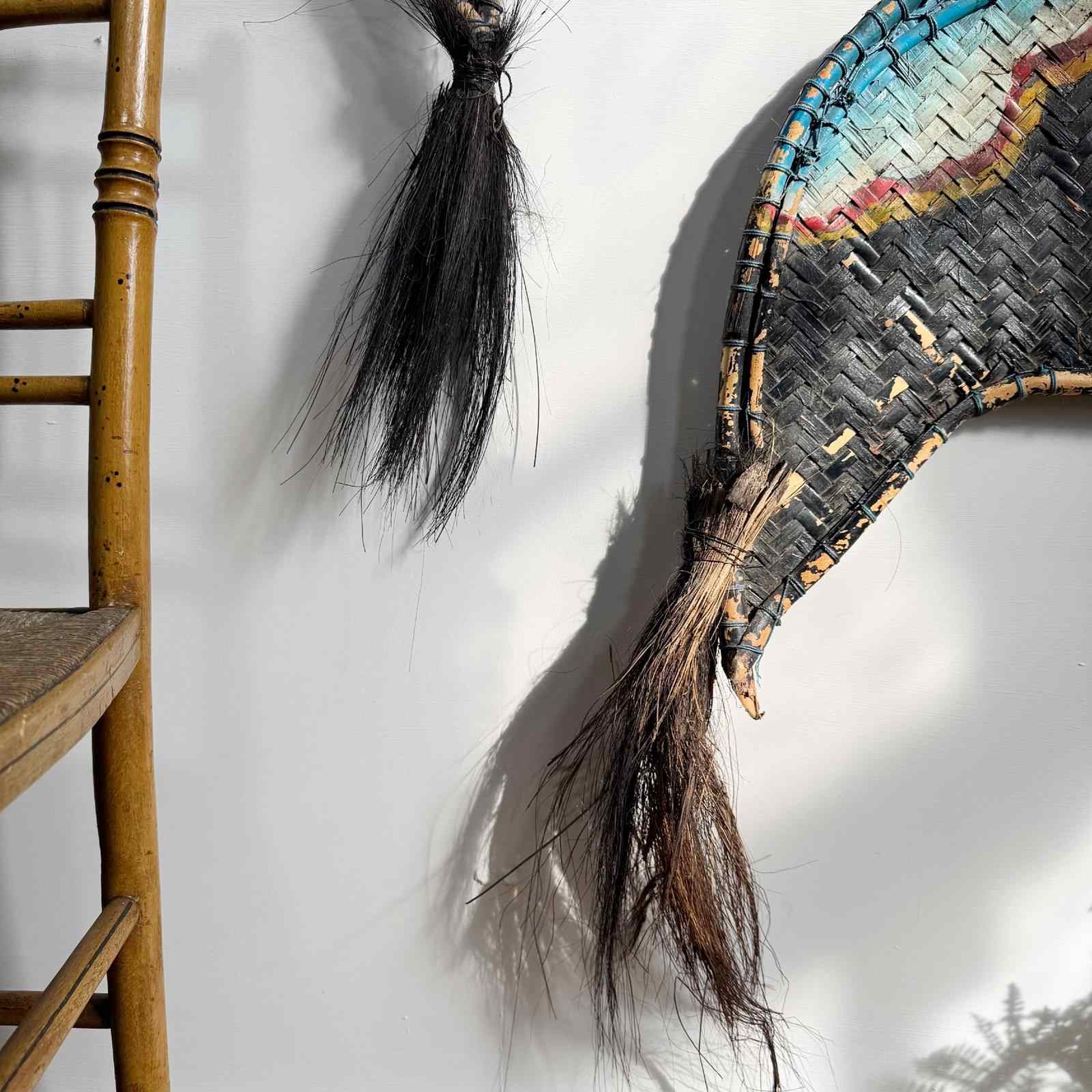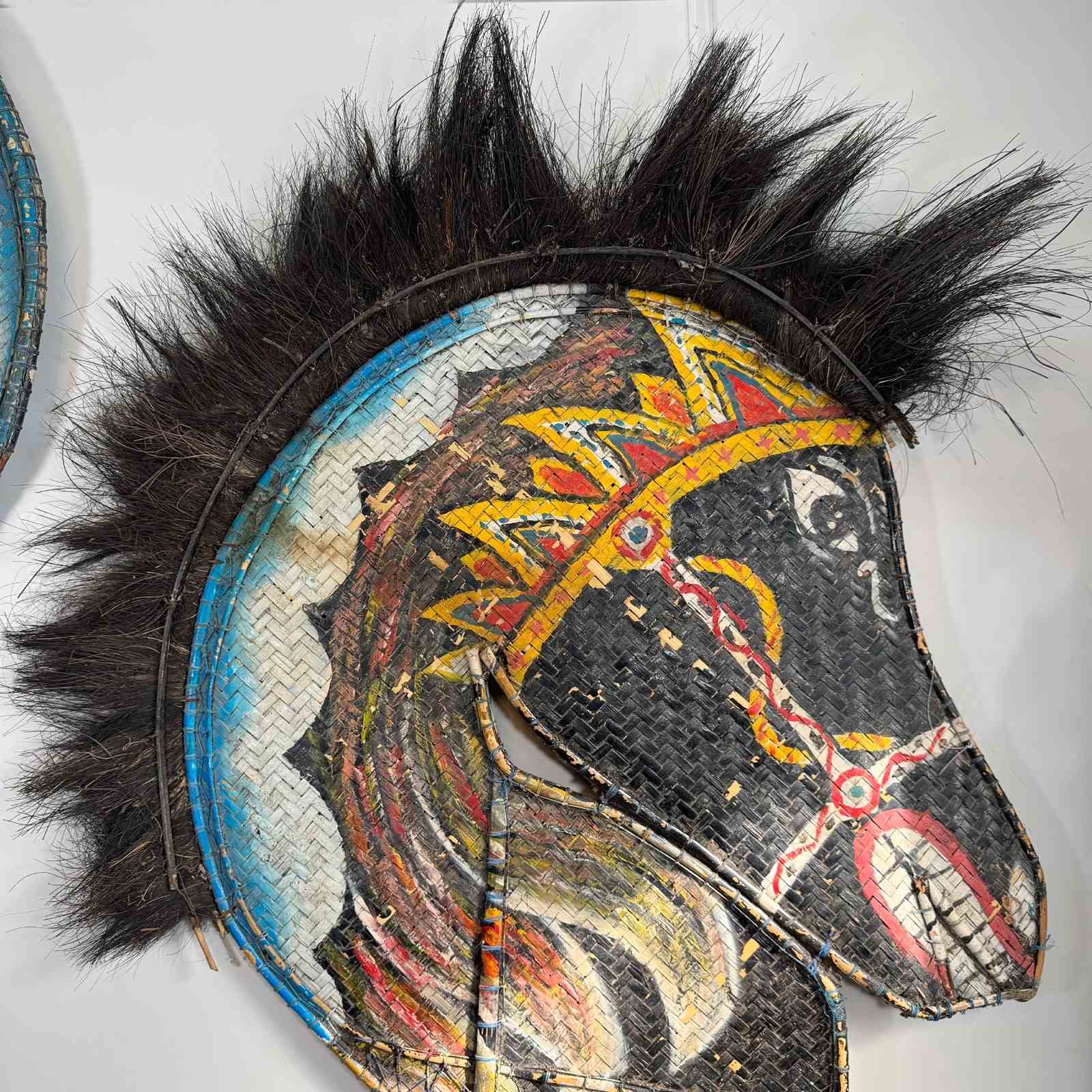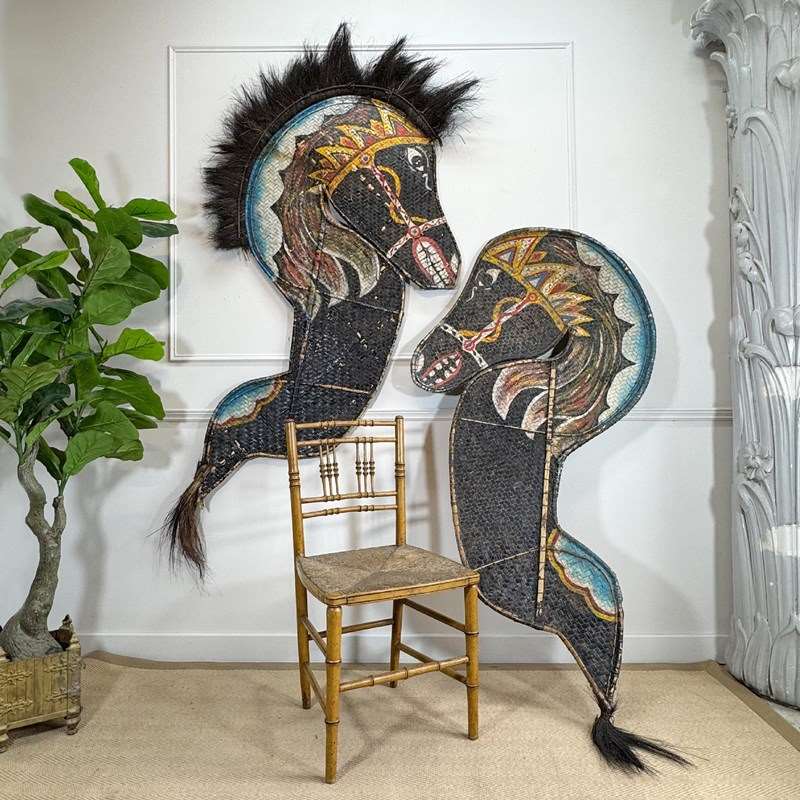 These two enormous horses are hand crafted from rattan, bamboo, natural grass and hair, and each side of the horse is individually hand decorated. Please note we also have a pair of smaller Kuda Lumping Horses for sale on another listing.