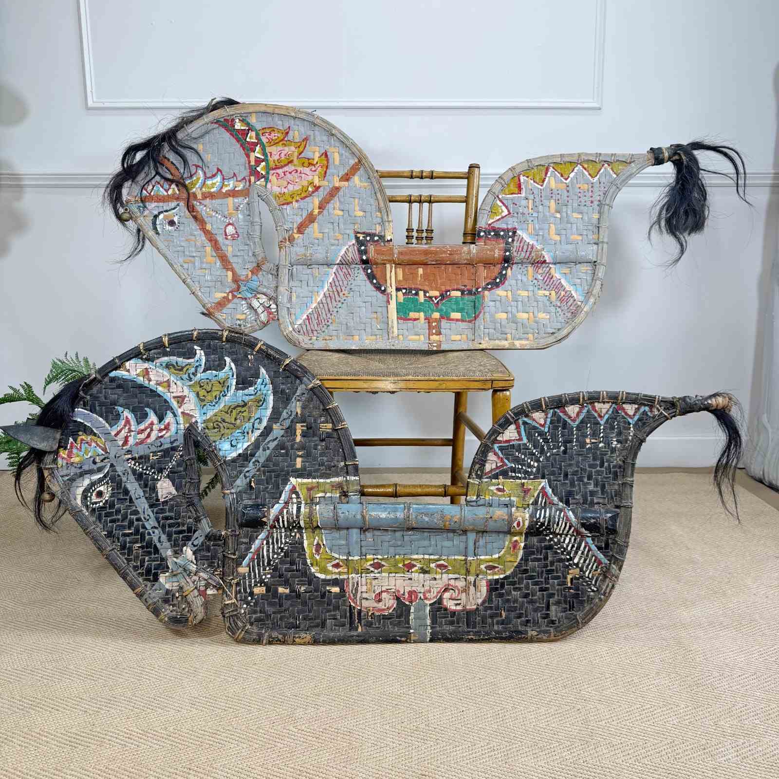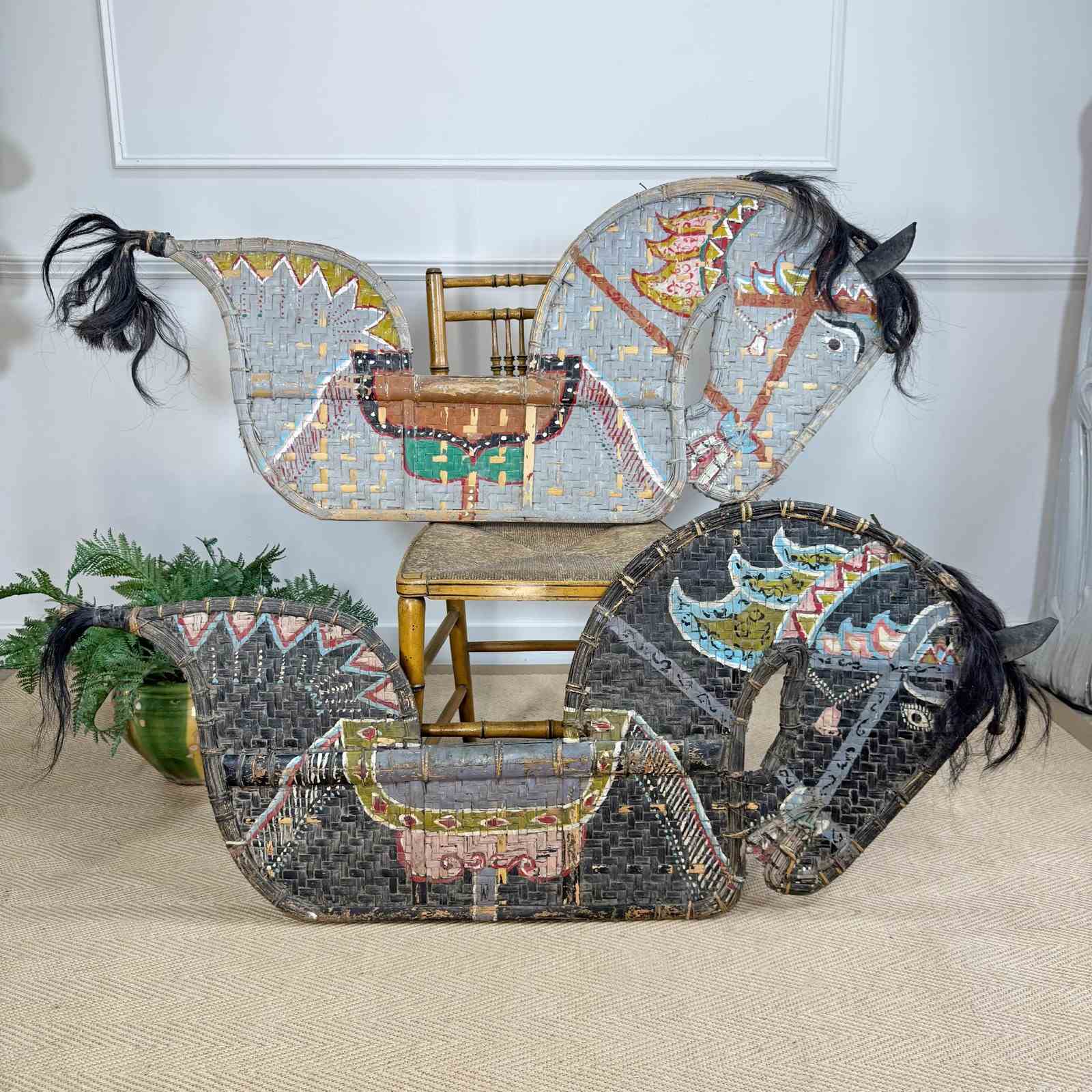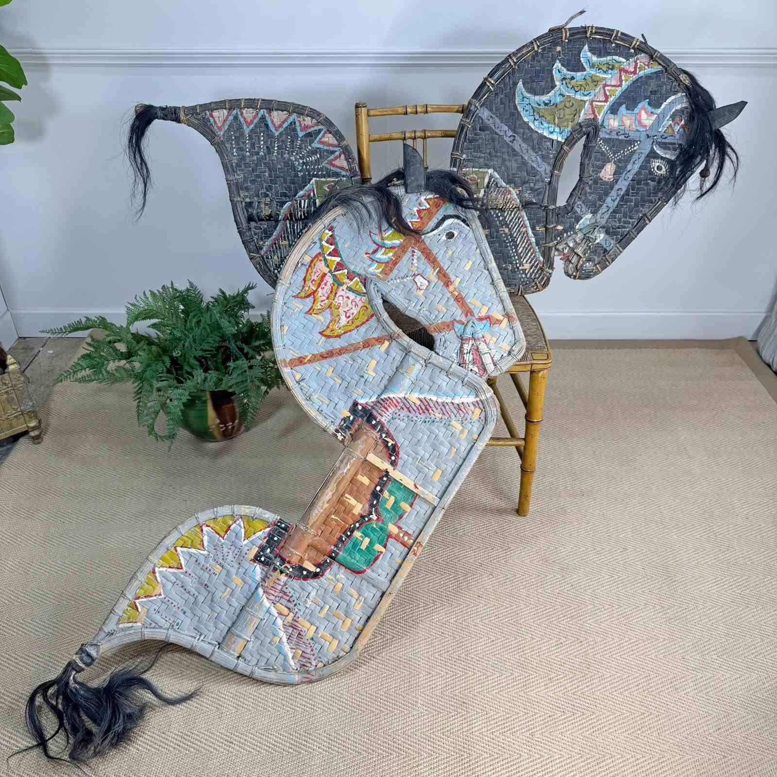 A stunning and ornate pair of circa 1950 Kuda Lumping painted ceremonial horses, hand crafted these beautiful horses have been used for over a century in the Javanese Kuda Lumping dances, the dancers perform using rattan horses, generally colourful and decorated with beads and sequins. Adults use larger horses than children. Children's horses may also be cut from bamboo mats. Performers wear colorful clothes and may occasionally dress as soldiers. The costume may also include small bells strung around the ankle.
