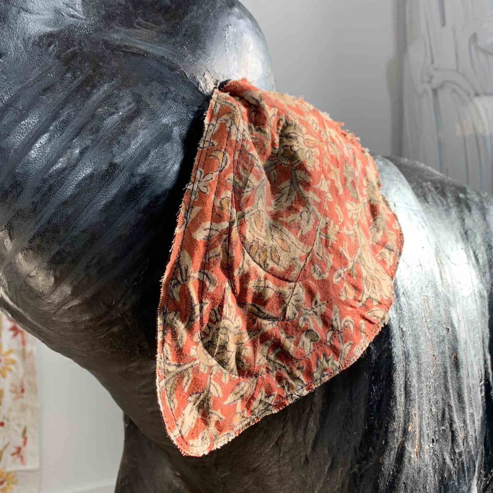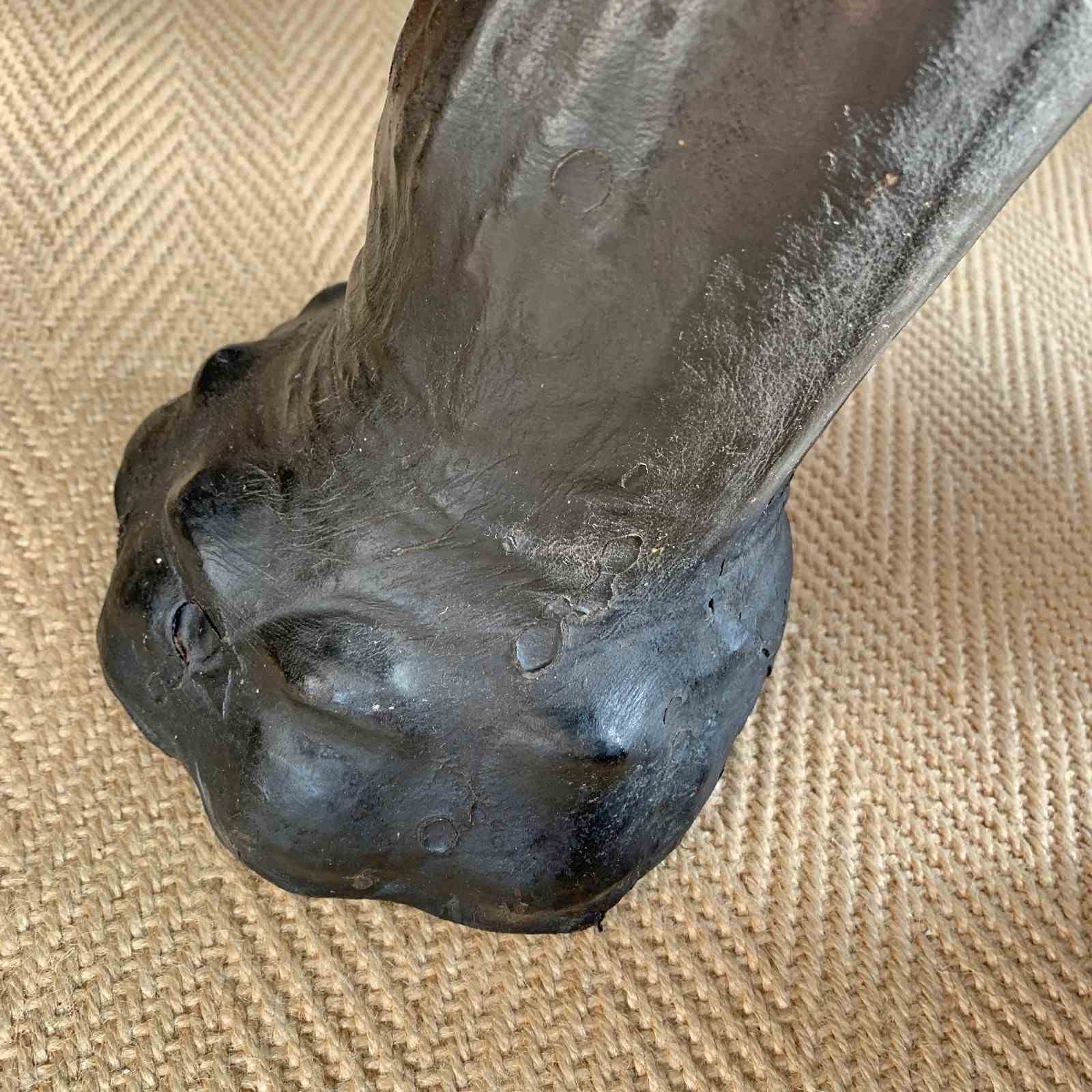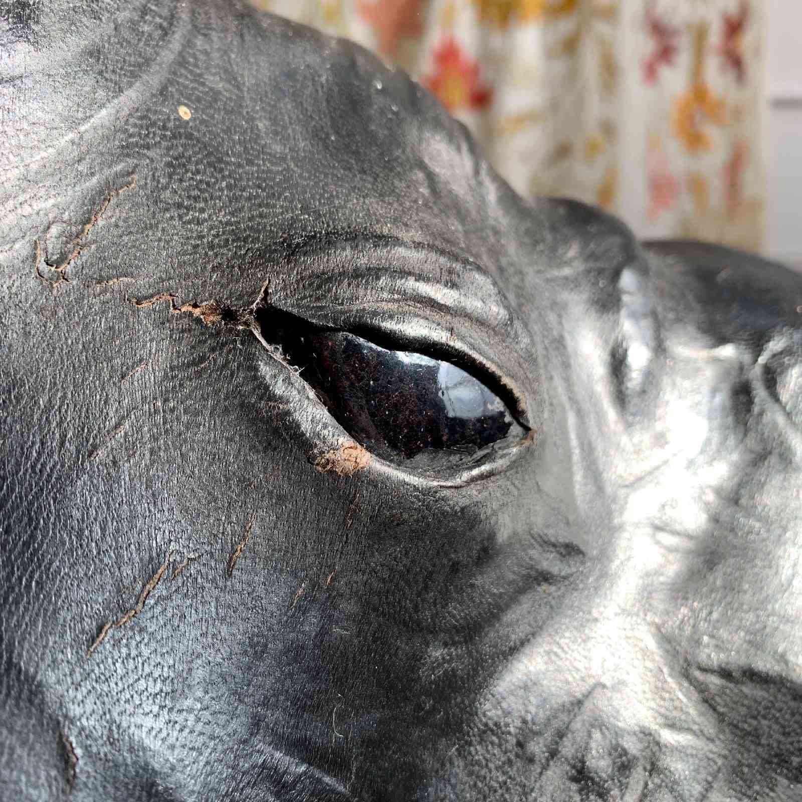 Unlike the smaller foot stools these were made as statement statues, with long wooden tusks, big leather ears (this has vintage fabric inners) and large glass eyes, created for grand entryways or libraries of large residences.