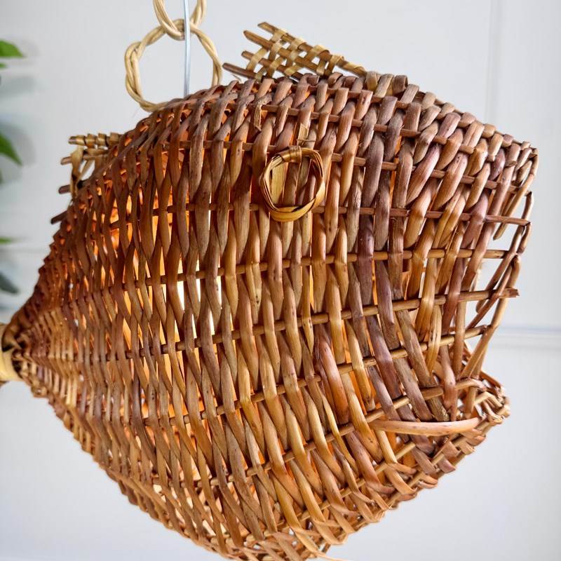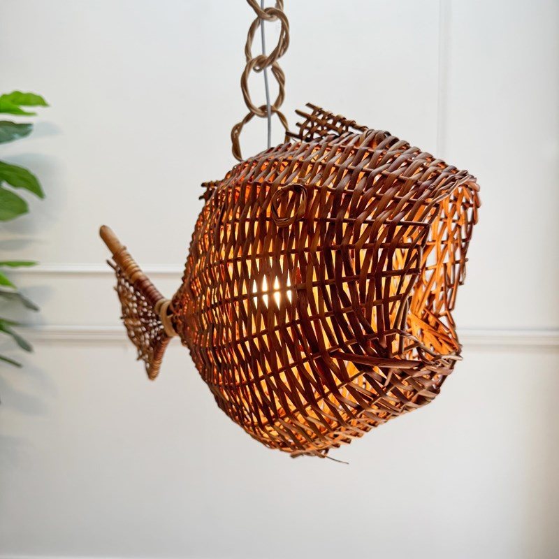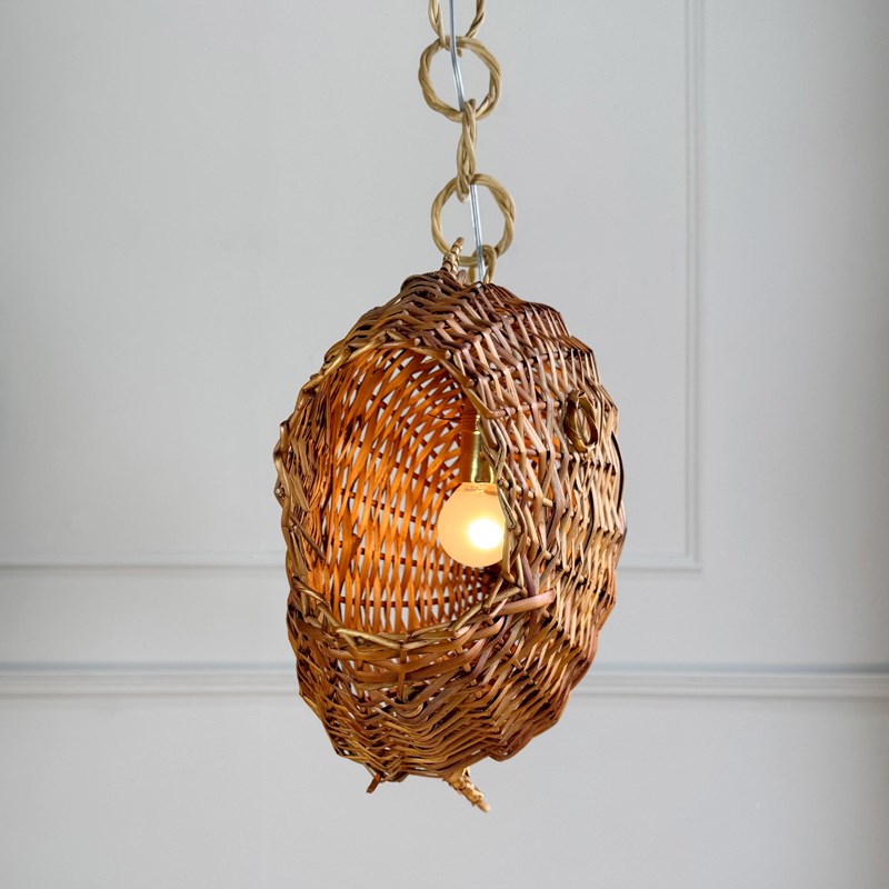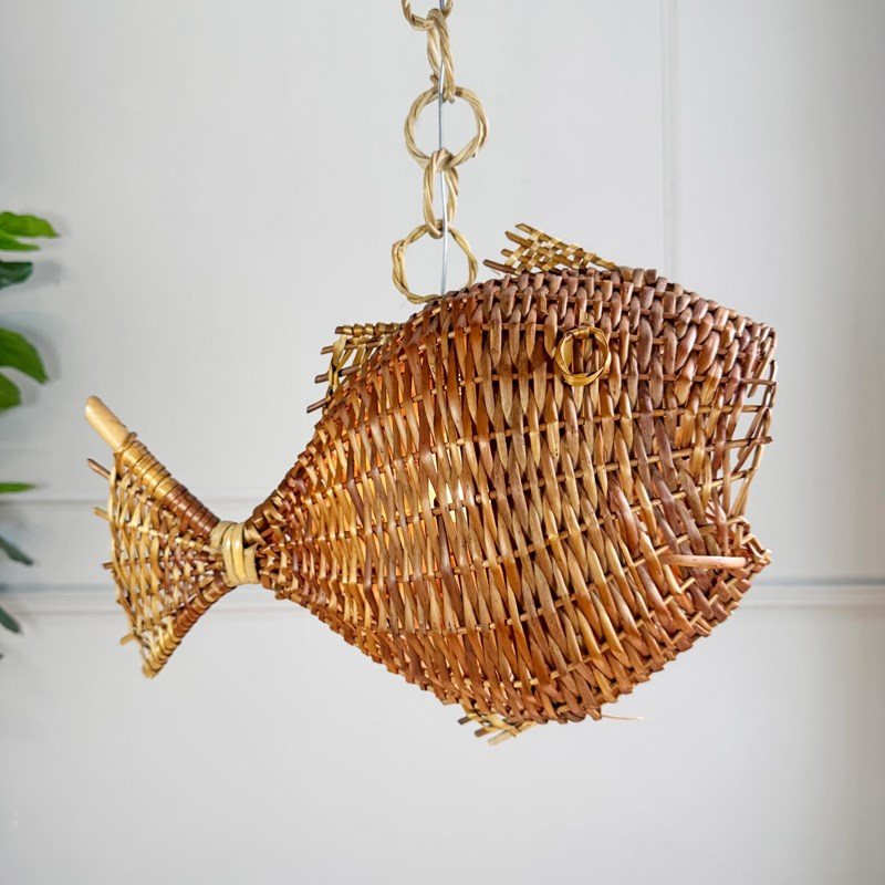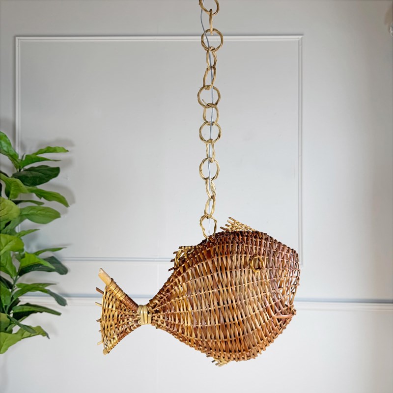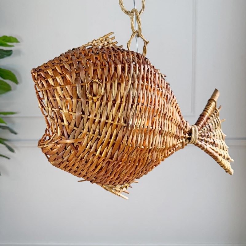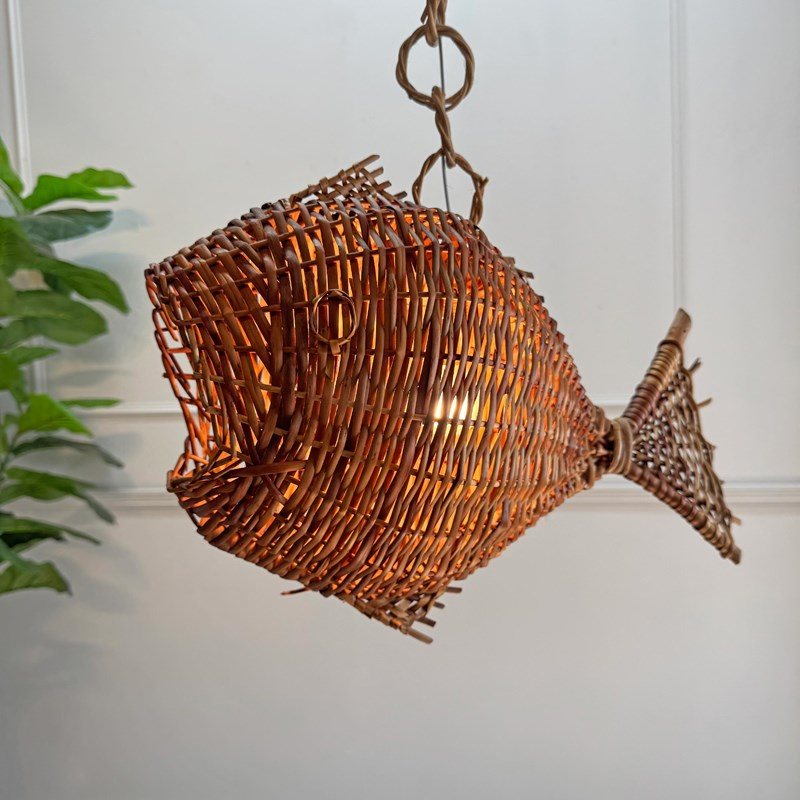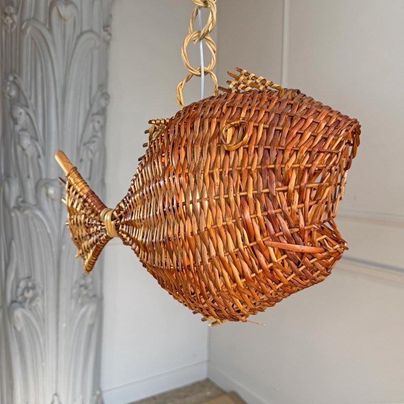 The single e14 (small screw in) Edison lamp holder sits inside the body of the Fish, the light pouring from the mouth and ‘scales’, this light still has its’ original wicker hanging chain.