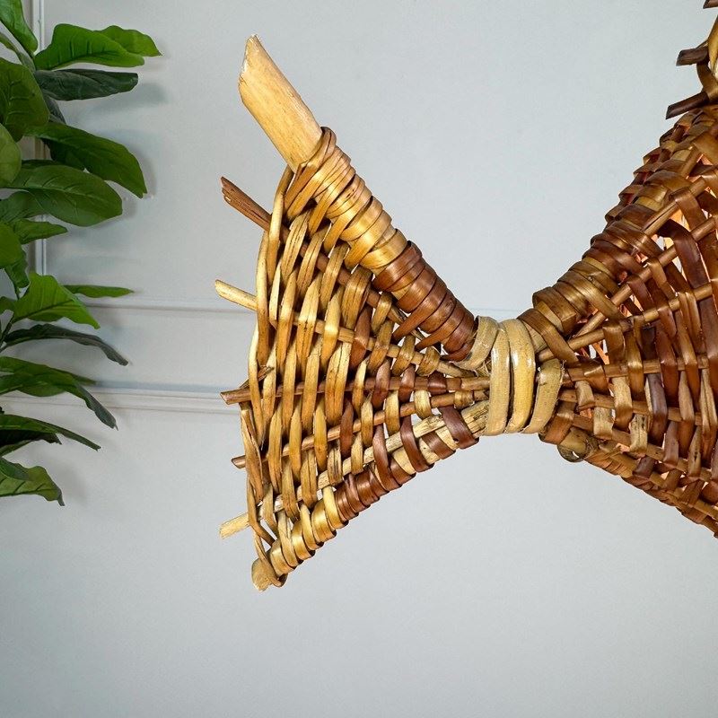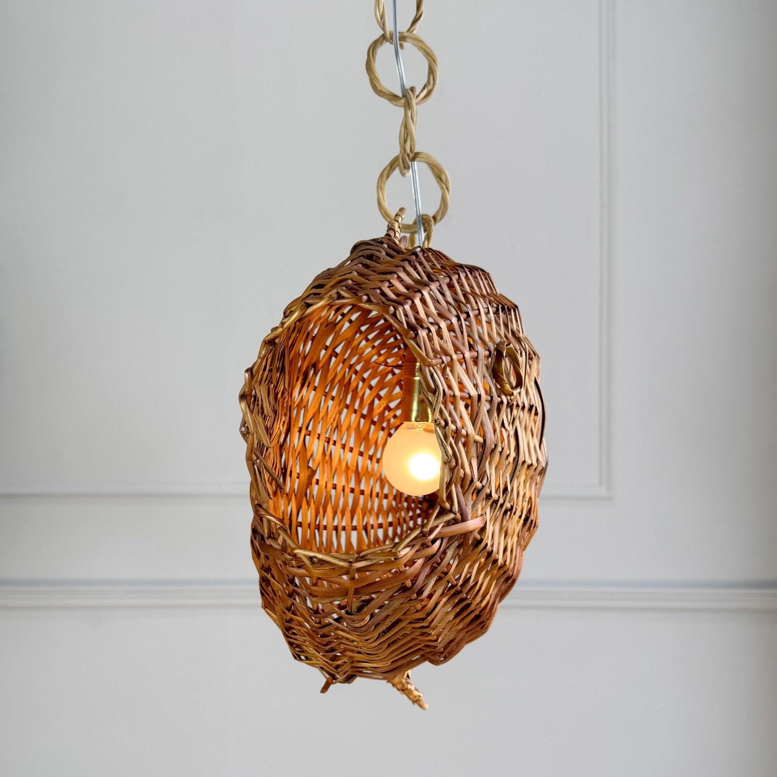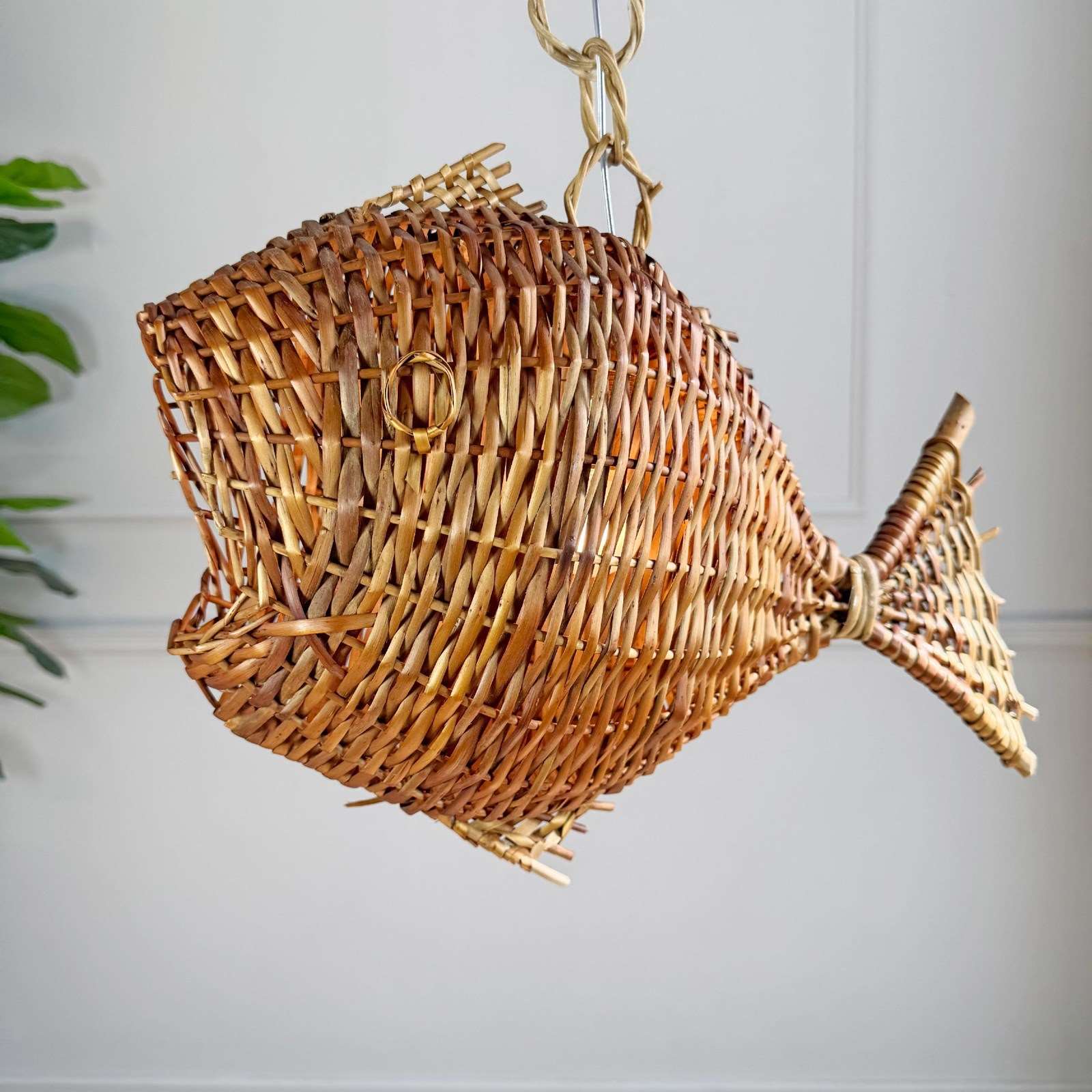 Superb large scale 1950’s wicker fish ceiling light, French. Due to their nature these original ceiling lights are incredibly rare to find from this period and especially in such good condition. We have managed to source 3 of these incredible hand crafted lamps, the other two are available on separate listings.