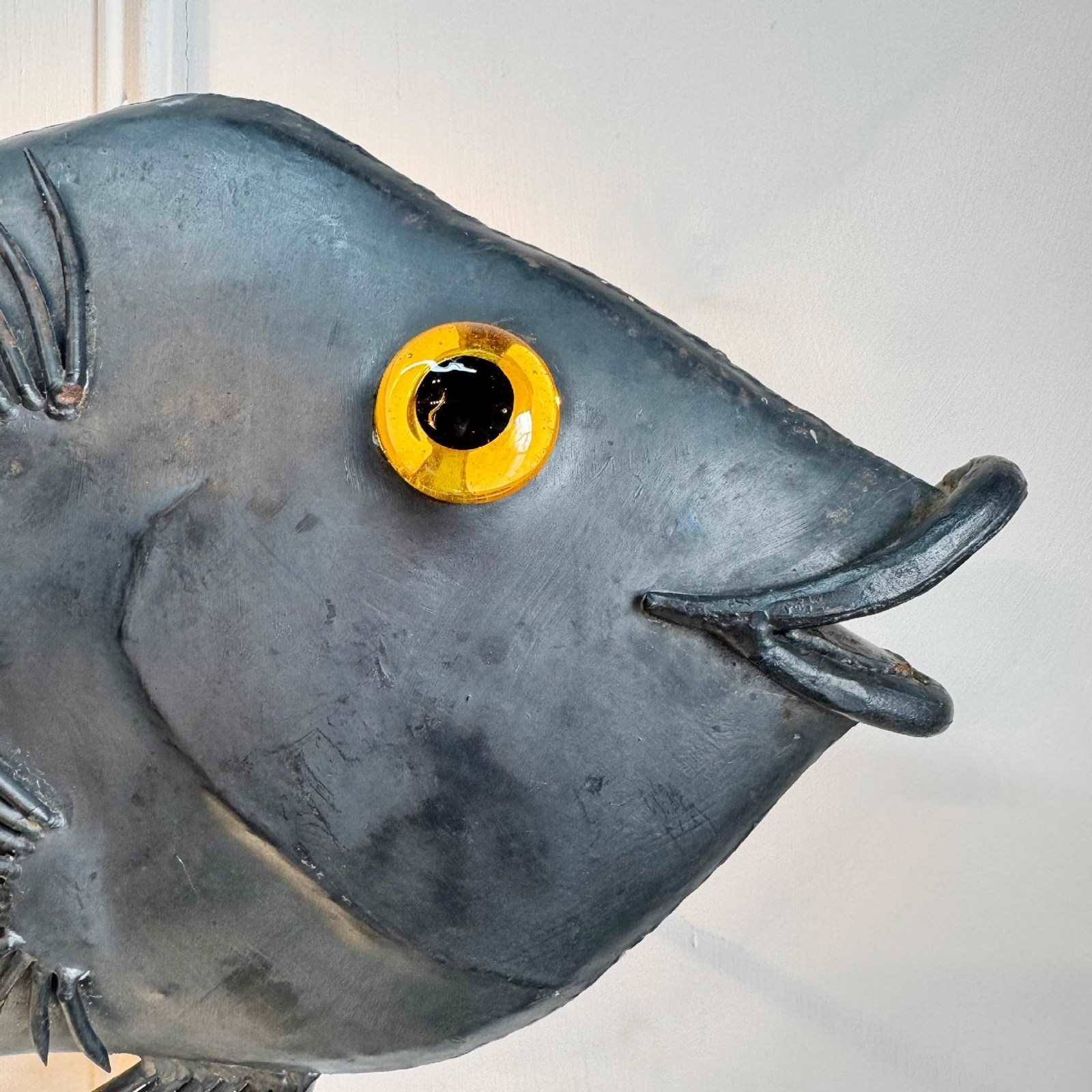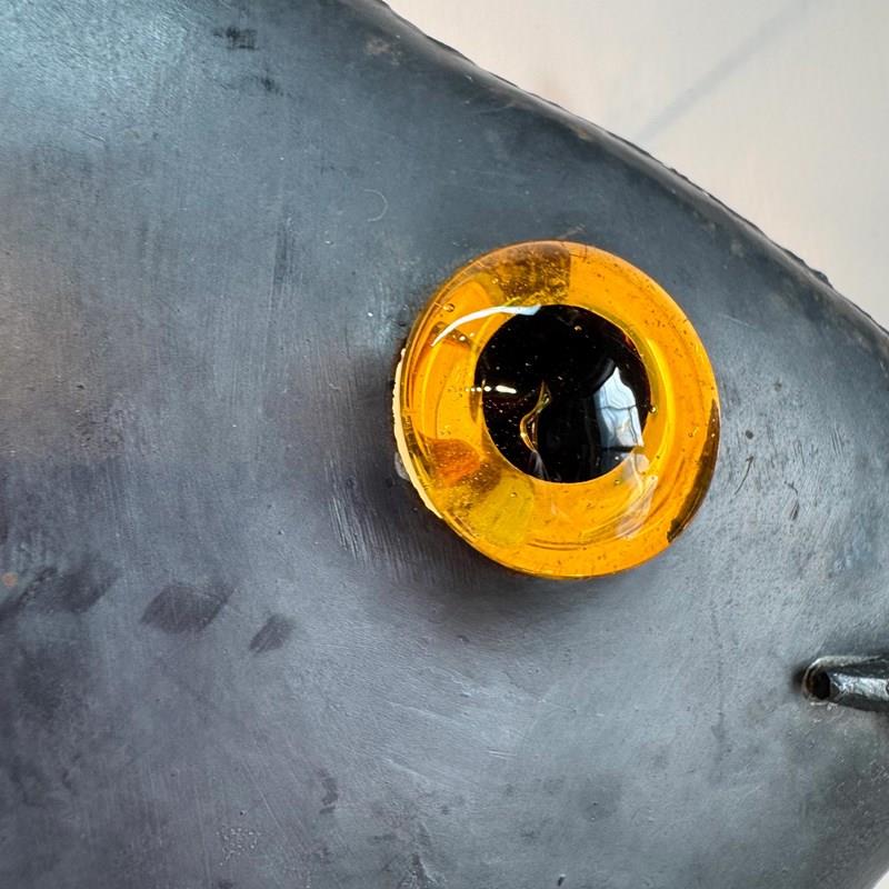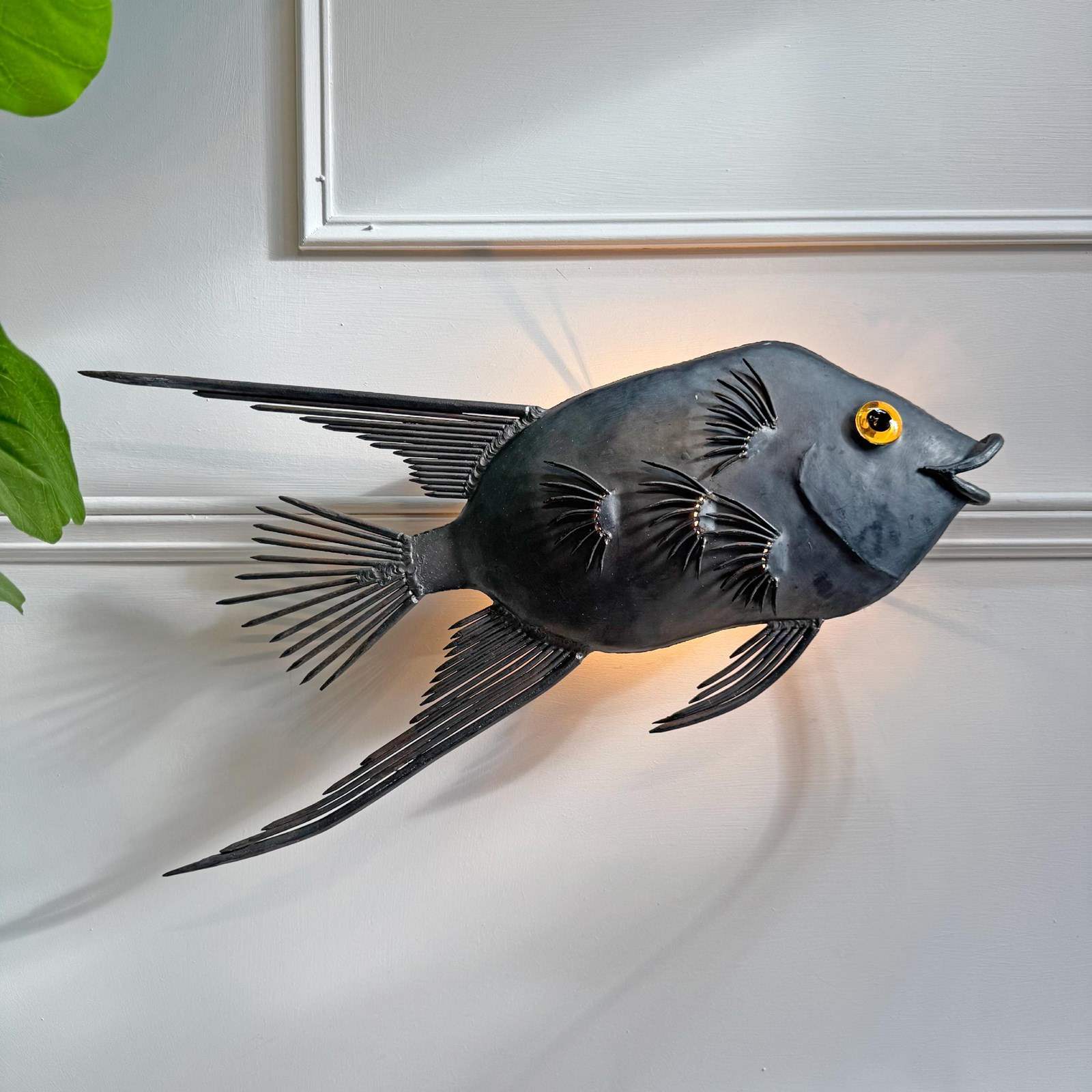 The beautiful dark steel linear fish is fitted with a hand blown amber glass eye, and illuminated from below by a single E14 bulb.
