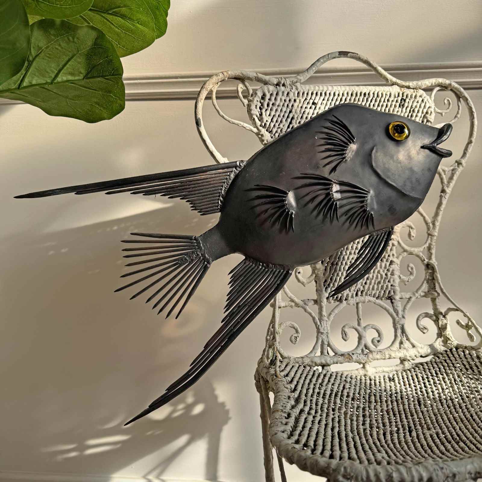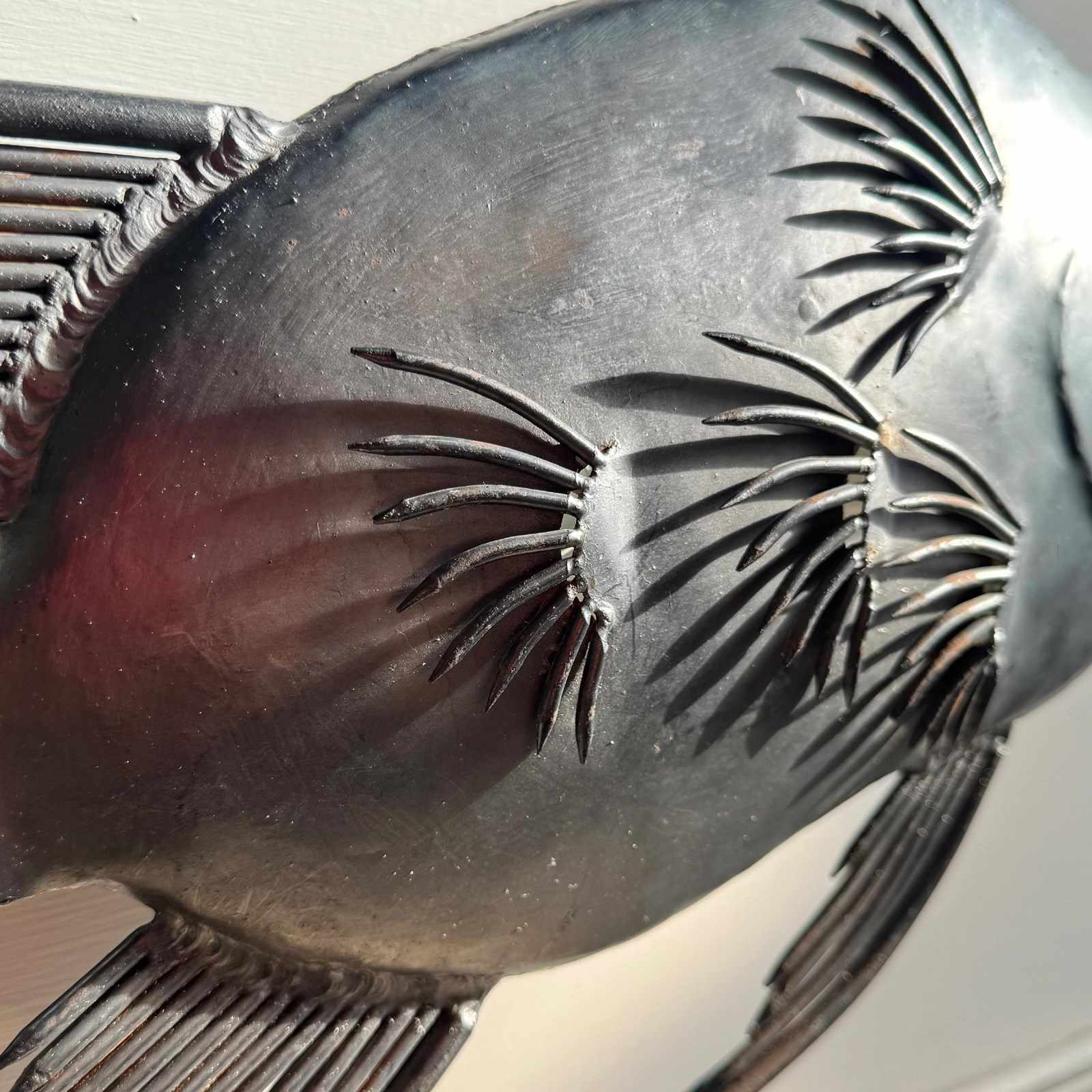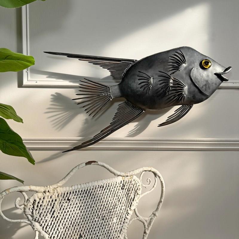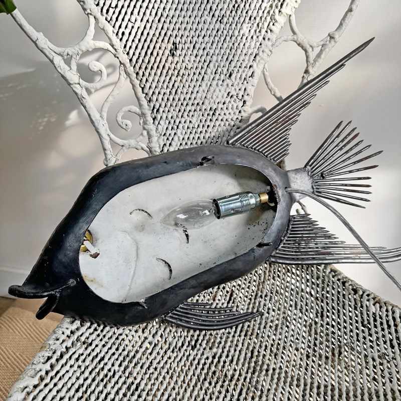 An incredibly rare brutalist illuminated sculpture in steel, hand crafted using nails and steel, modelled as a large tropical fish and dating to the 1950’s.
