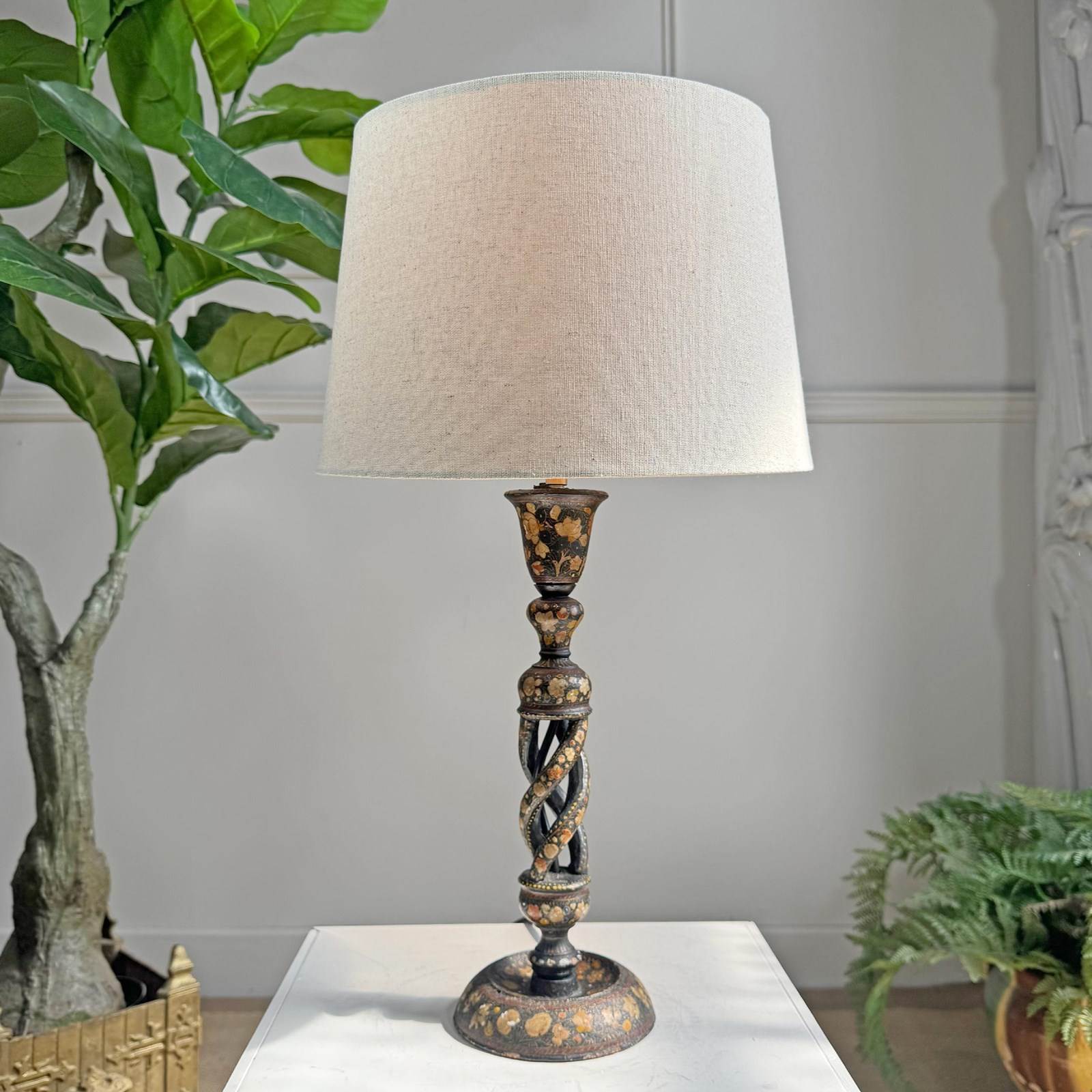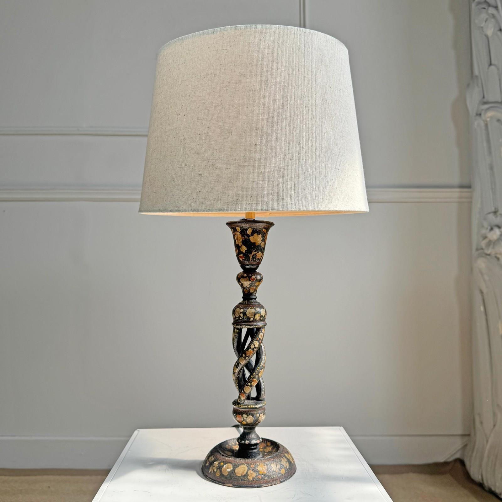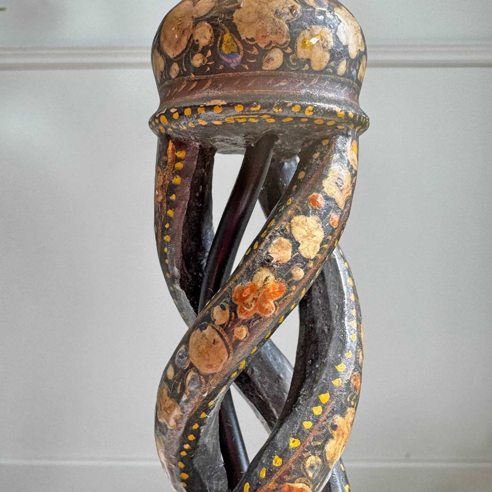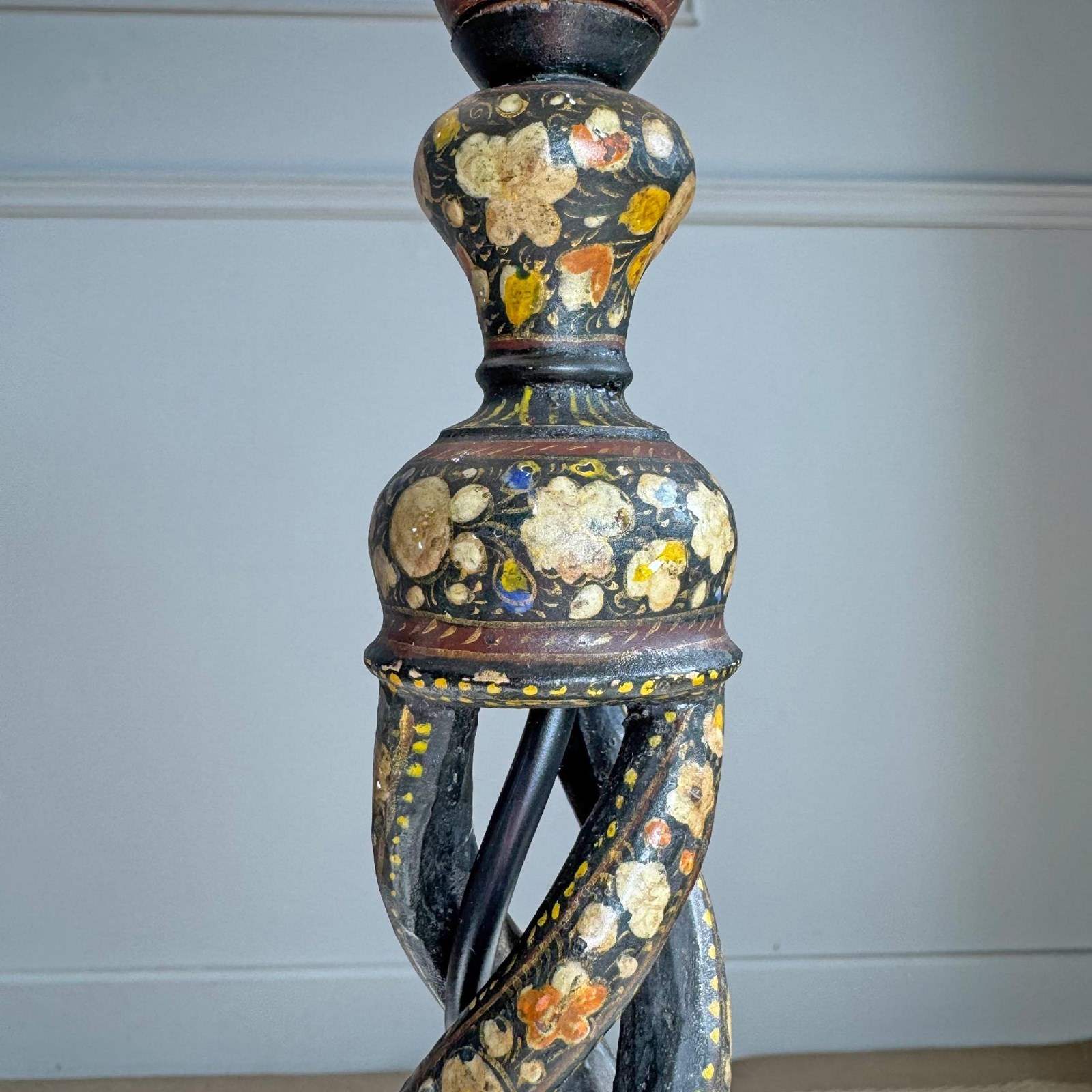 A late 19th century barley twist Kashmiri table lamp (originally a candlestick but now updated as a lamp), with the original intricate hand painted decoration throughout.