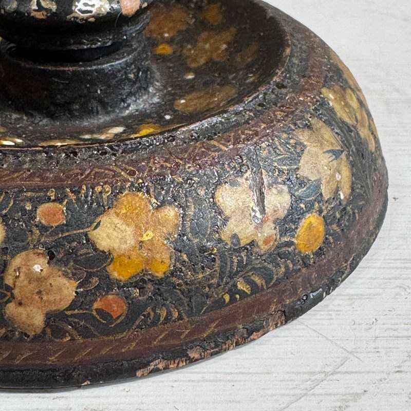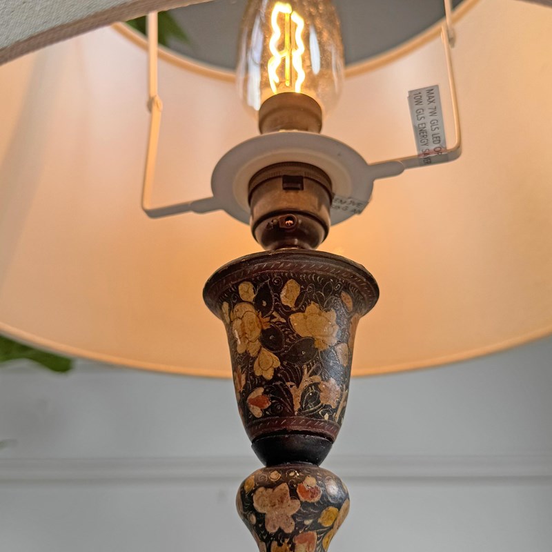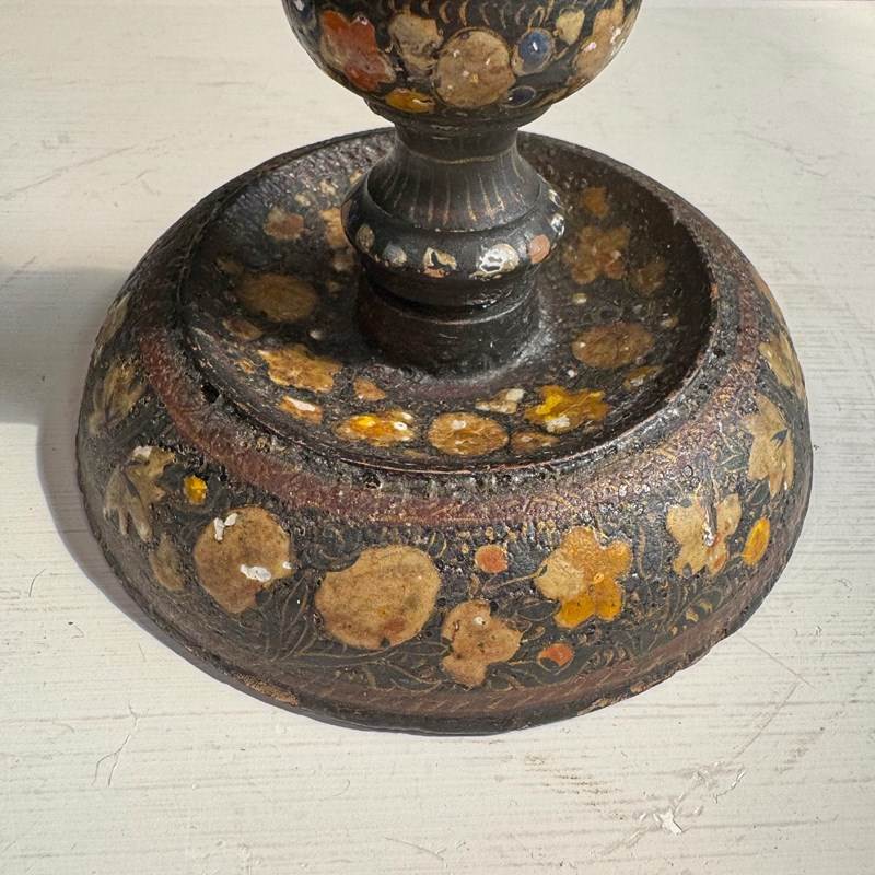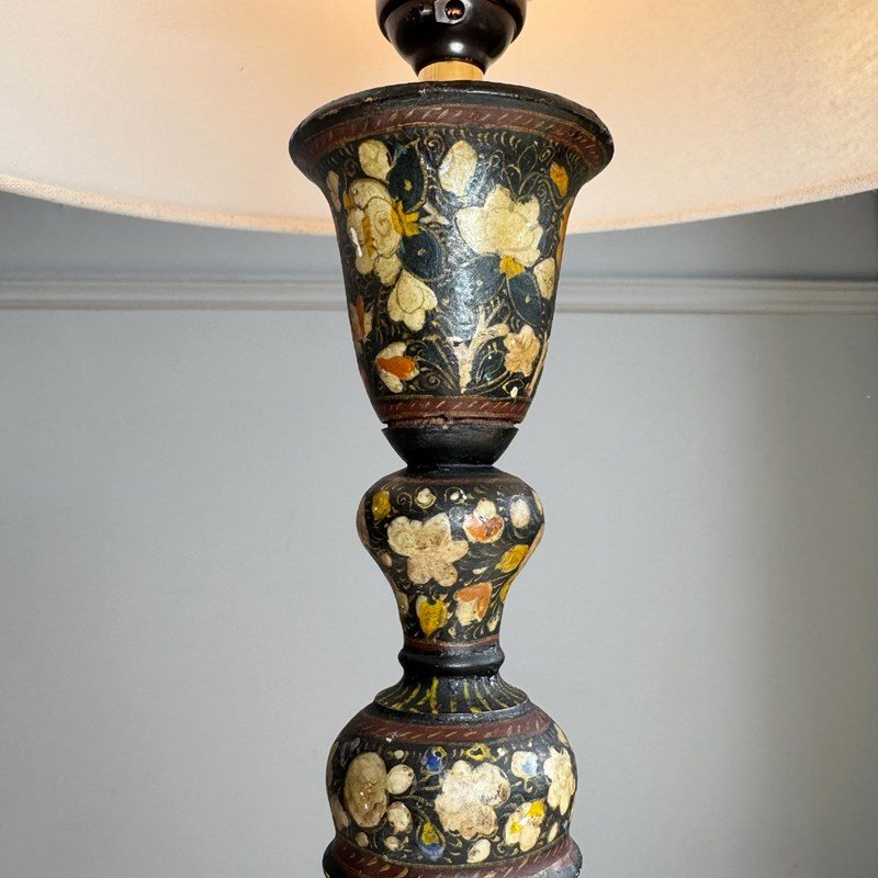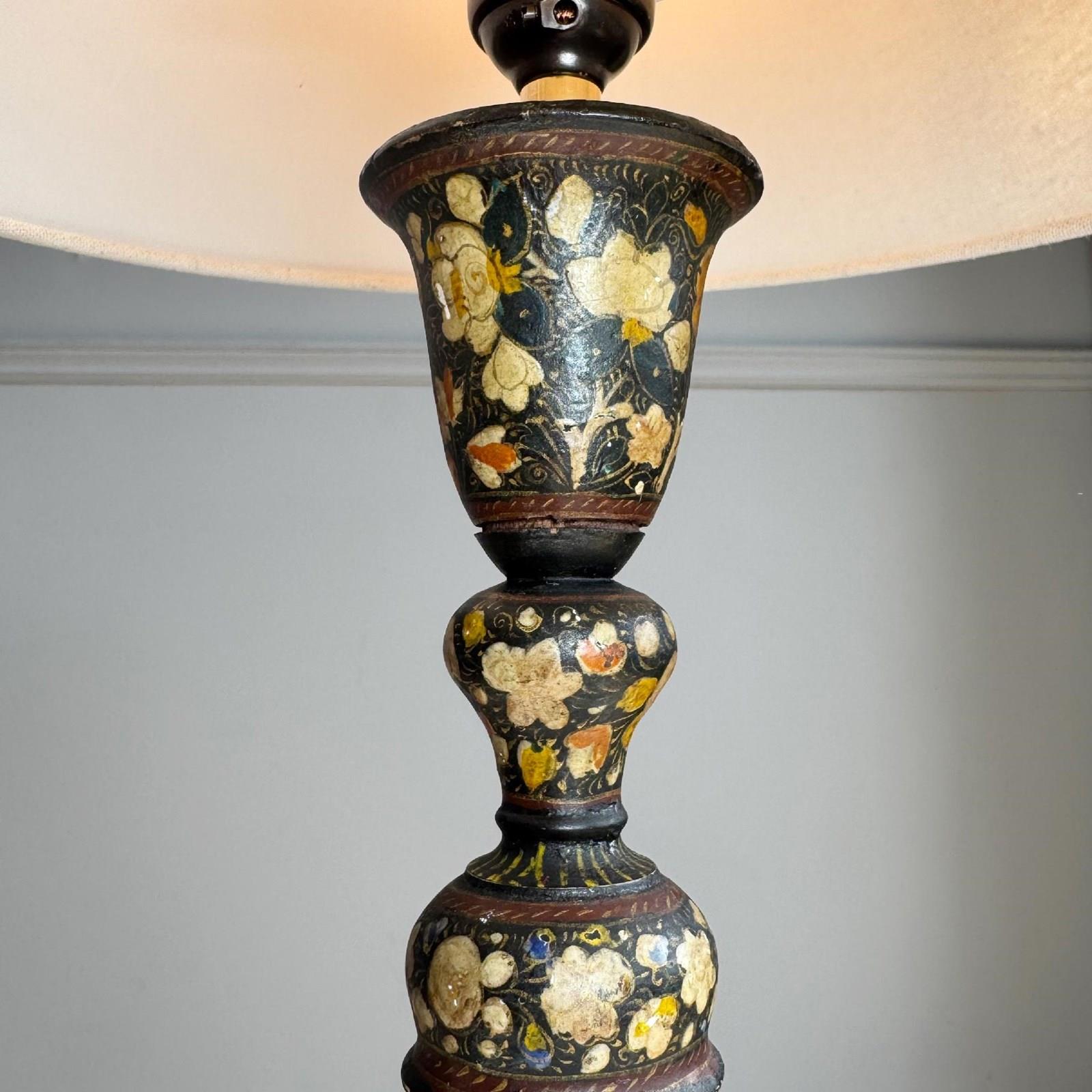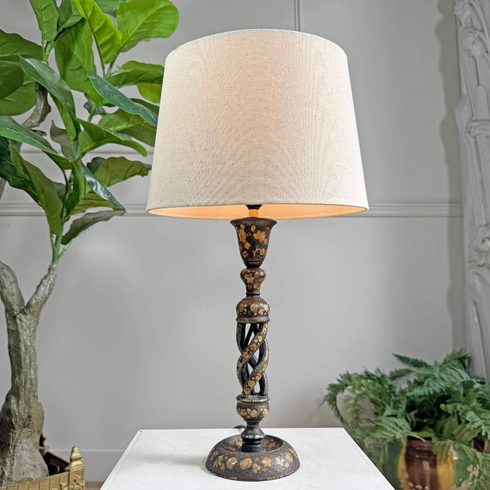 A late 19th century barley twist Kashmiri table lamp (originally a candlestick but now updated as a lamp), with the original intricate hand painted decoration throughout.