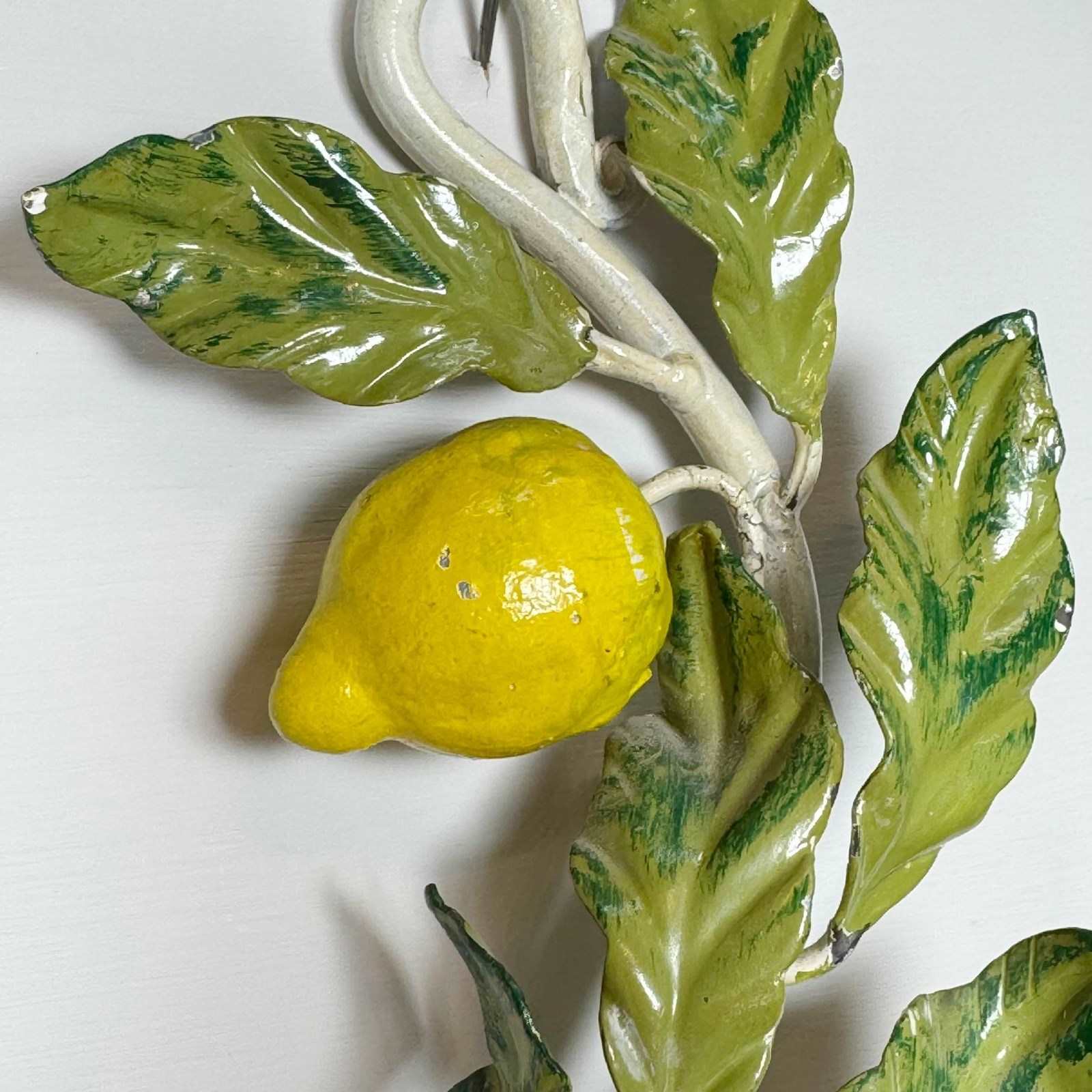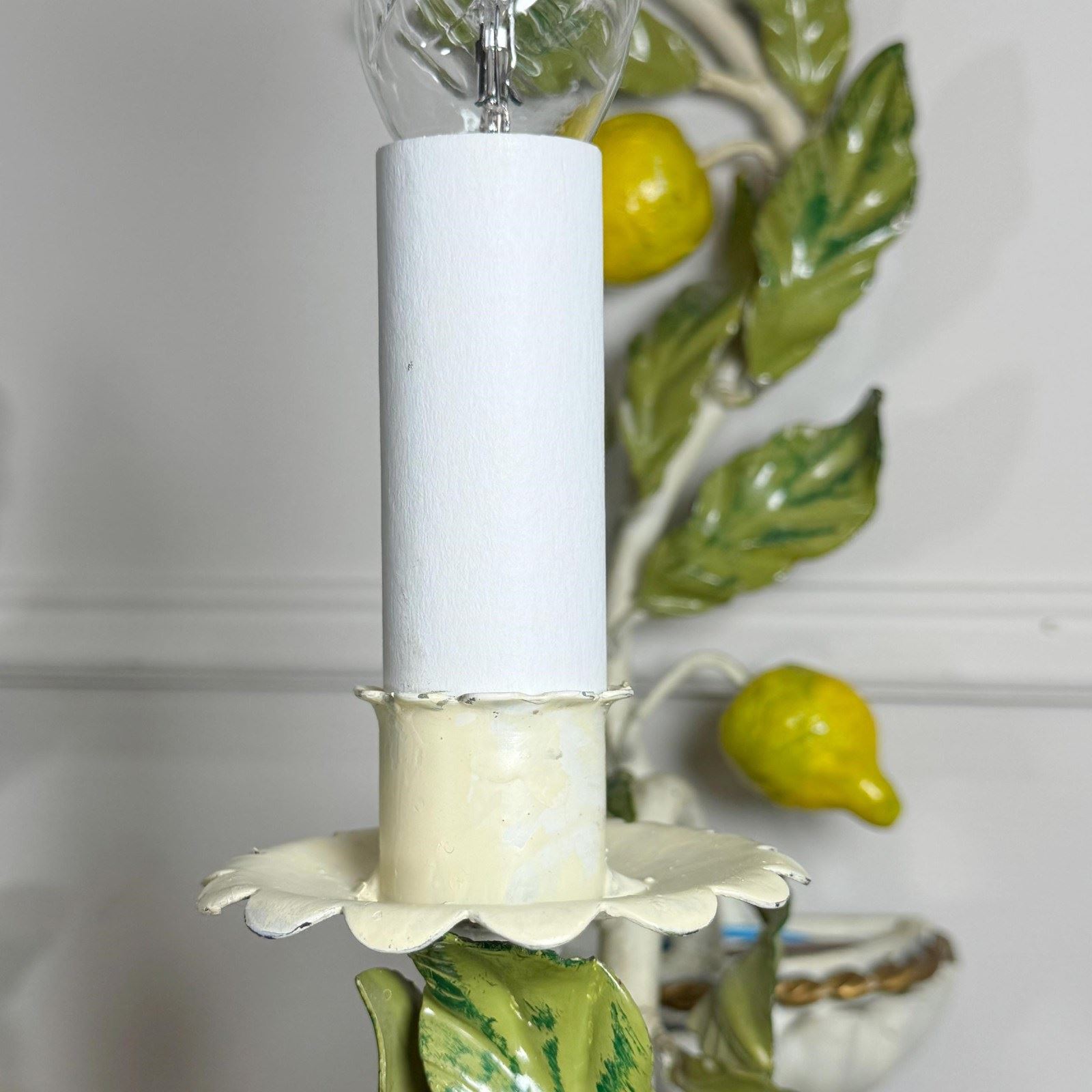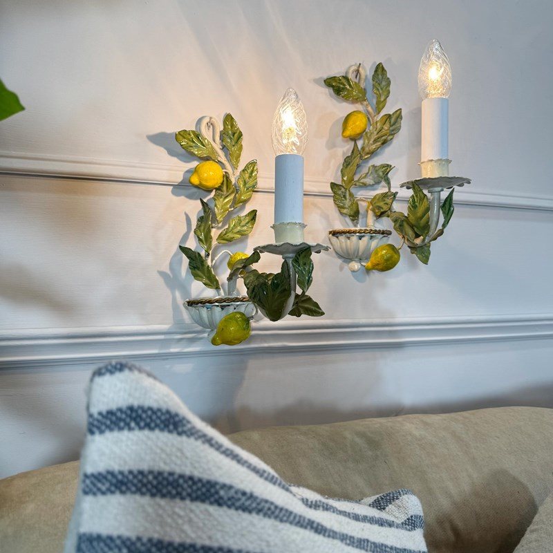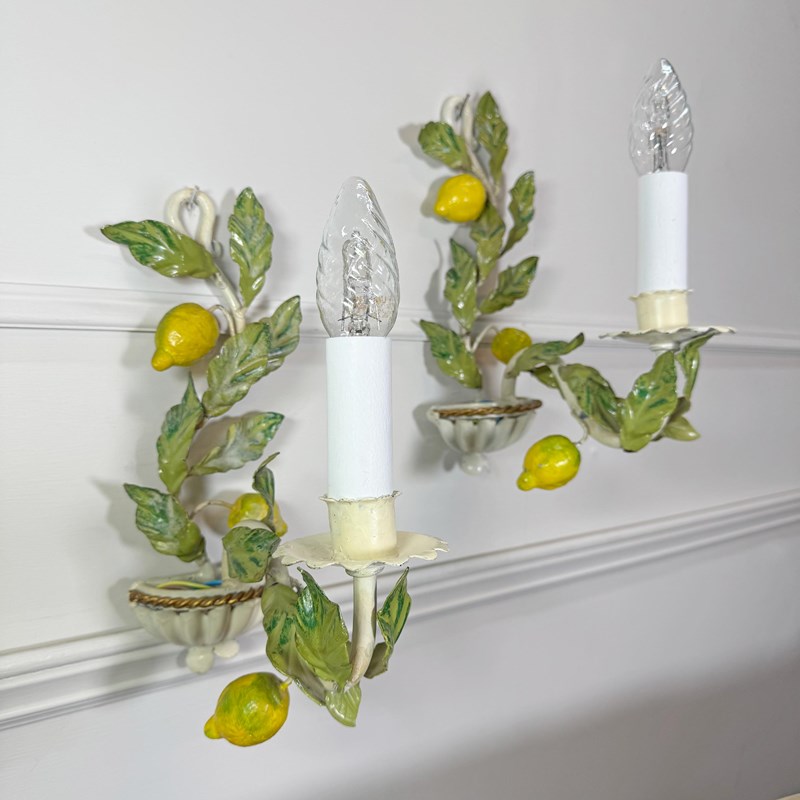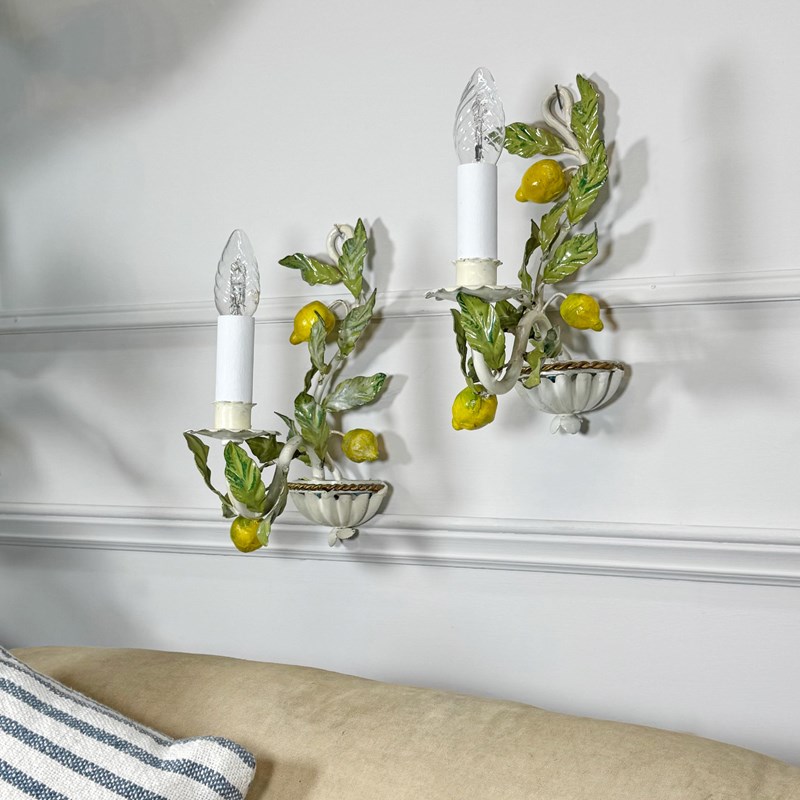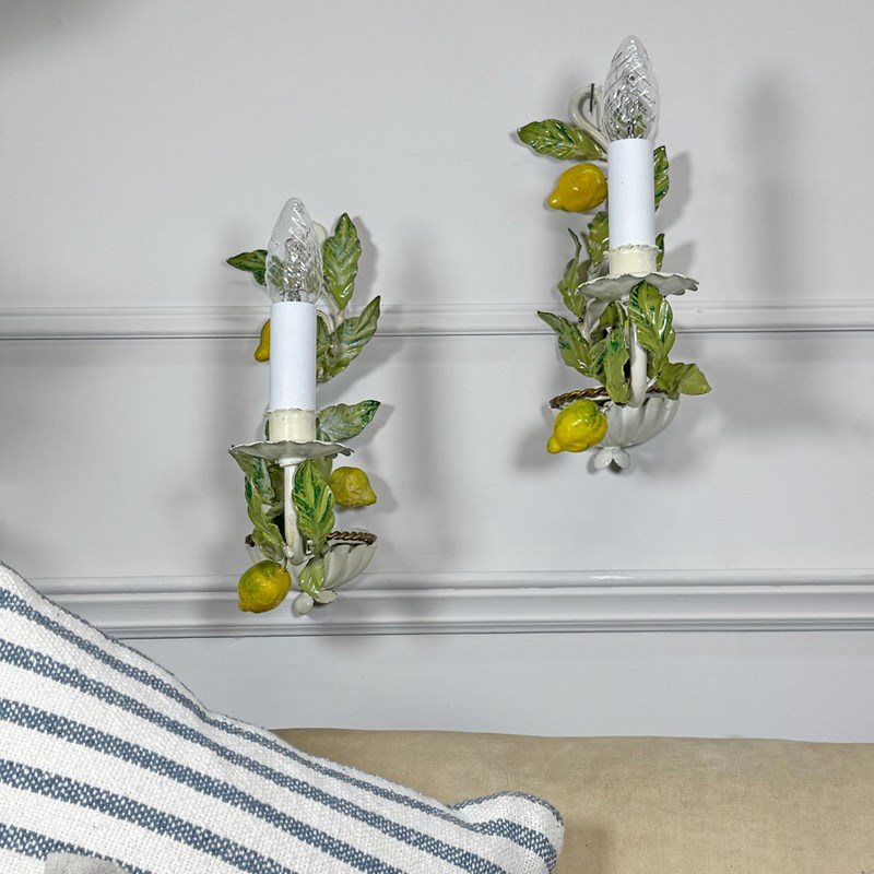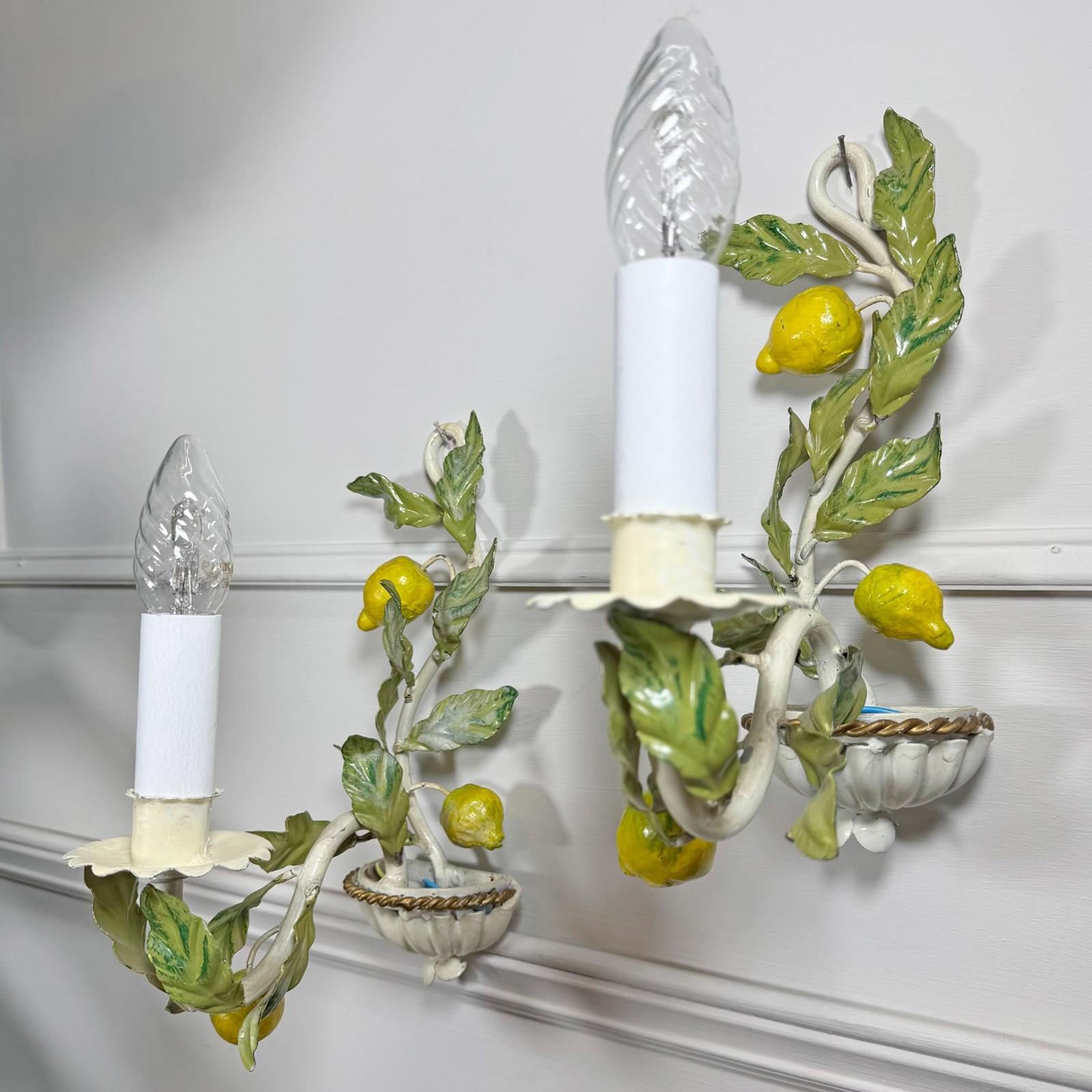 Gorgeous pair of 1950's Italian Amalfi Lemon tole wall lights, each light has a single e14 (small screw in) lamp holder.