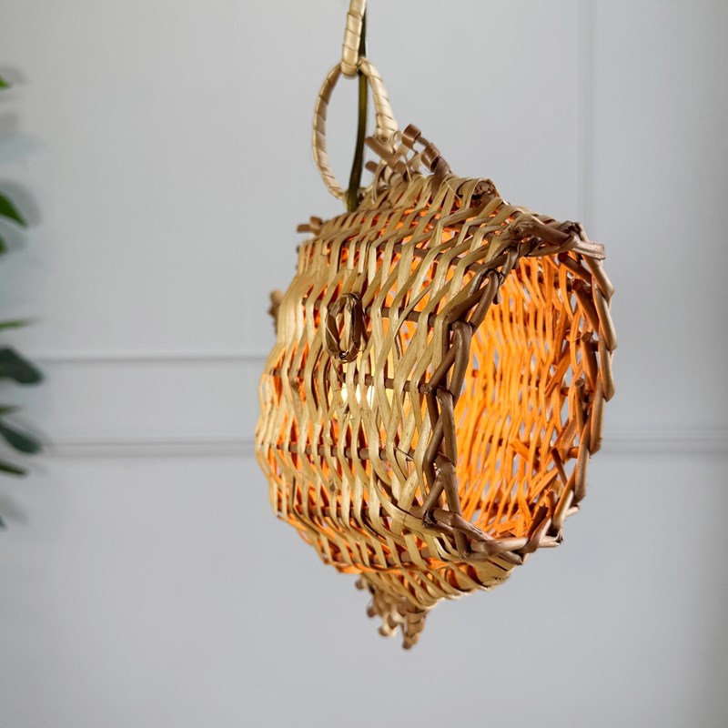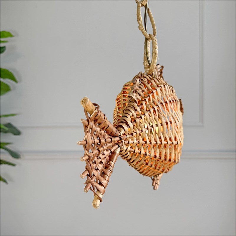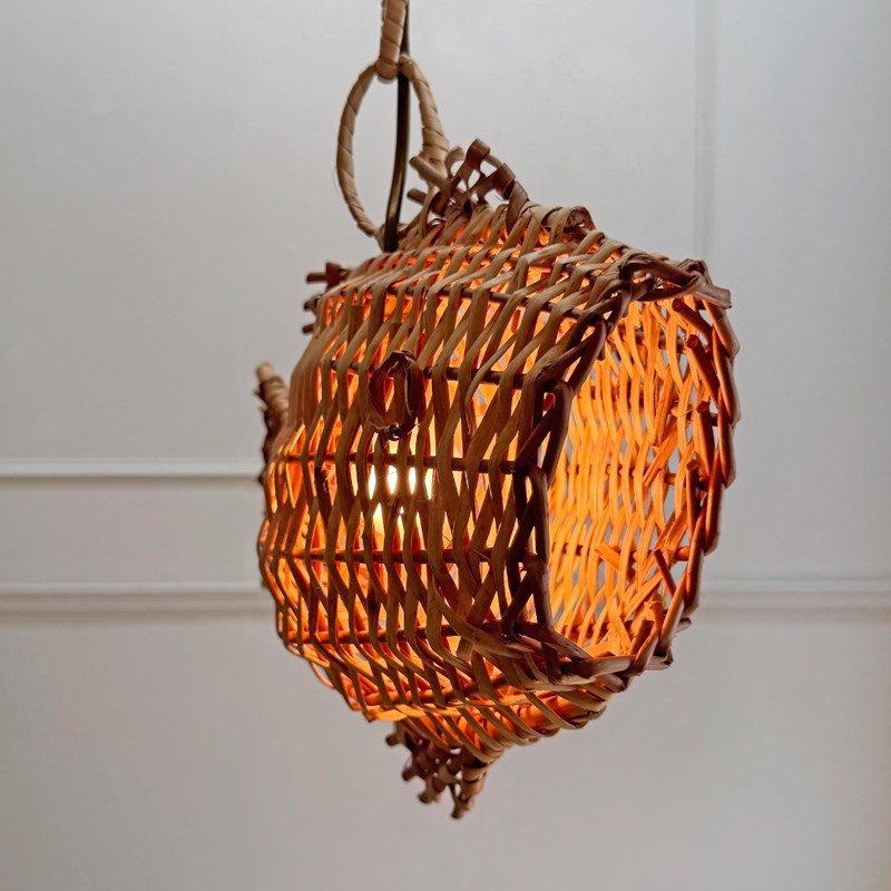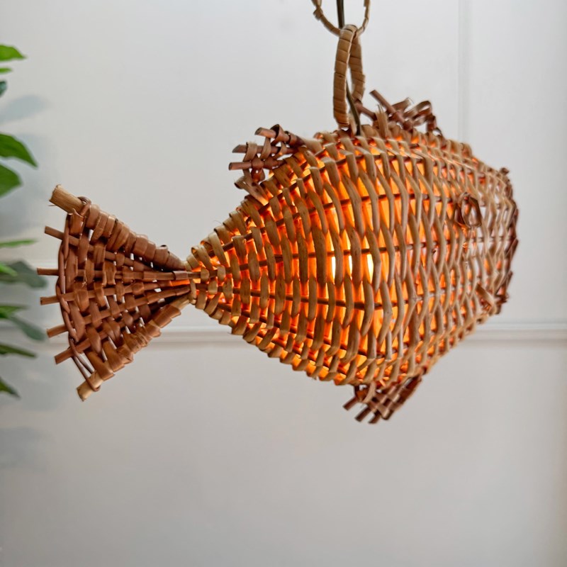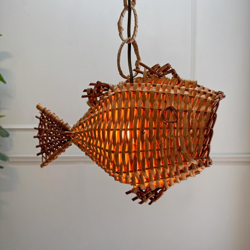 The single e14 (small screw in) Edison lamp holder sits inside the body of the Fish, the light pouring from the mouth and ‘scales’, this light still has a replacement wicker hanging chain fitted.