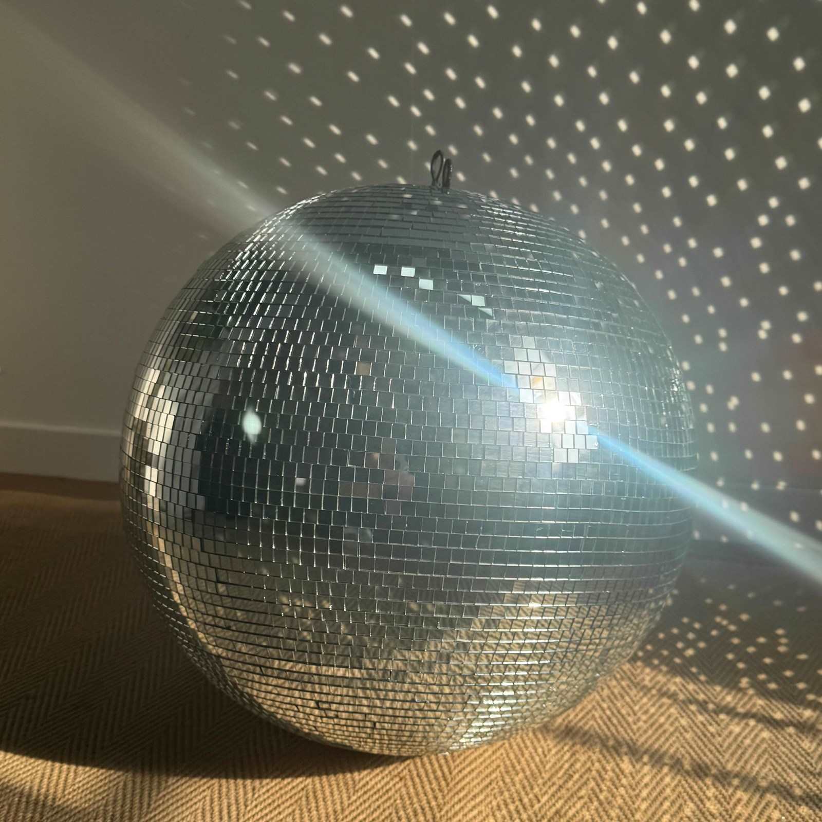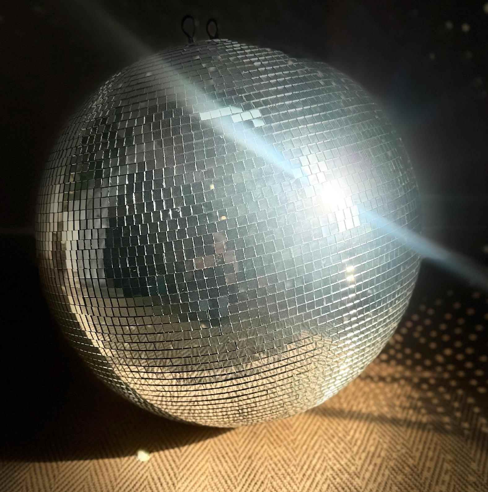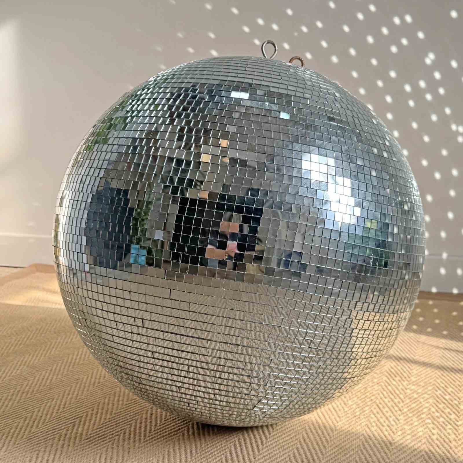 A fabulous large vintage glass mirrored disco ball, this is one of the heavy, quality 1970’s originals, (not the modern lightweight polystyrene reproduction version), two hanging loops to the top. 1cm glass mirror squares not plastic stickers.