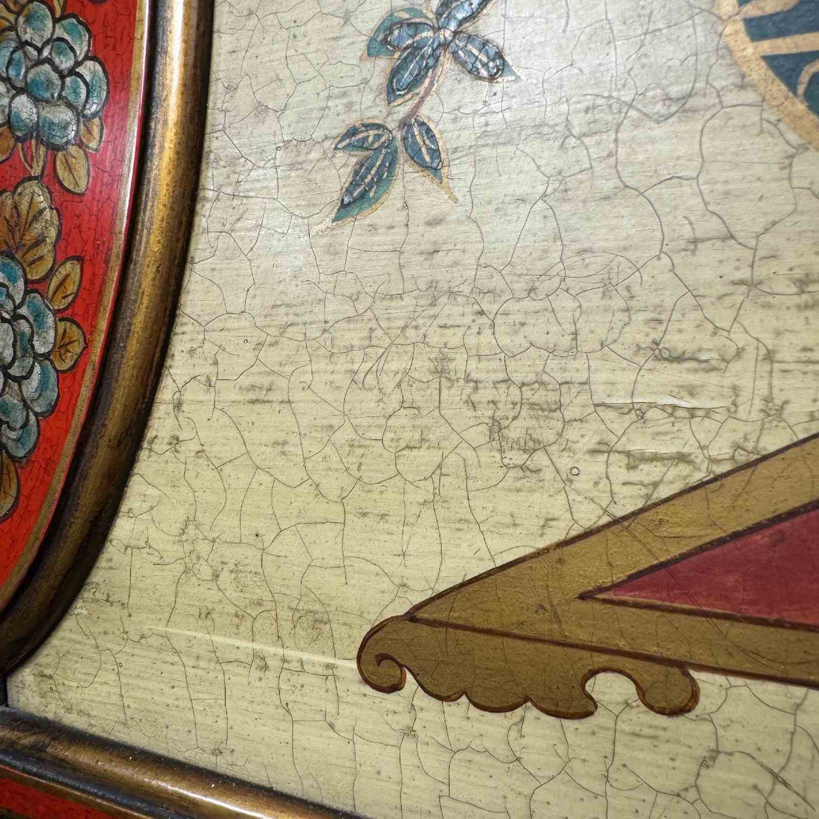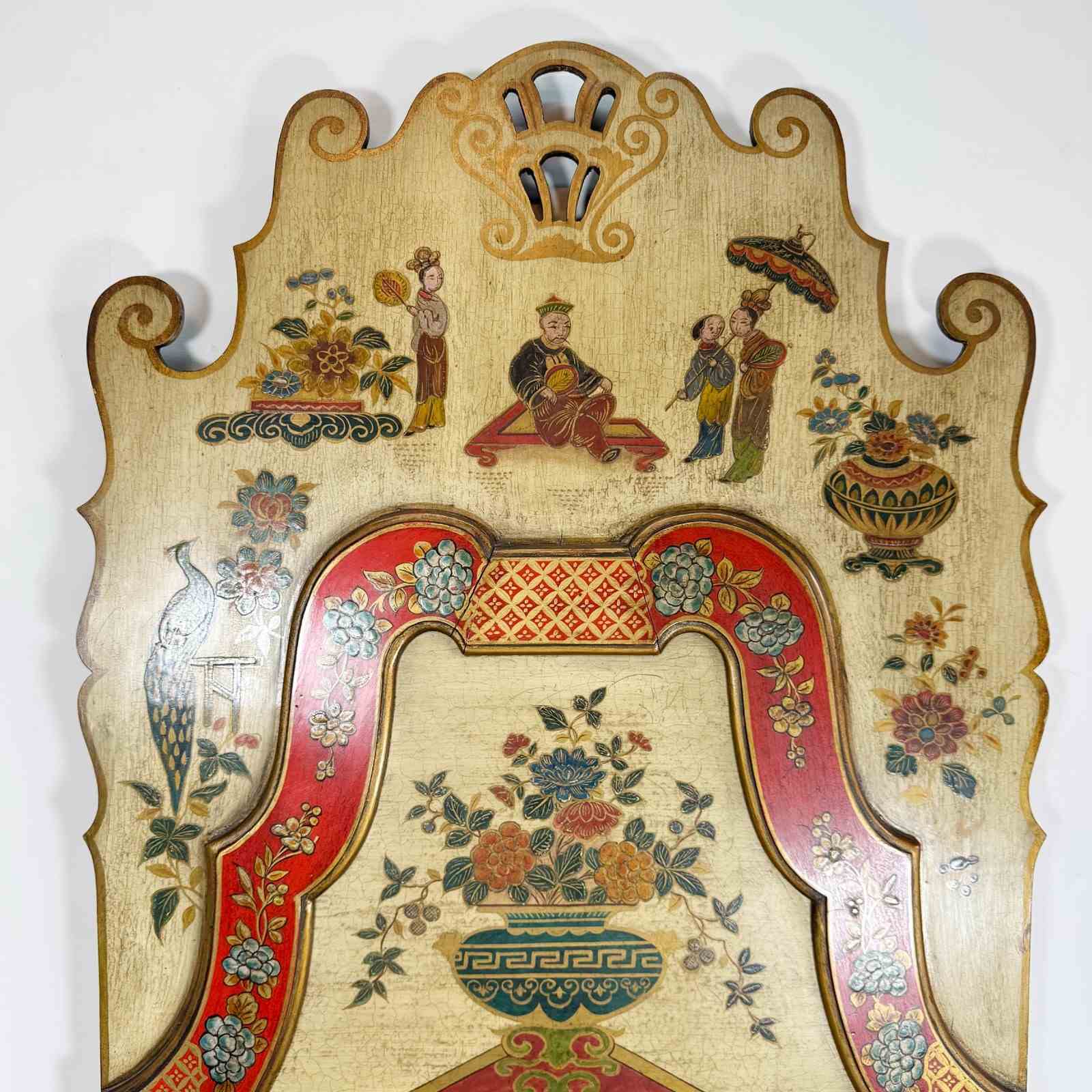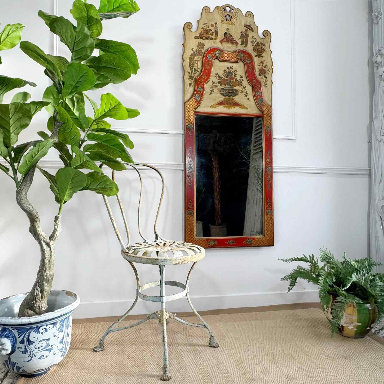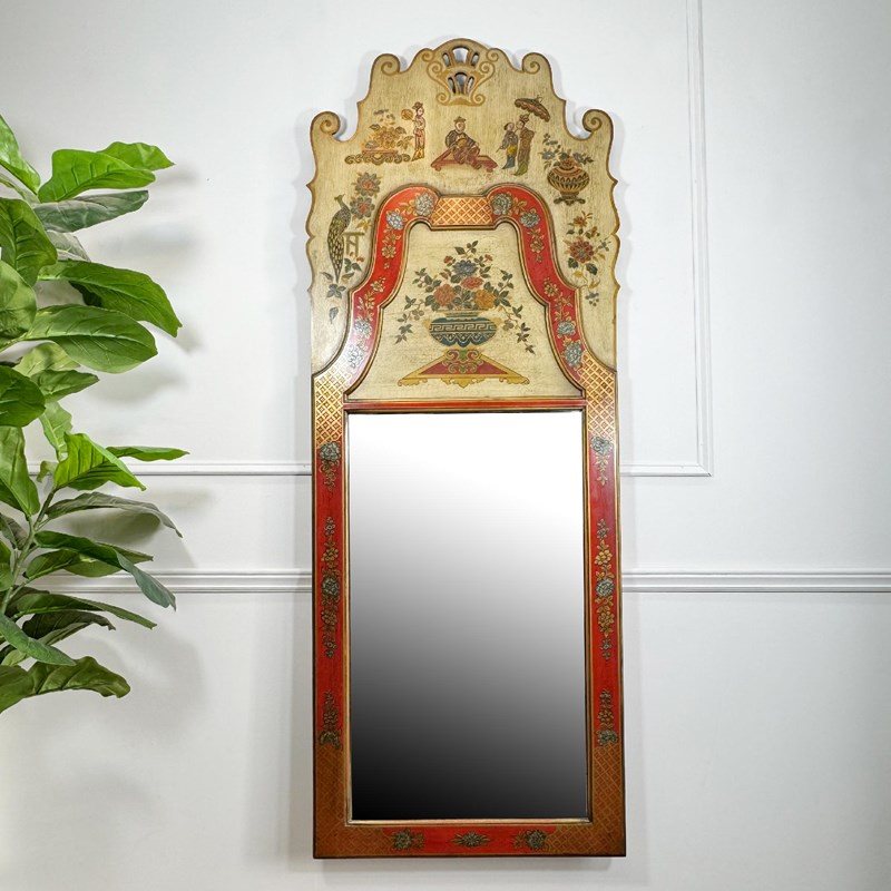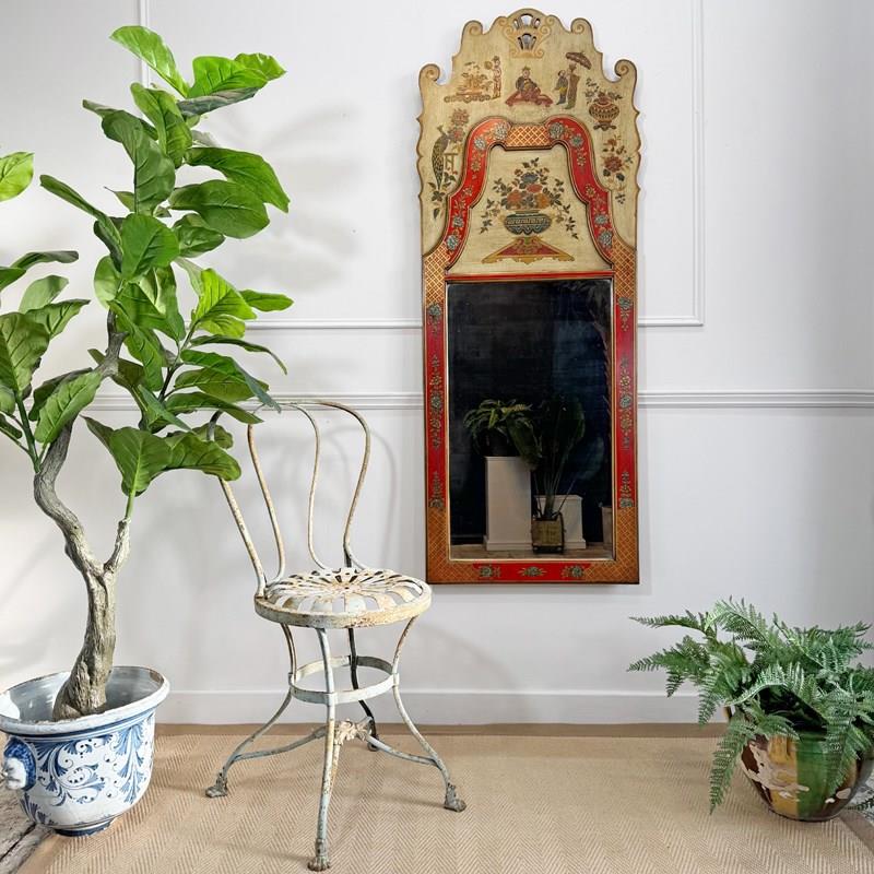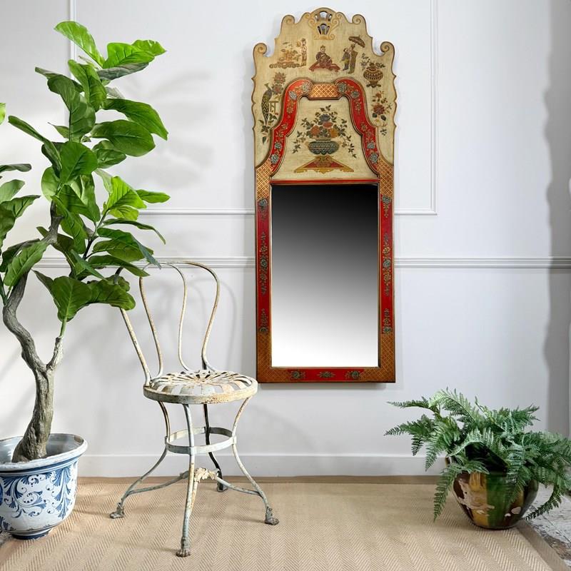 A stunning George I style chinoiserie mirror, English, early 20th century in a gorgeous scarlet red, adorned with hand painted decoration featuring flowers, birds, figures and oriental scenes, the huge crest in a complimentary neutral stone finish. The frame displaying the perfect amount of age related wear and crazing, slight spots of foxing to the original plate. A beautiful period mirror in a rare colorway, and of great scale and proportion.