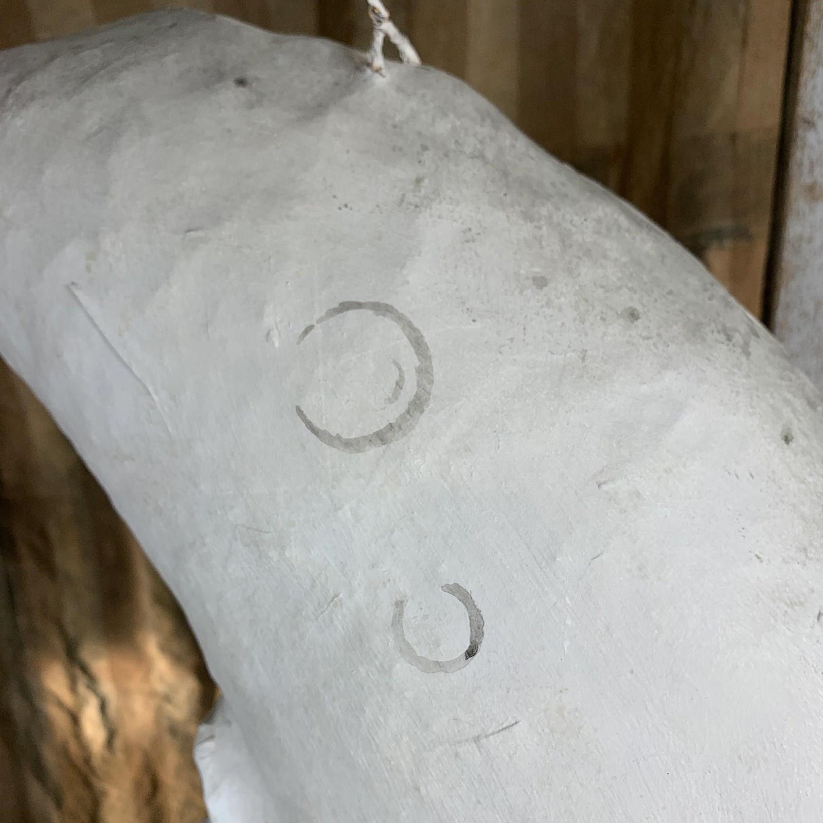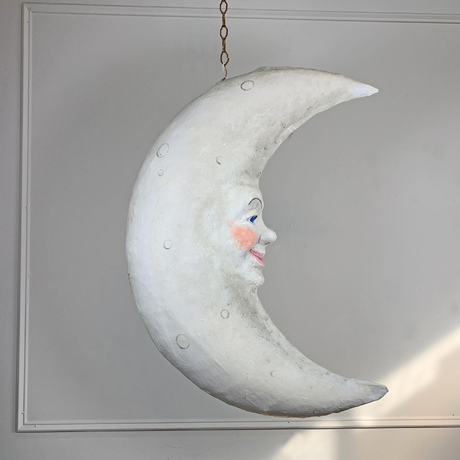 This captivating hand-crafted folk art hanging crescent moon, its unusual three-dimensional cratered form of very large proportions, with a central face, awake on one side, asleep on the other, is a rare find. The hand painted surface shows some signs of wear, but nothing of note. Original hanging wire loop to the top, and a length of antique chain.