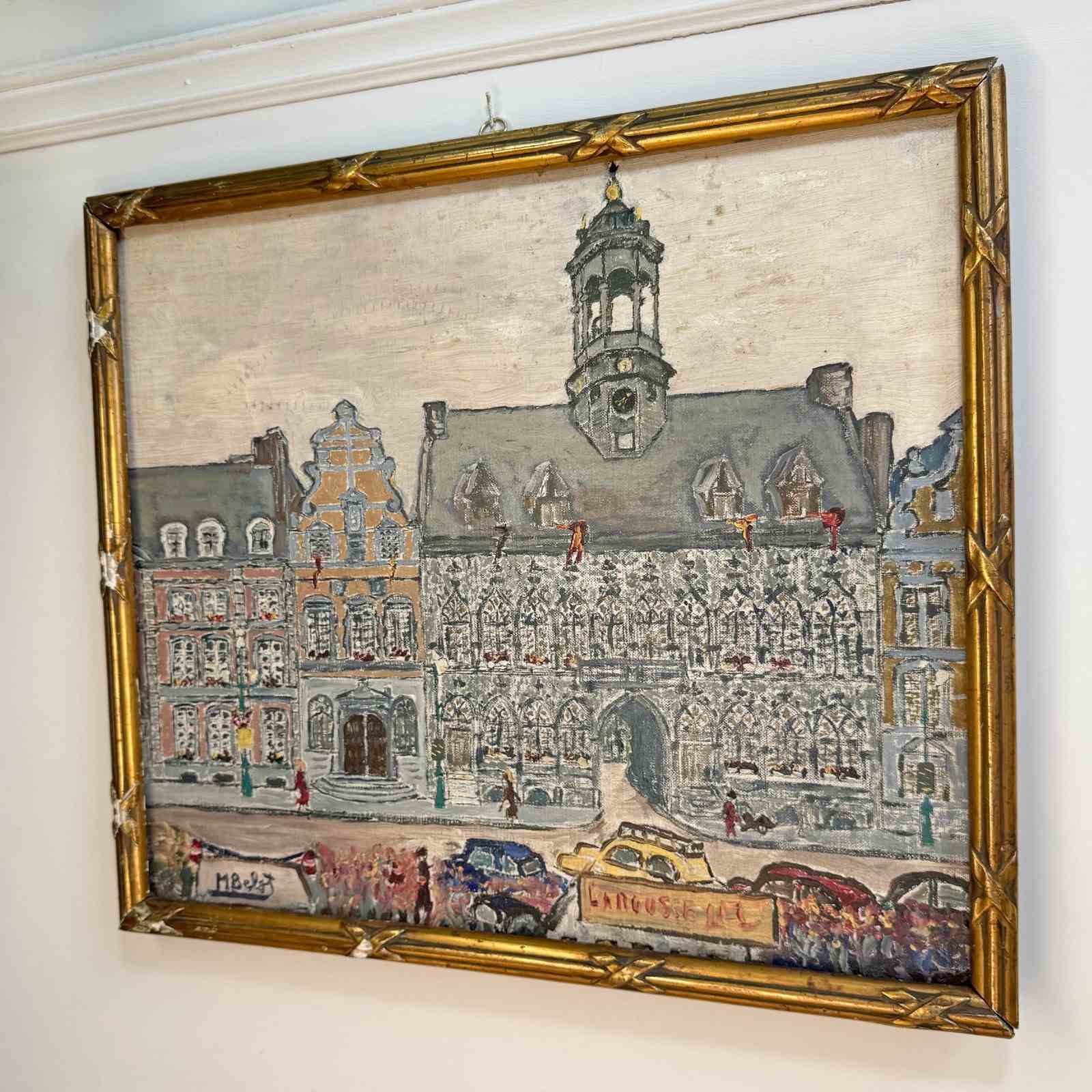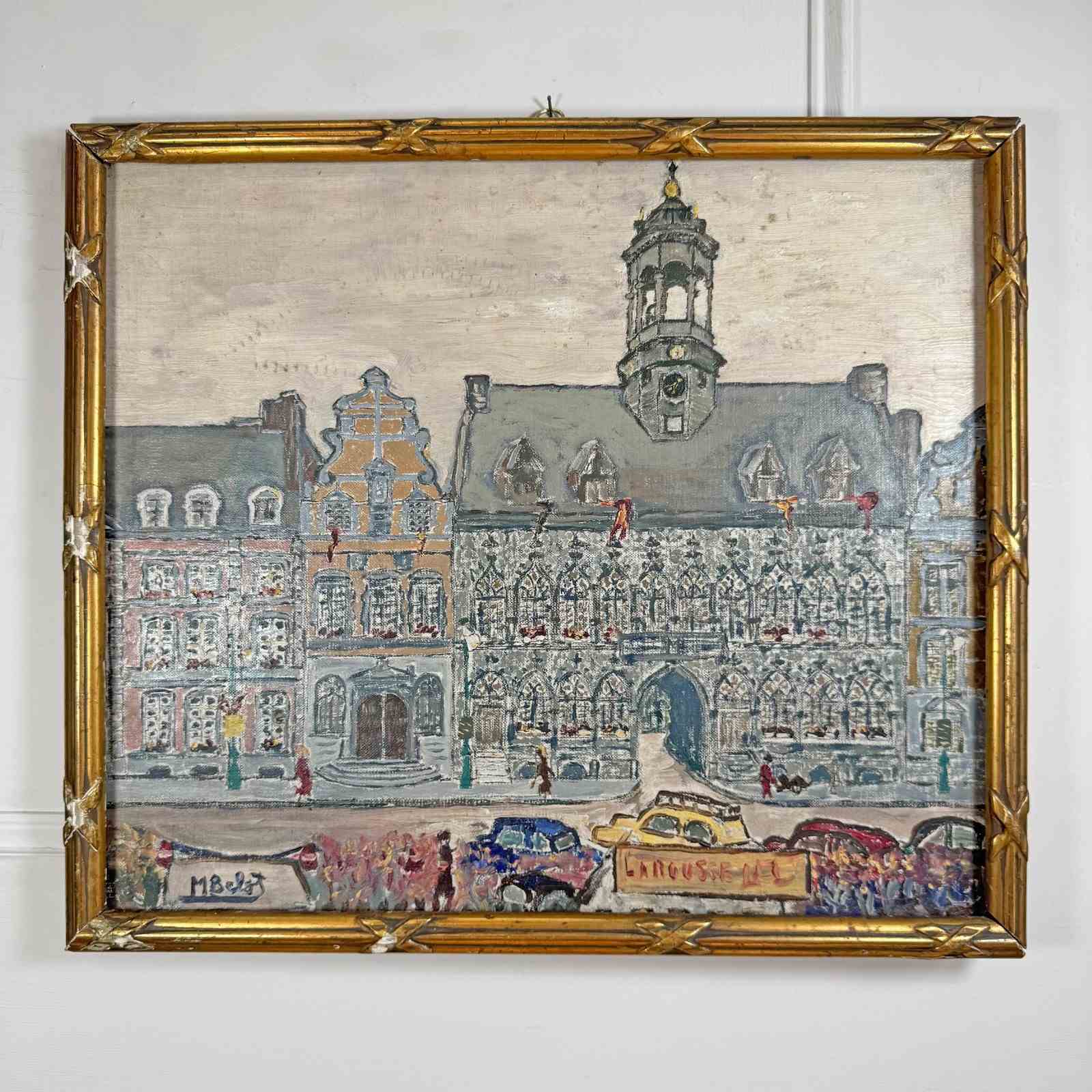 An oil on canvas painting of a street scene in Mons, Belgium.