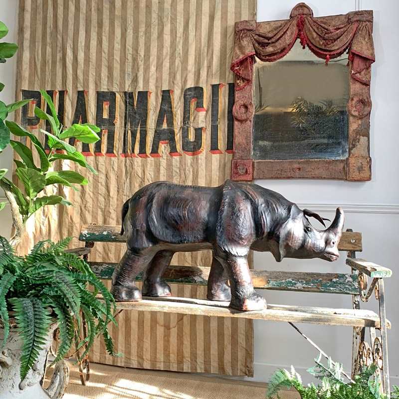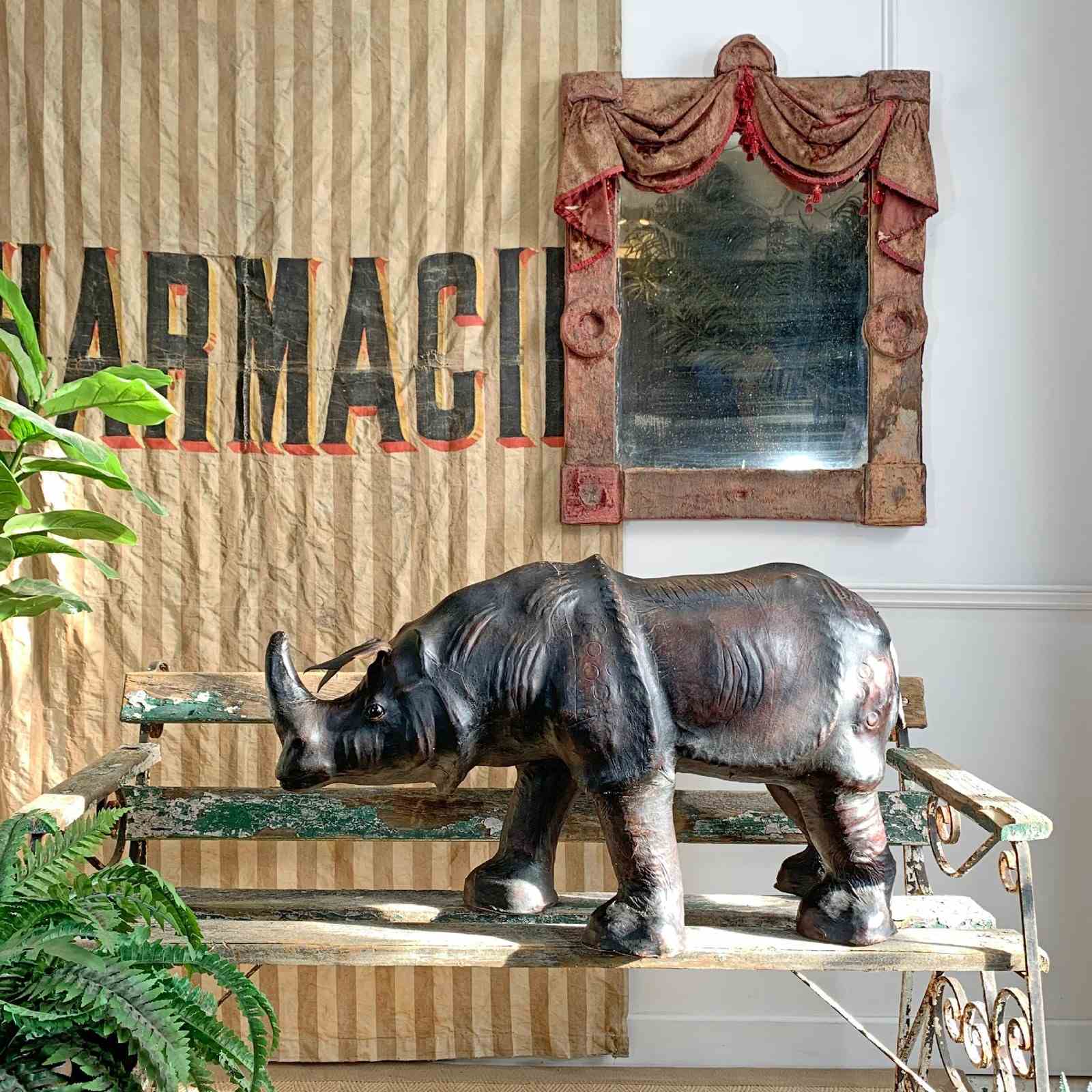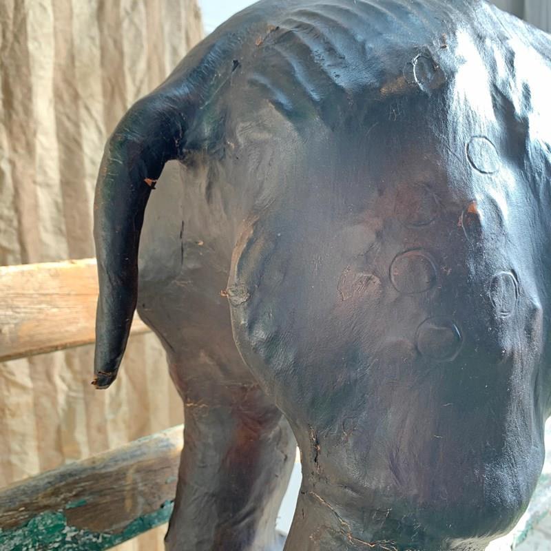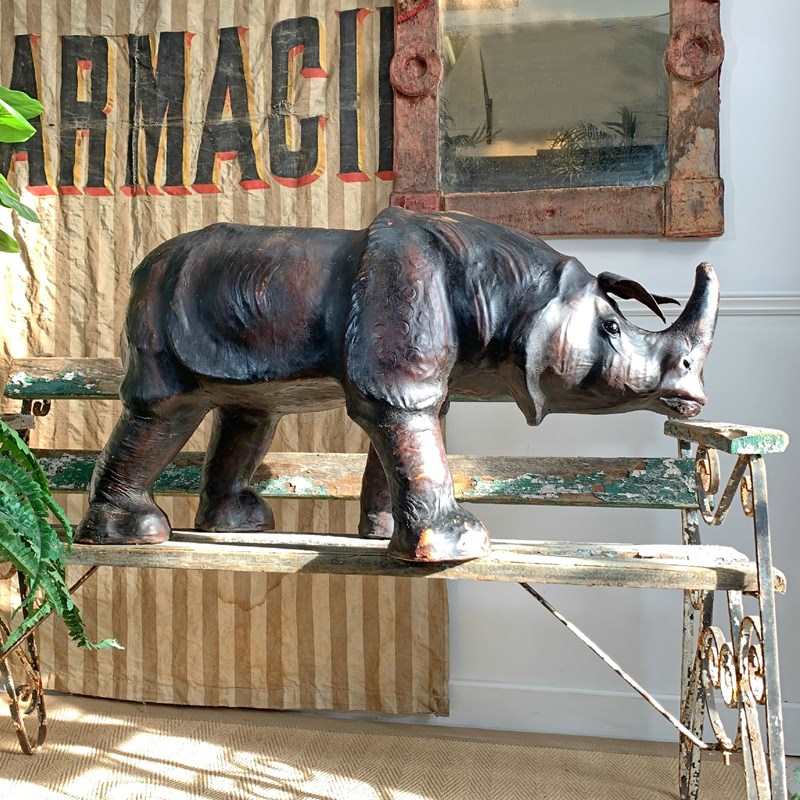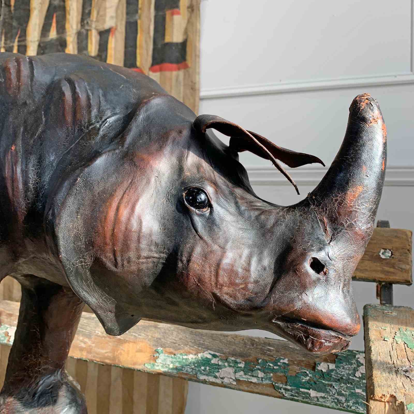 A beautifully hand crafted dark leather foot stool, modelled as an Rhino, it’s head bowed and horn extended skyward, with wide and rare green glass eyes, and leather ears, it is incredibly detailed and of exceptional quality, attributed to Liberty of London this dates to the early 20th century and is in superb condition, with a few age related scuffs and marks