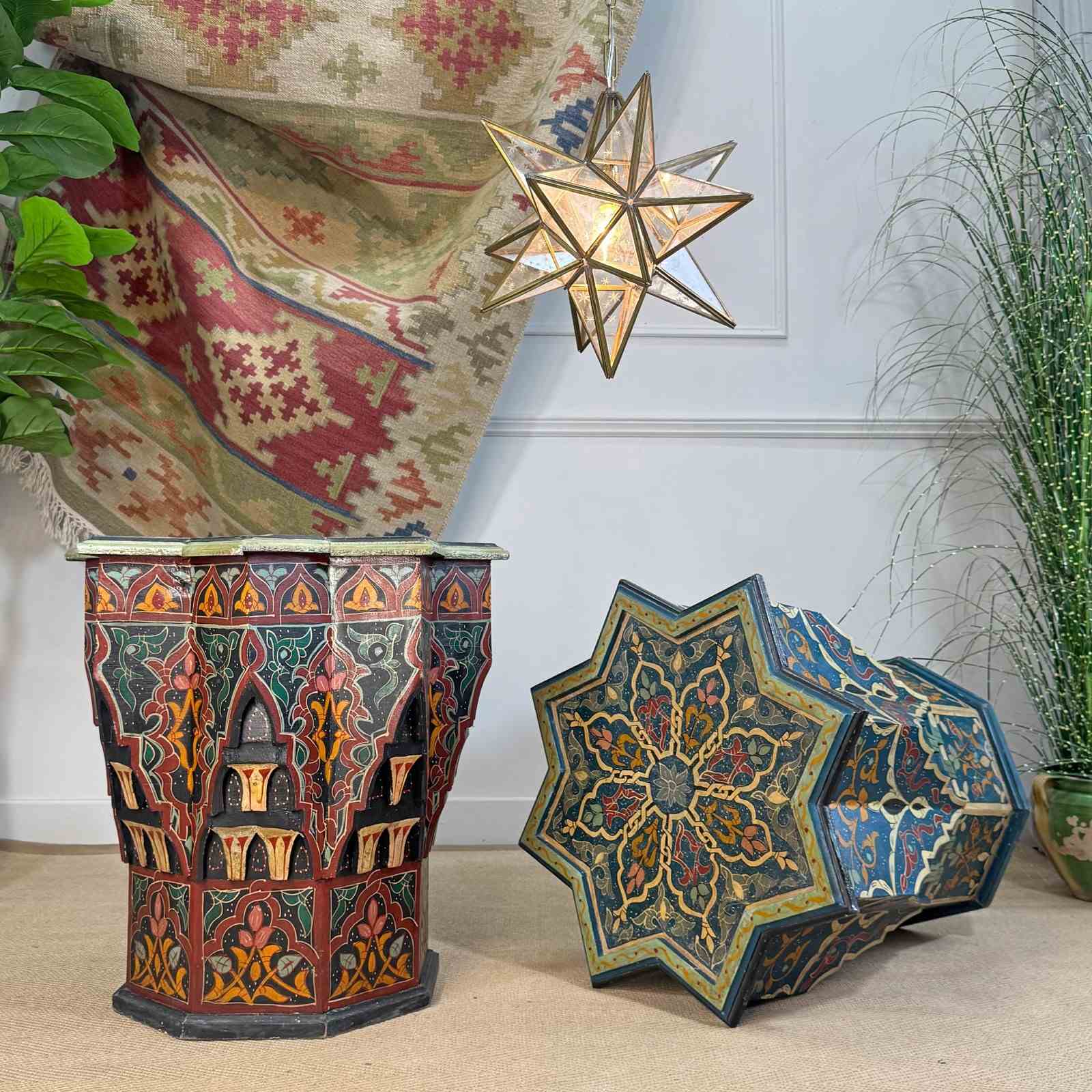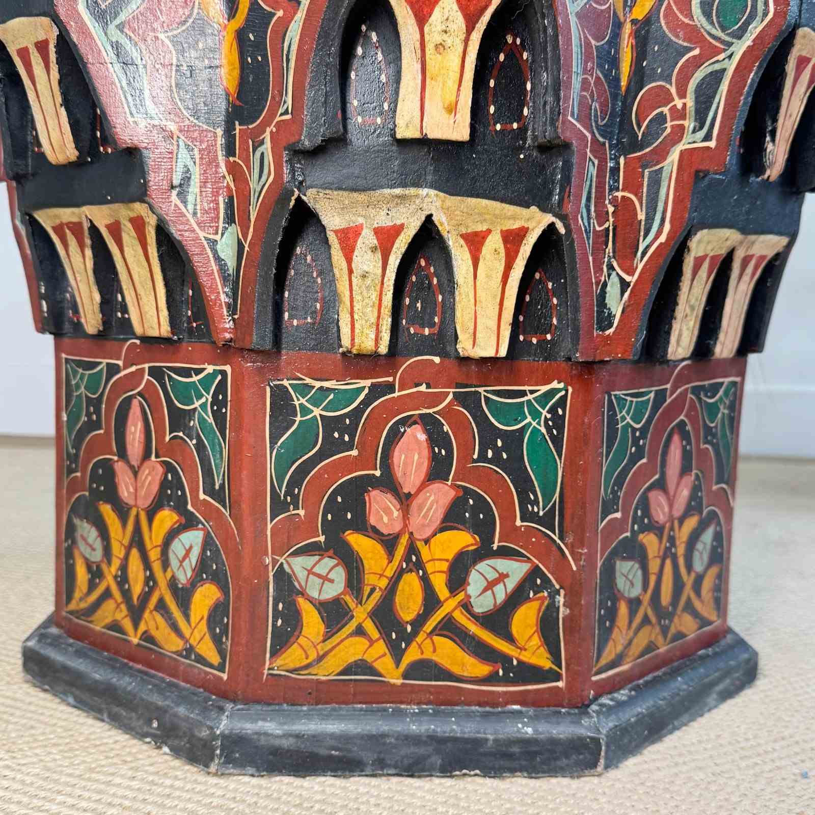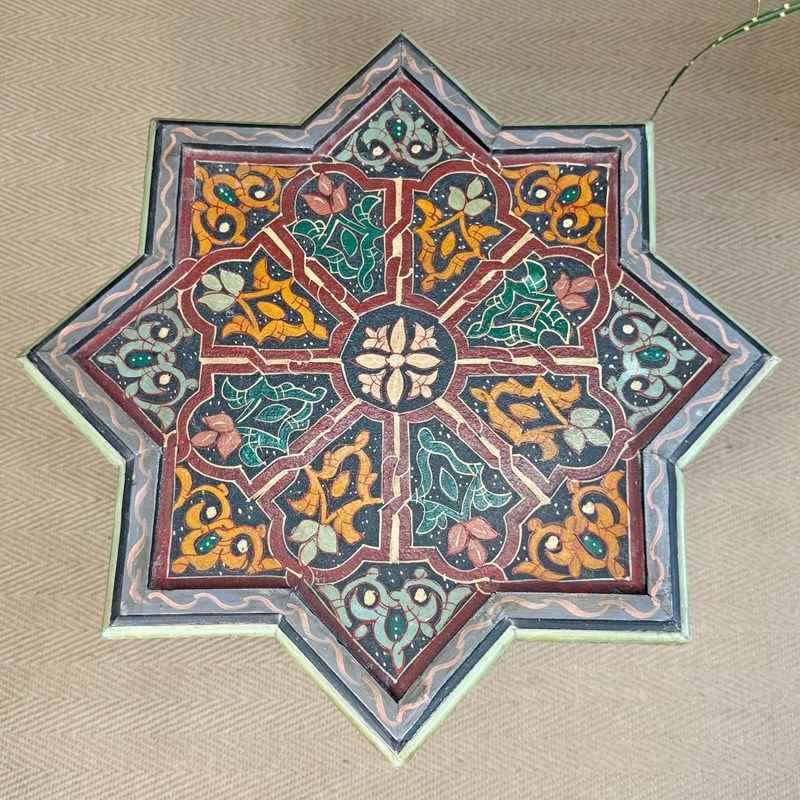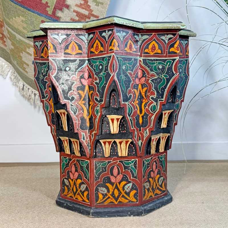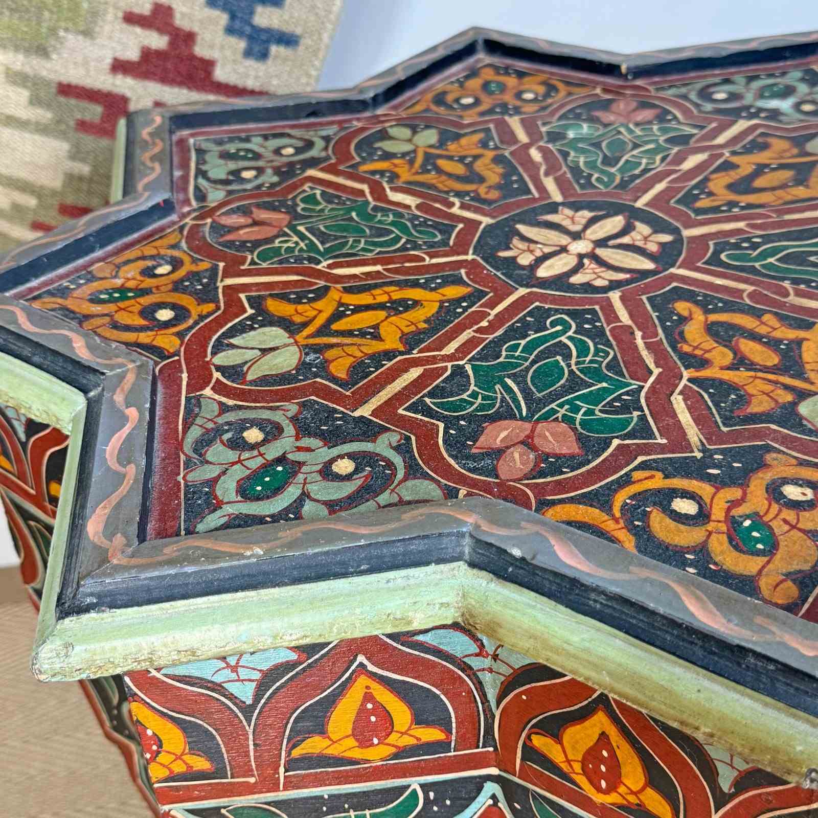 Handcrafted in Morocco circa 1950 this piece features an architectural octagonal base that supports a star-shaped surface. Every inch of the wood is covered in intricate, hand-painted Zouak motifs, showcasing traditional Islamic geometric patterns and floral arabesques in a rich palette of terracotta red, forest green, and deep ochre.