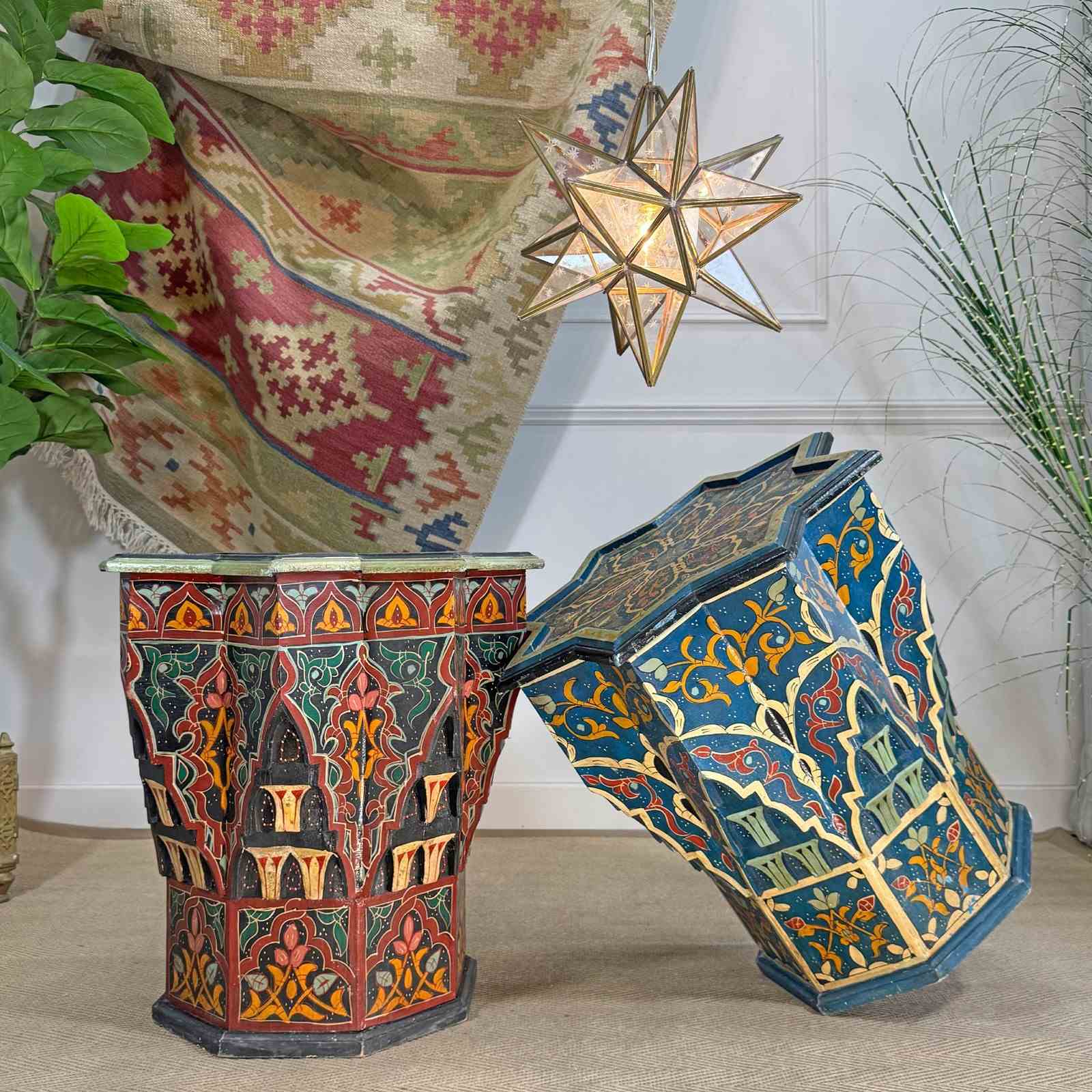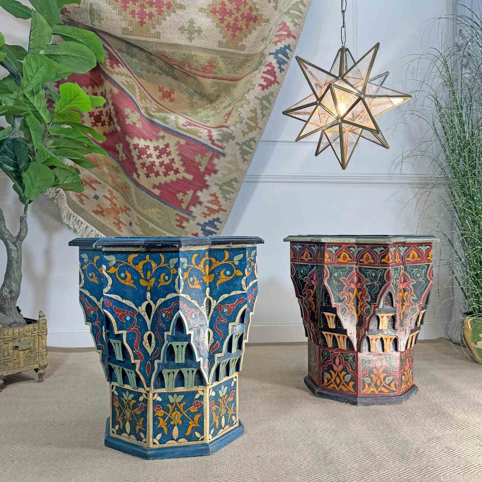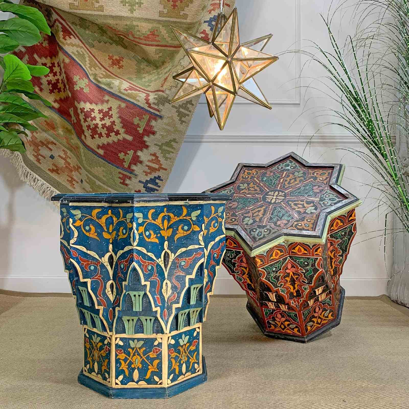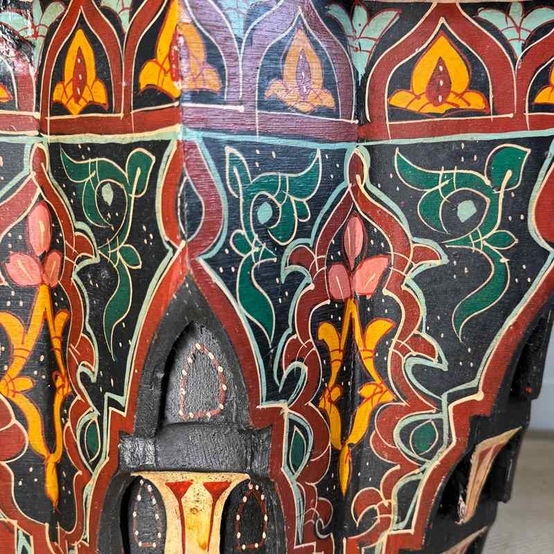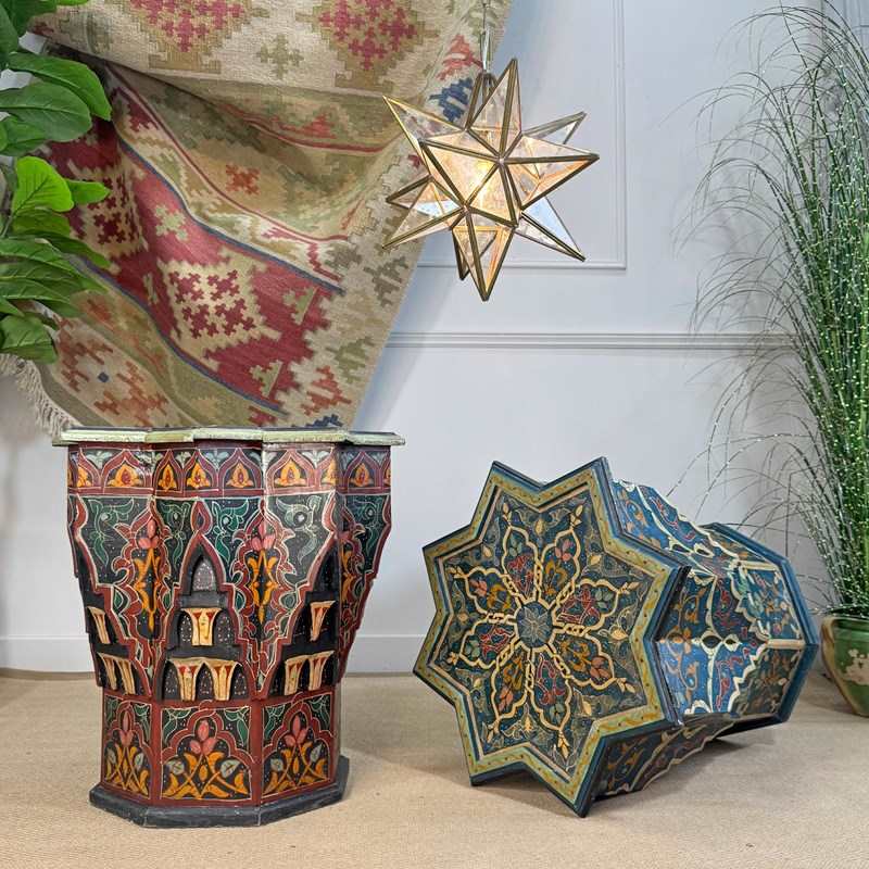 Handcrafted in Morocco circa 1950 this piece features an architectural octagonal base that supports a star-shaped surface. Every inch of the wood is covered in intricate, hand-painted Zouak motifs, showcasing traditional Islamic geometric patterns and floral arabesques in a rich palette of terracotta red, forest green, and deep ochre.