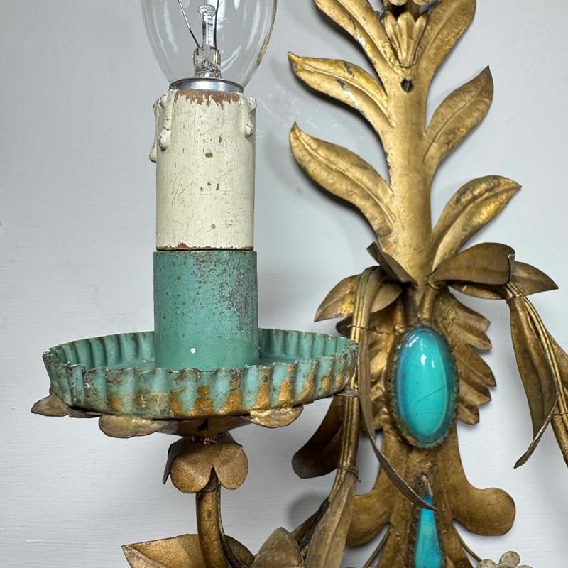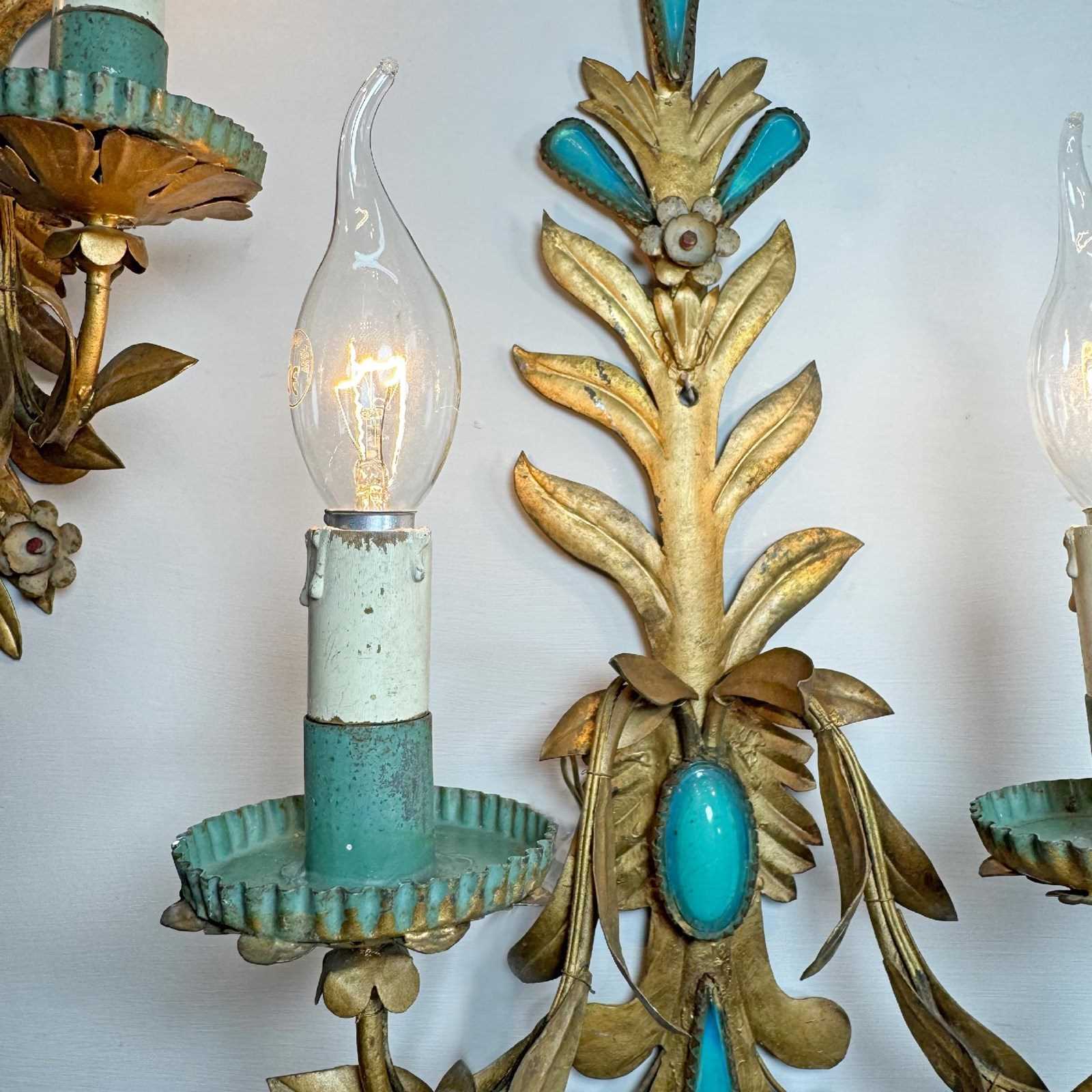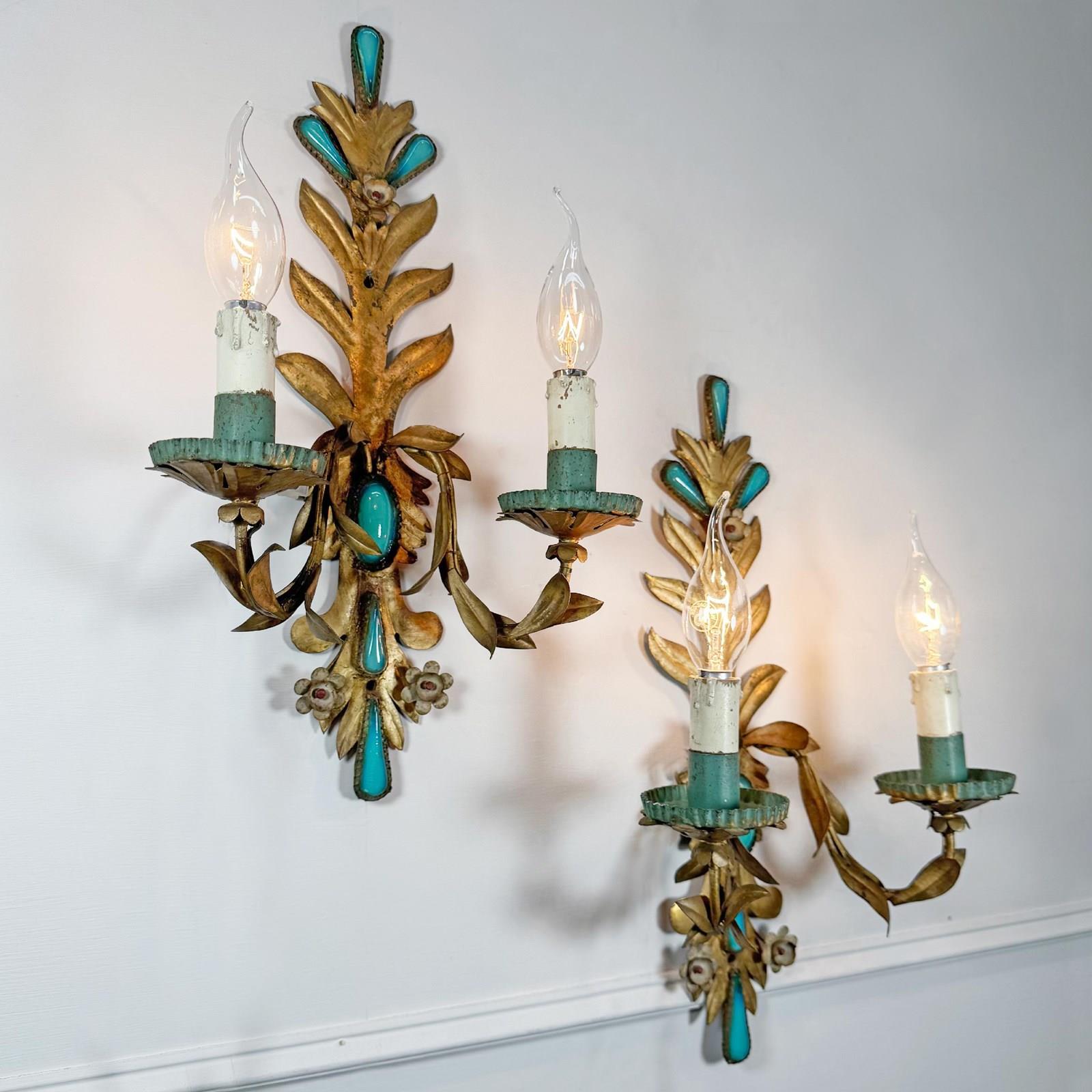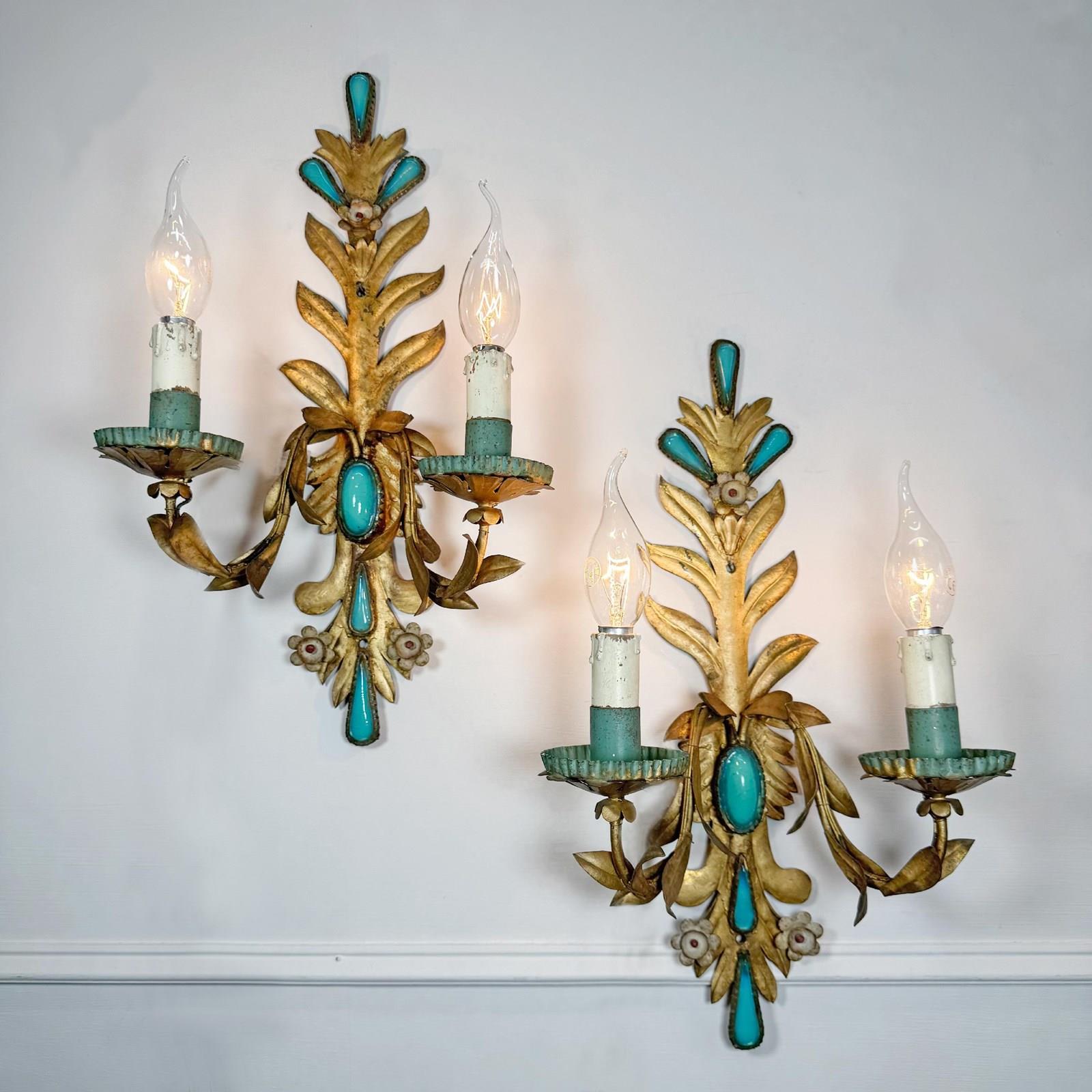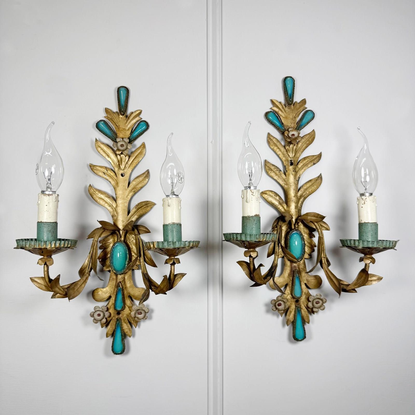 An exceptional and rare pair of 19th century Italian wall lights, in gilded iron with rich turquoise glass decorative inserts, a truly stunning pair of wall lights, originally created circa 1880 as candle sconces and later sympathetically adapted to electrical lighting. Each light has two e14 (small screw in) lamp holders, original turquoise paint to cup and lamp holder.