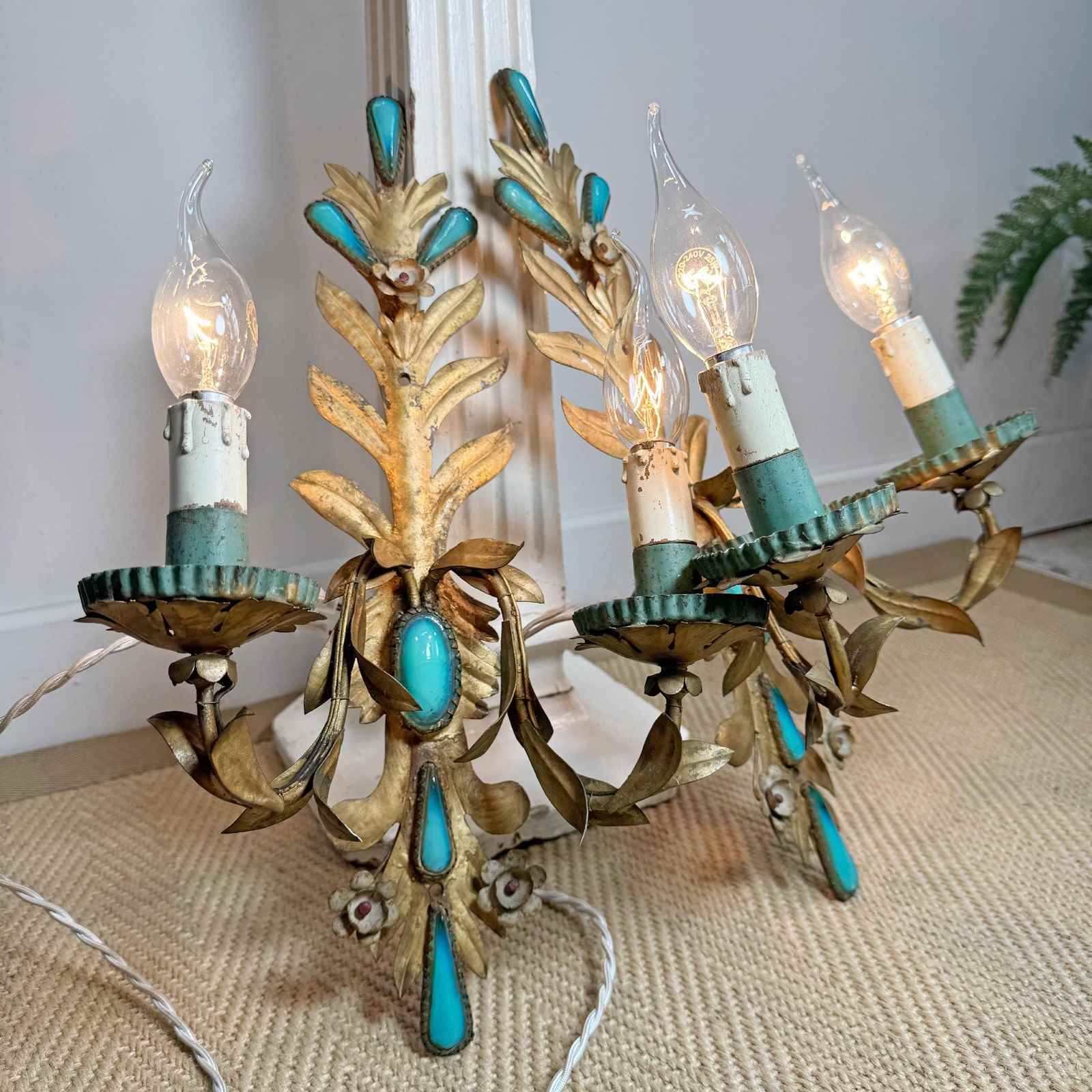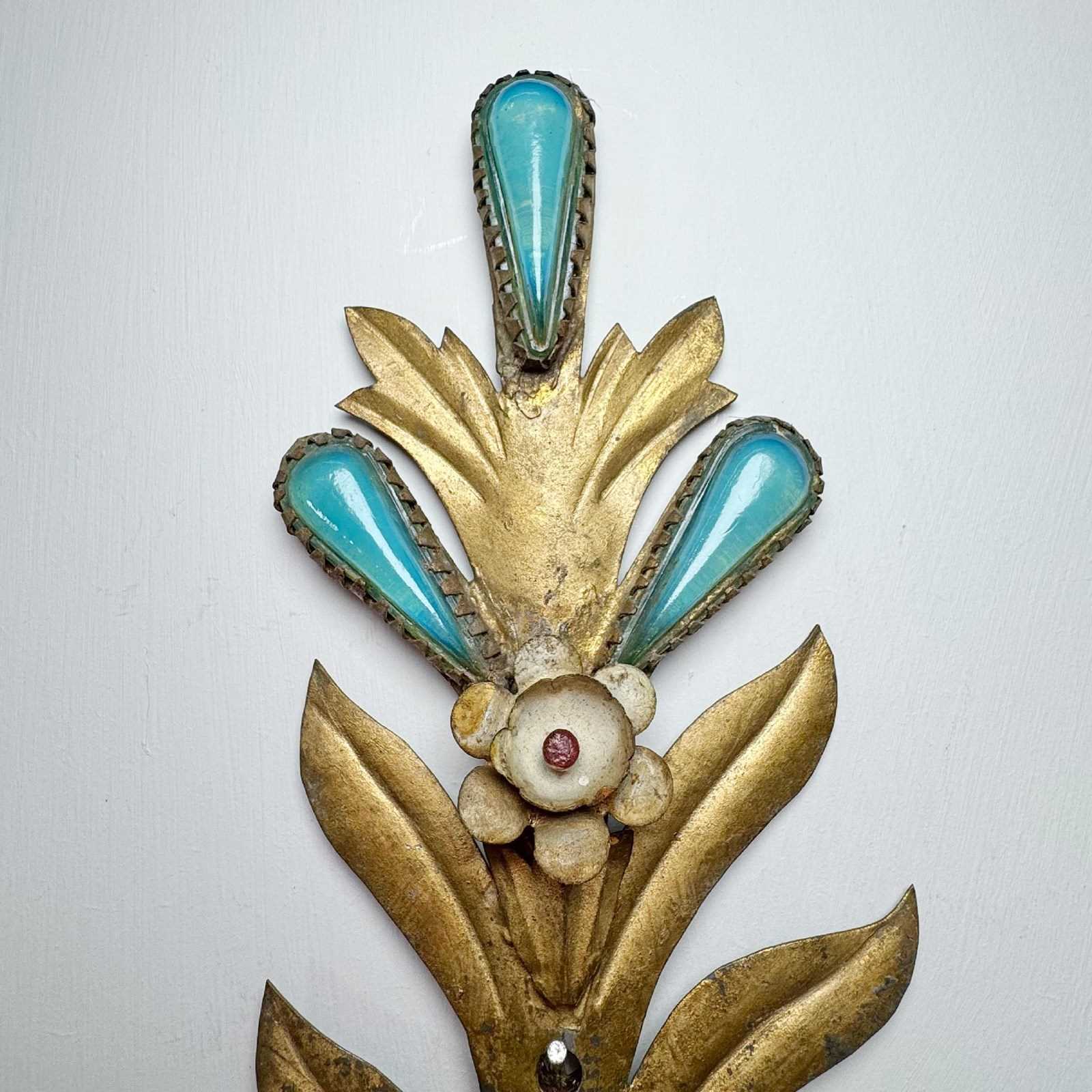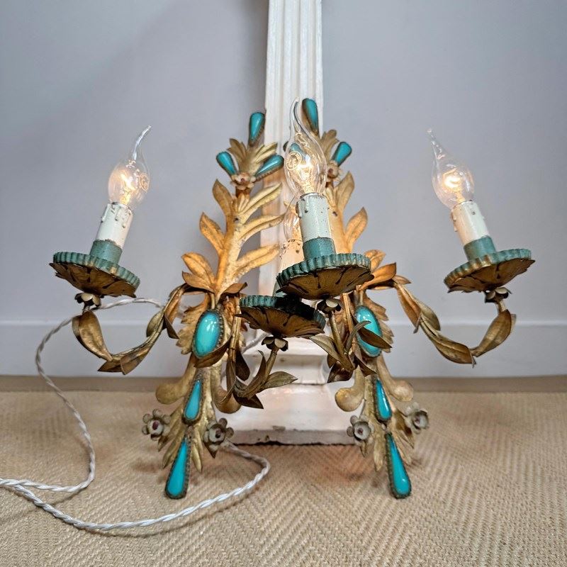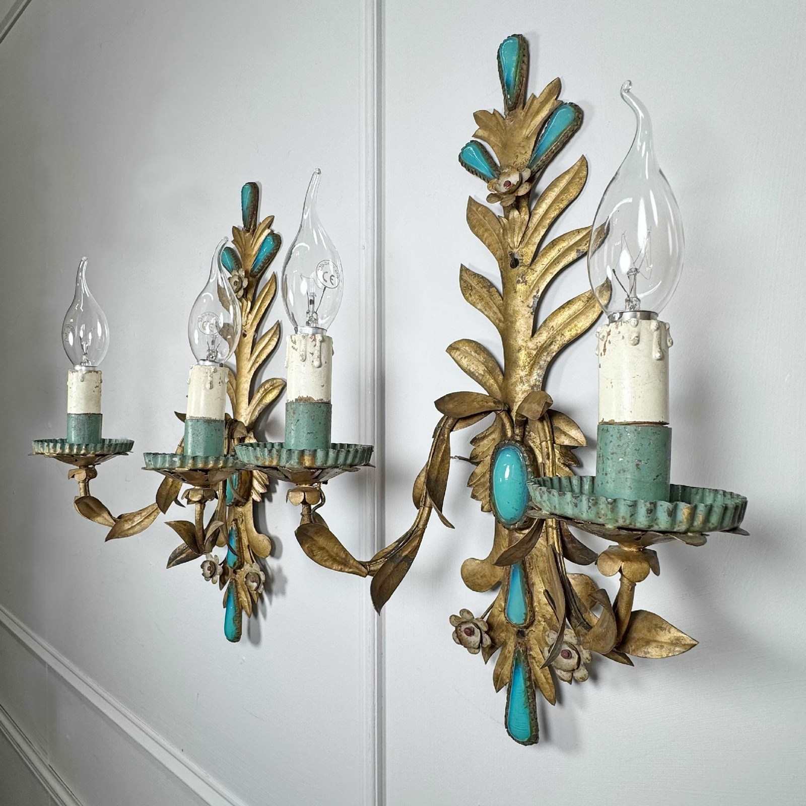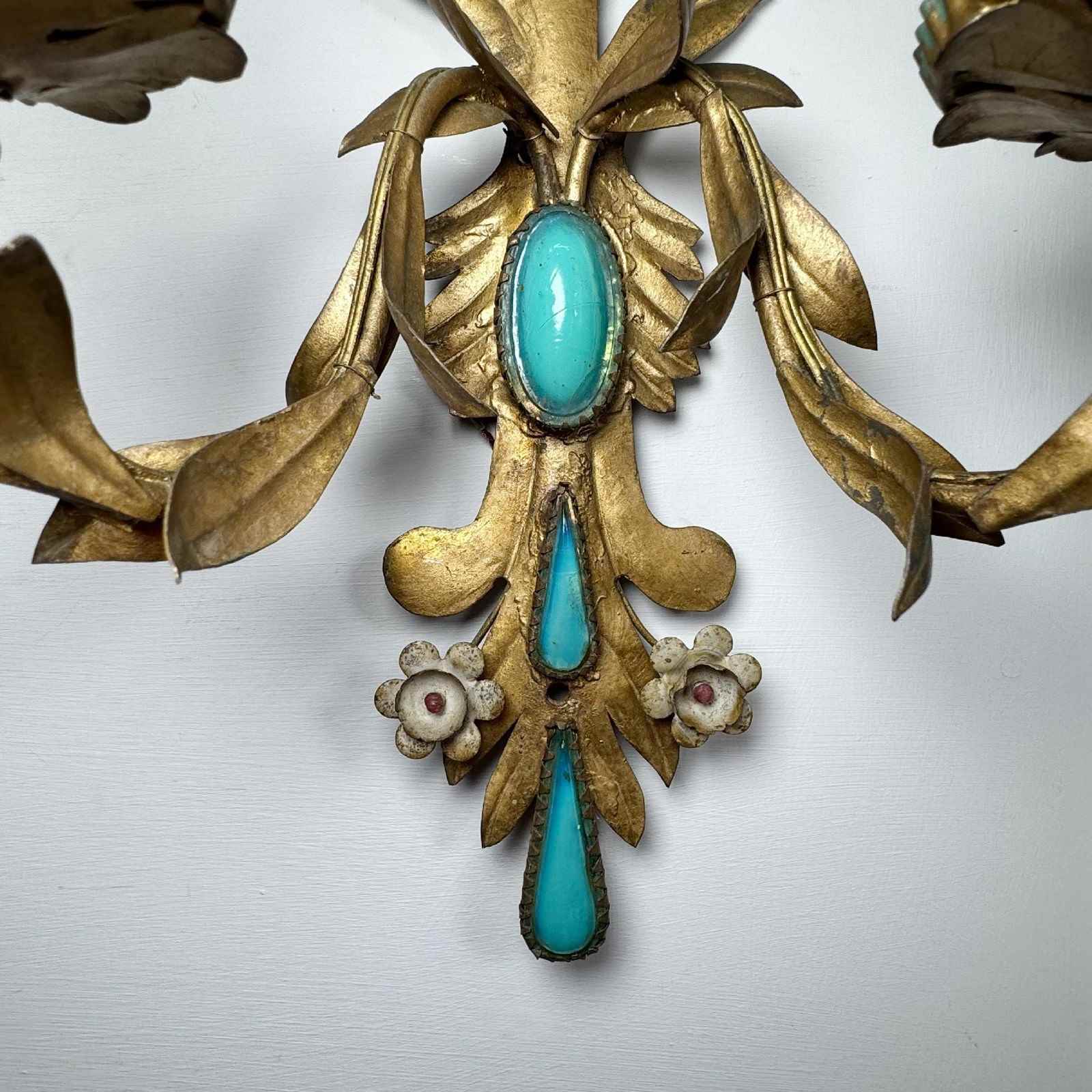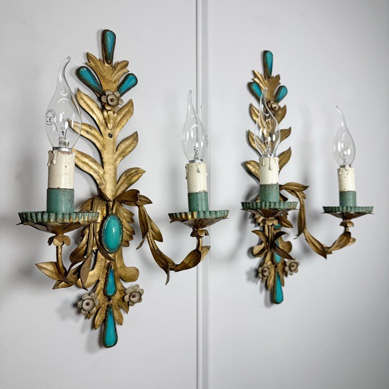An exceptional and rare pair of 19th century Italian wall lights, in gilded iron with rich turquoise glass decorative inserts, a truly stunning pair of wall lights, originally created circa 1880 as candle sconces and later sympathetically adapted to electrical lighting. Each light has two e14 (small screw in) lamp holders, original turquoise paint to cup and lamp holder.