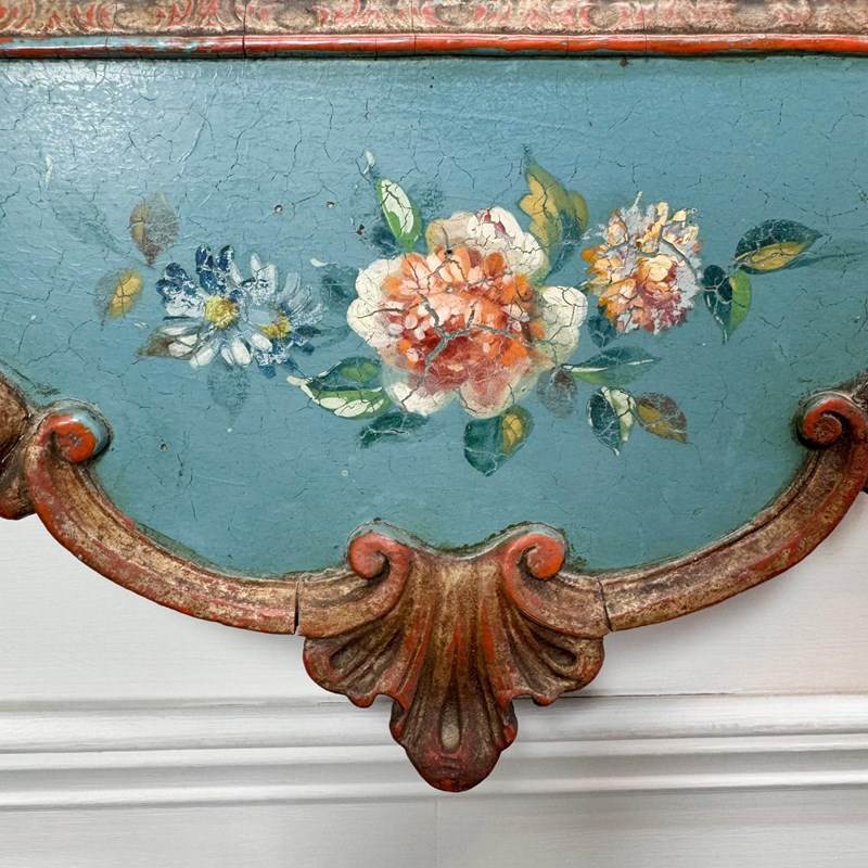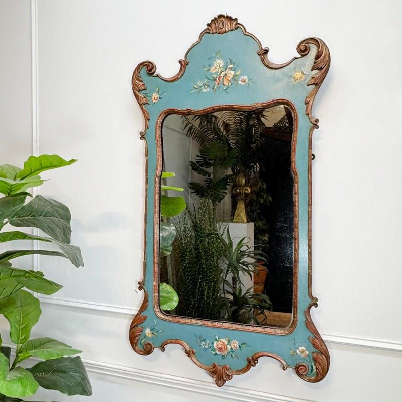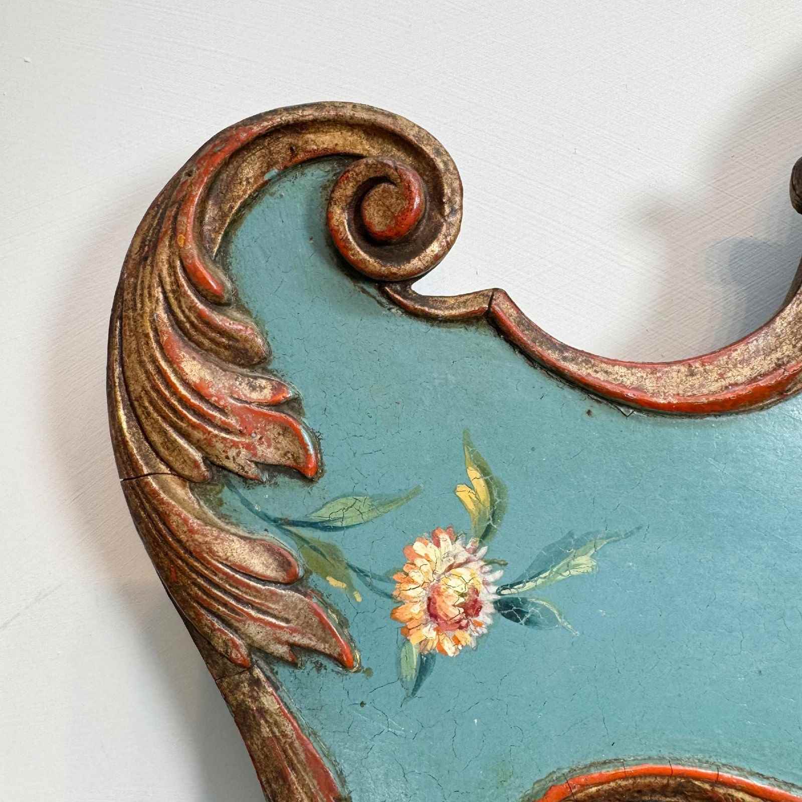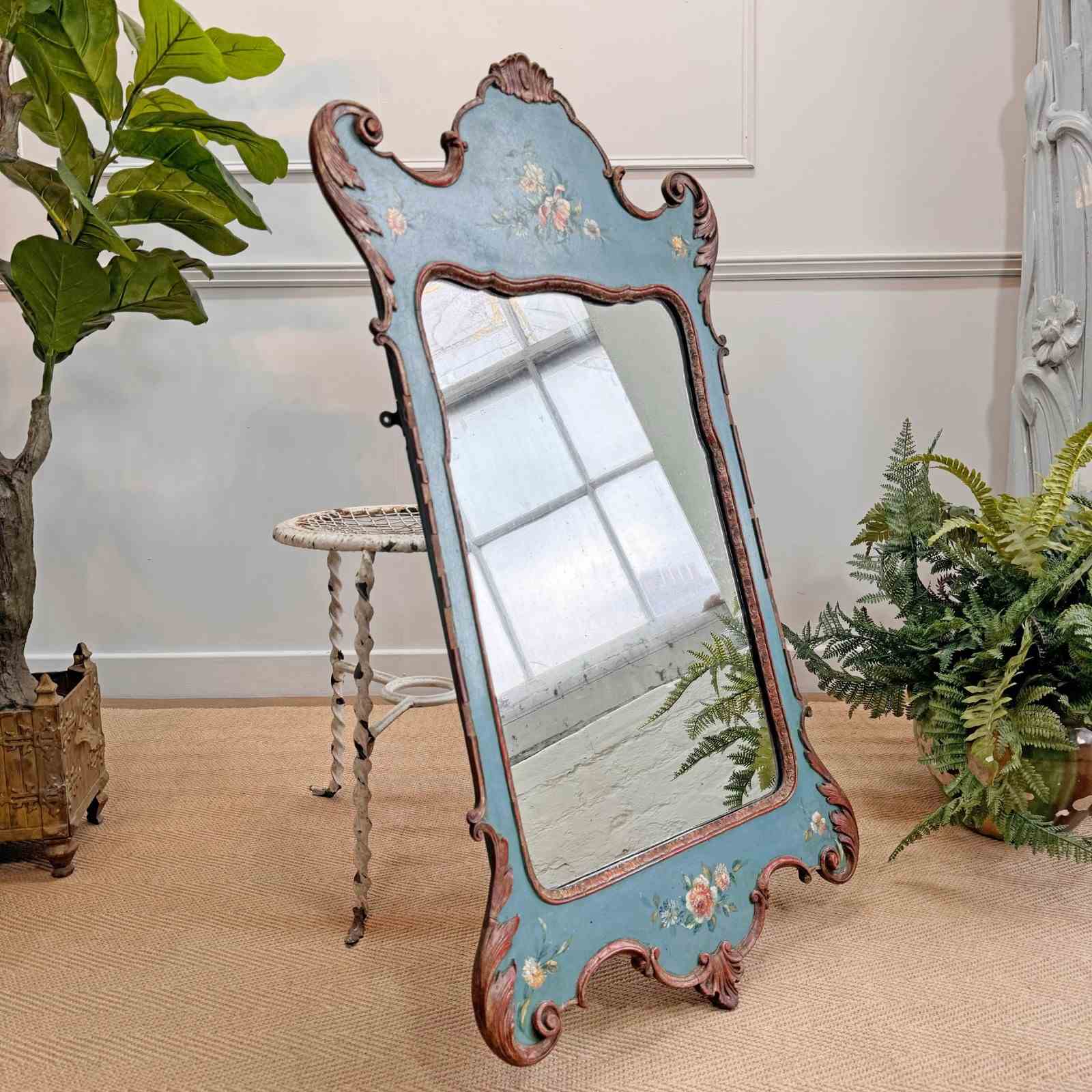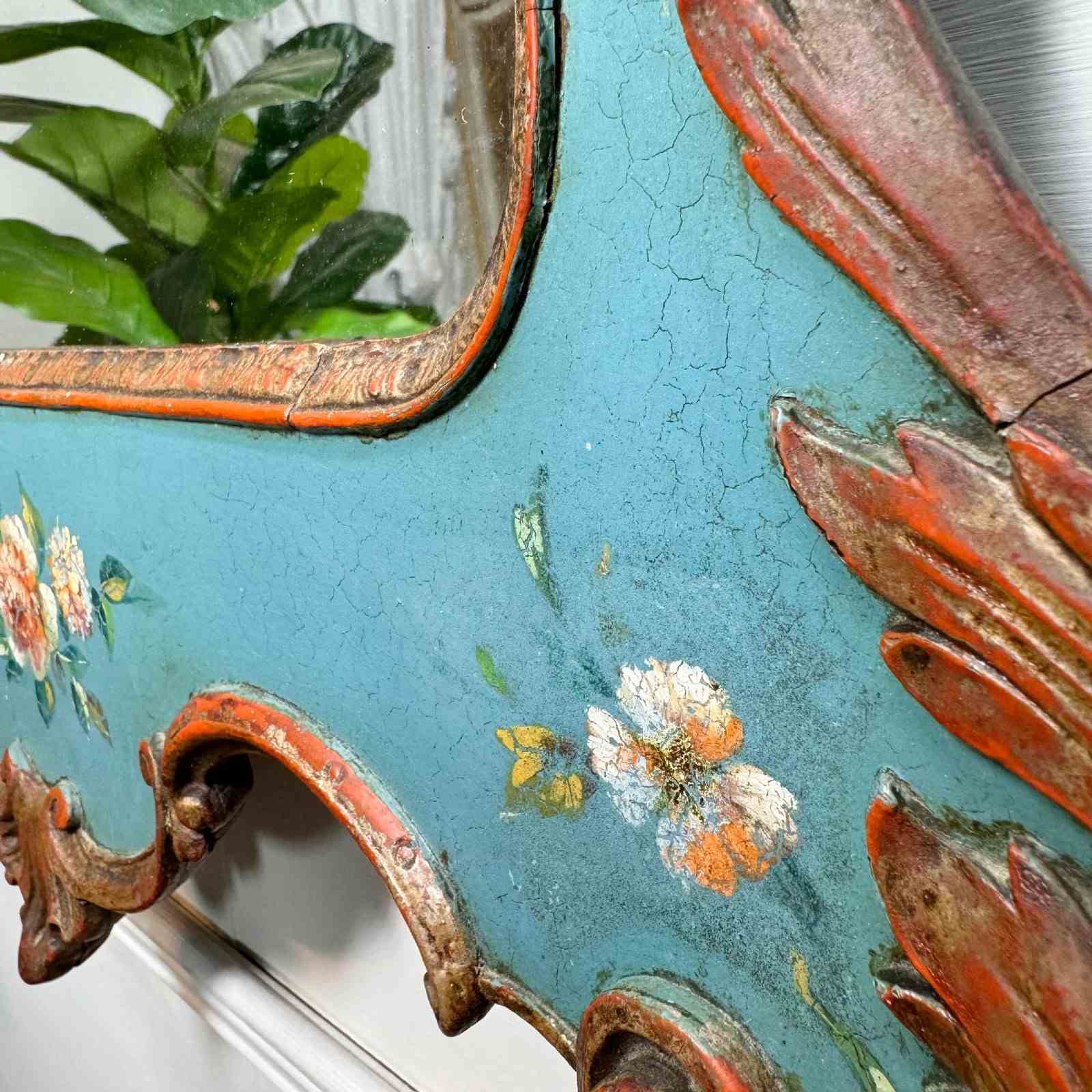 A striking Venetian style mirror, circa 1920. Carved wood with applied gesso decoration and polychrome painted with floral motifs in reds, white, yellow and greens over a bright turquoise background. The mirror is a very good size, with the original mirror plate. Small losses to some gesso at the edge.