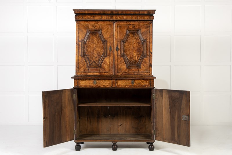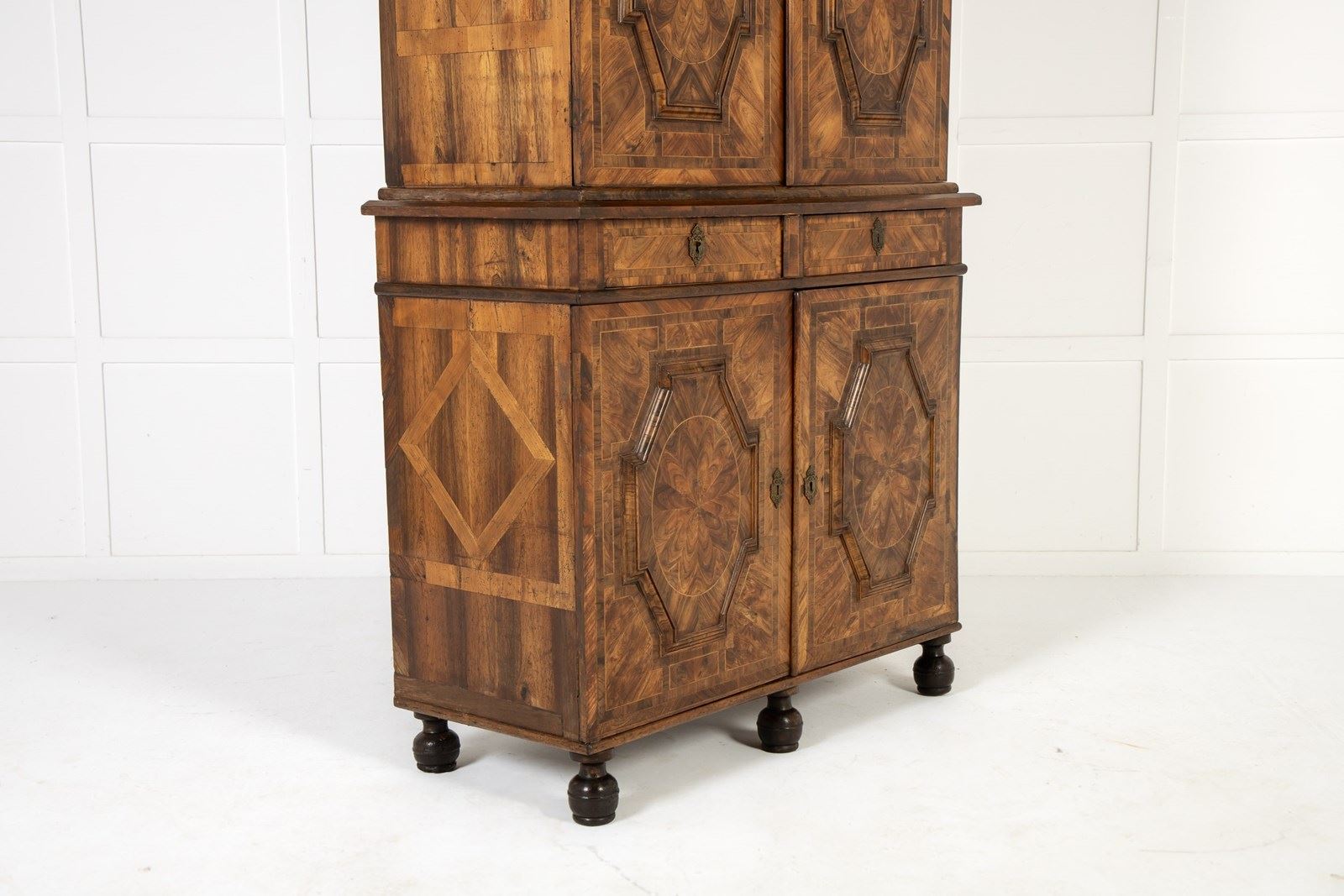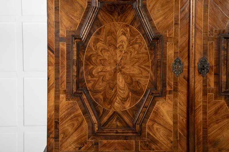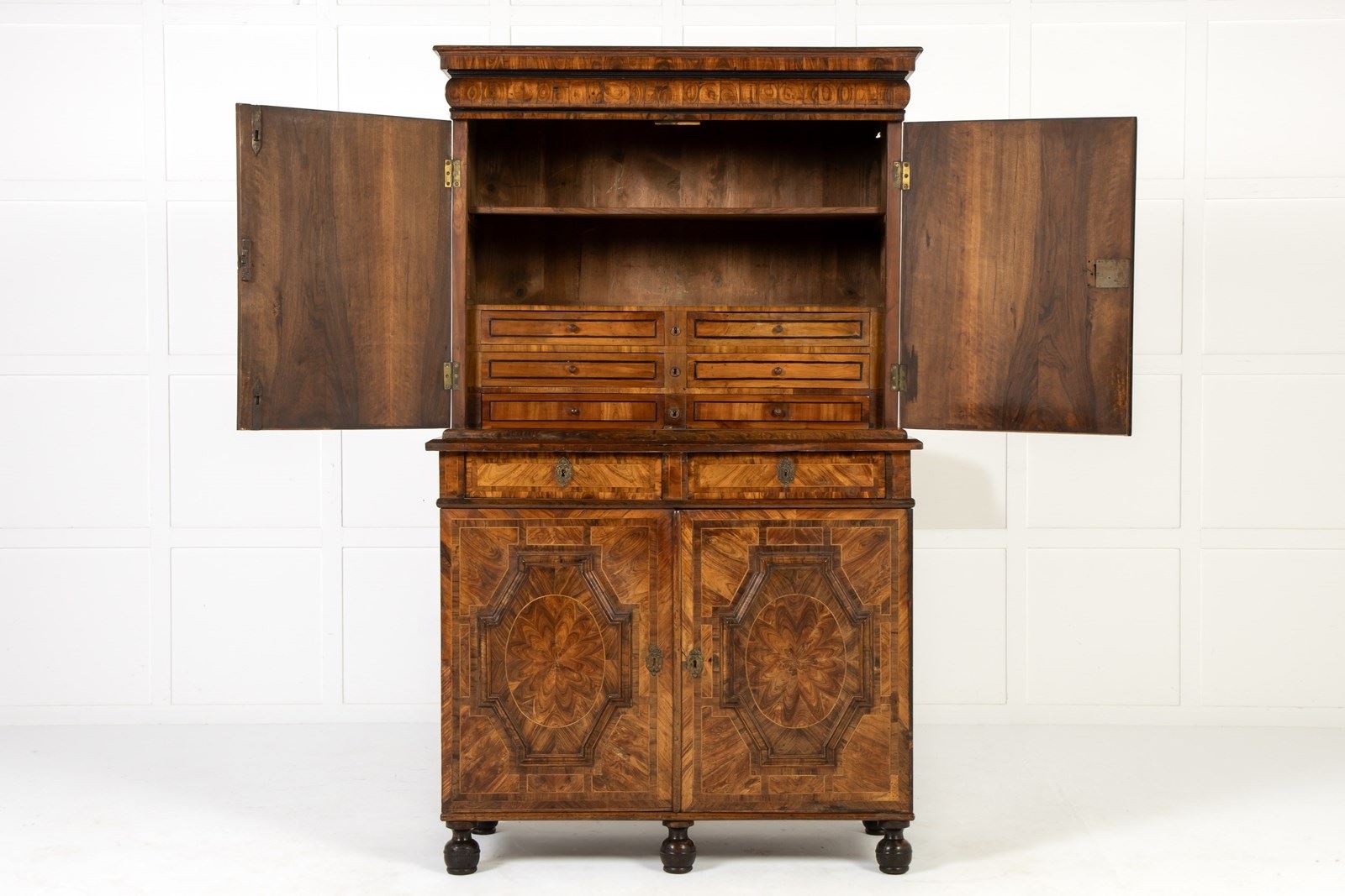 It consists of two cabinet sections, divided by a pair of drawers. The top section opens to reveal a single shelf above a series of small drawers. The lower section has just the shelf. The cabinet is veneered throughout in walnut of exceptional colour and figure. The variety of veneers used, and the way that they have been laid is very impressive. The doors have central panelled mouldings and within the cartouches created by those mouldings, the veneers are oyster cut and faceted, laid together to create a flower effect surrounded by quartered veneers for contrast. There are areas of inlaid stringing and contrasting timber. The drawers inside the top cupboard section and the sides have been extravagantly inlaid with complex parquetry.