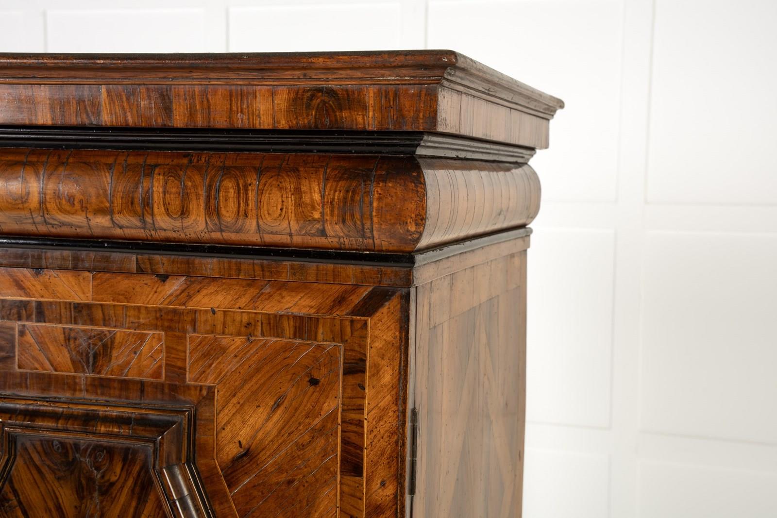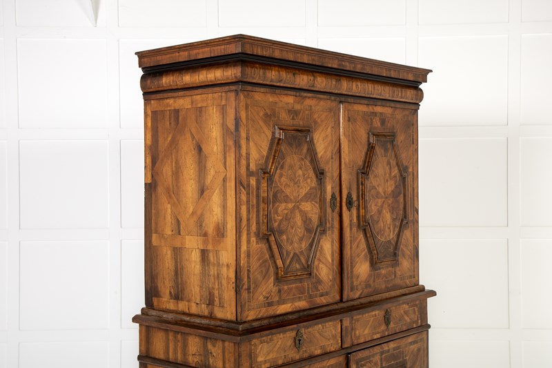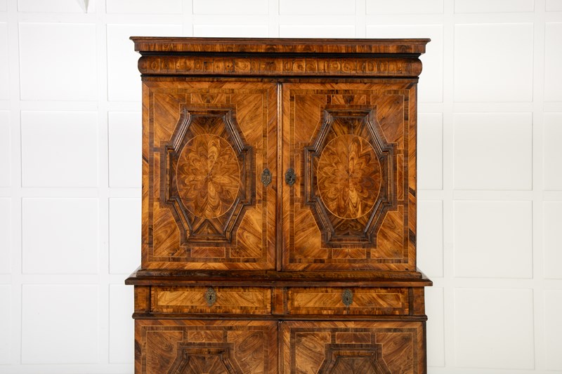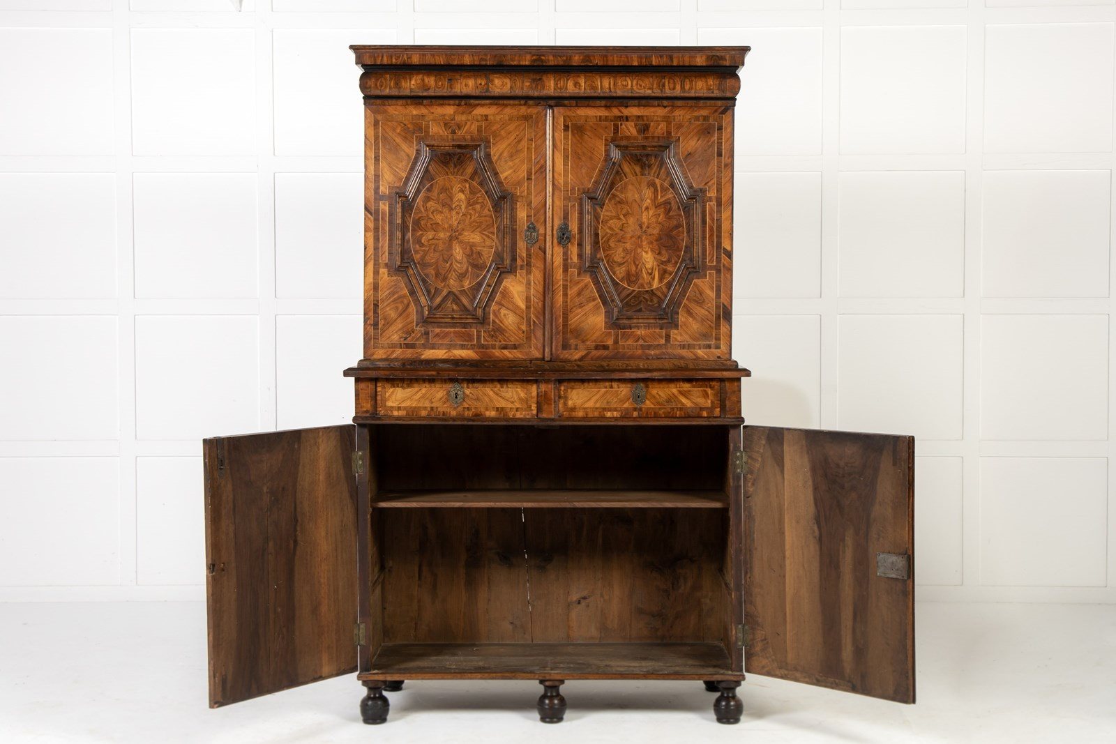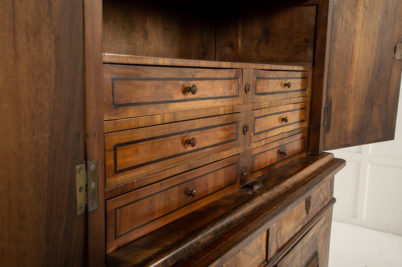 It consists of two cabinet sections, divided by a pair of drawers. The top section opens to reveal a single shelf above a series of small drawers. The lower section has just the shelf. The cabinet is veneered throughout in walnut of exceptional colour and figure. The variety of veneers used, and the way that they have been laid is very impressive. The doors have central panelled mouldings and within the cartouches created by those mouldings, the veneers are oyster cut and faceted, laid together to create a flower effect surrounded by quartered veneers for contrast. There are areas of inlaid stringing and contrasting timber. The drawers inside the top cupboard section and the sides have been extravagantly inlaid with complex parquetry.