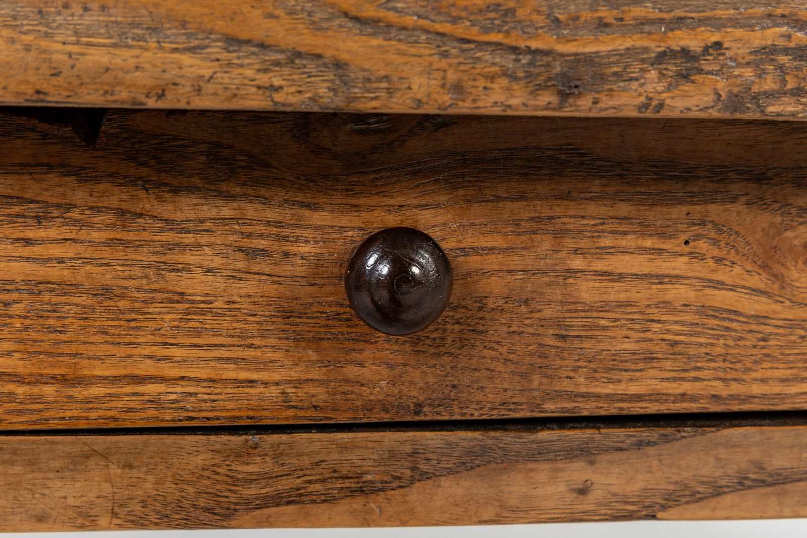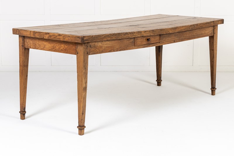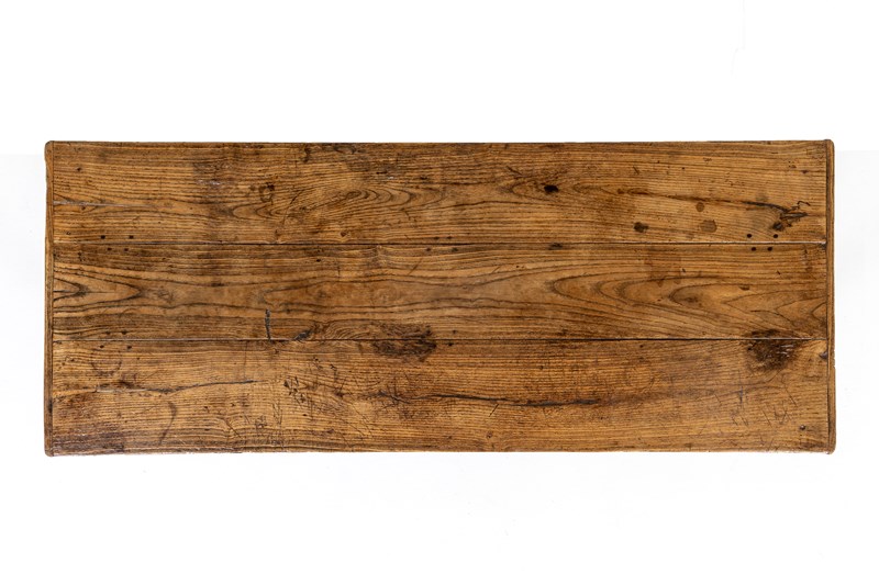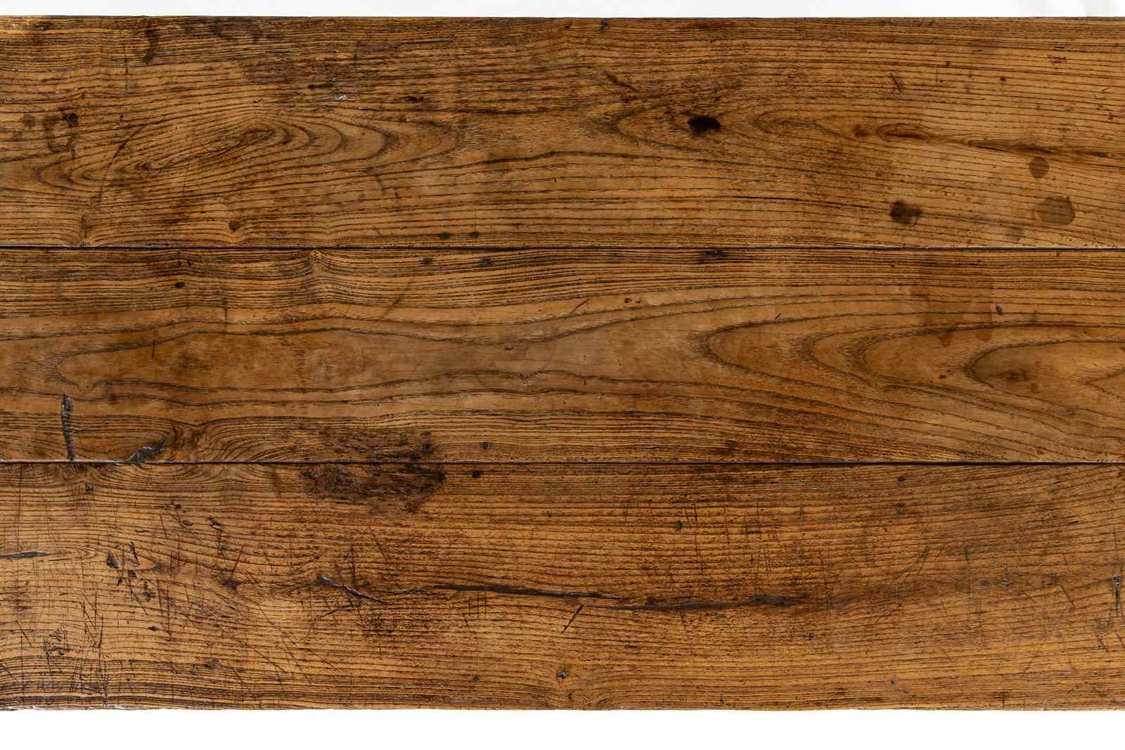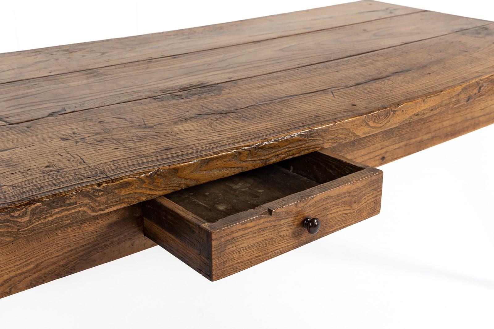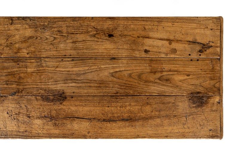 This great table has a very thick, three planked top with outstanding colour and patination. It is constructed from ash and oak and has a single small drawer, with wrought iron drawer pull, set in to the centre of the frieze. It is of pegged construction, as is usual for a table of this age. Supported by tapering square sectioned legs with collared toes.