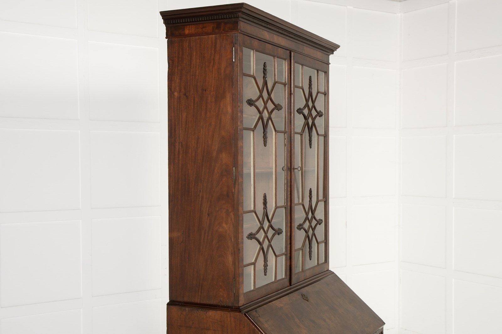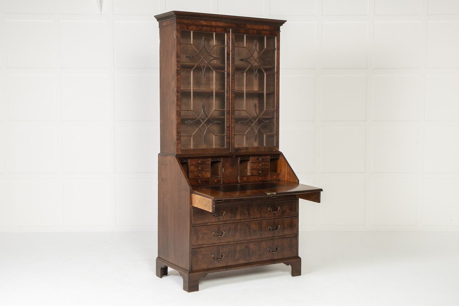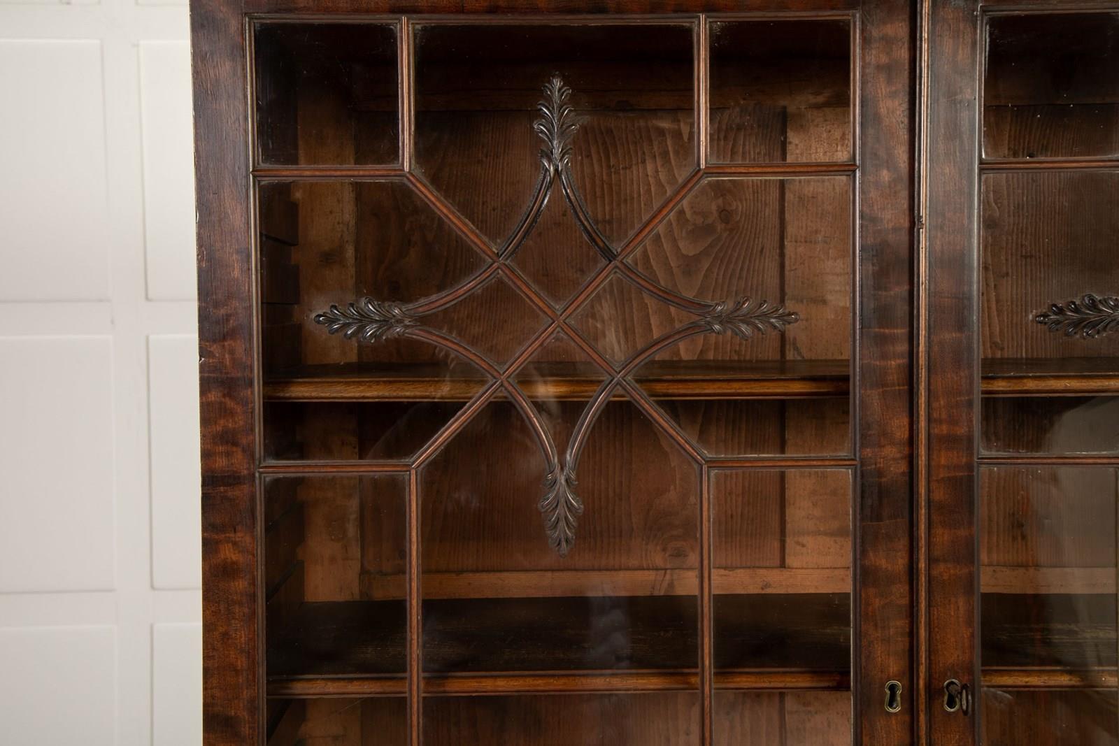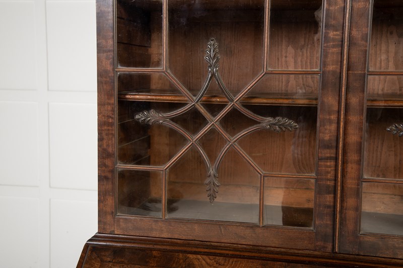 This bureau cabinet or bookcase is veneered throughout in highly figured mahogany. Beginning at the top, the piece has a dentilled cornice above a pair of glazed doors with an intricate astragal glazing bar pattern. The pattern consists of two concave-sided diamonds with leafy carved detailing to each point set against a series of geometric patterns. This intricate and very elegant design relates very closely to a series of drawings for glazing bars made by the London cabinet maker George Speer. One of the leading makers of the period, you can learn more about Speer and his output here: