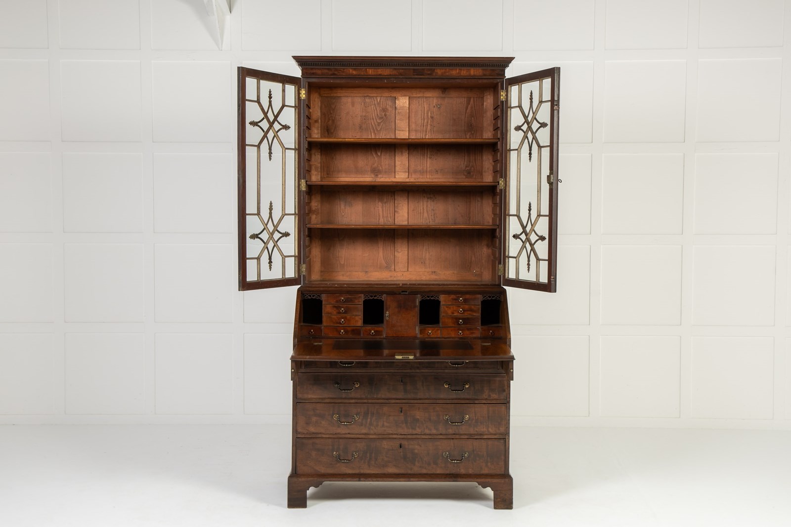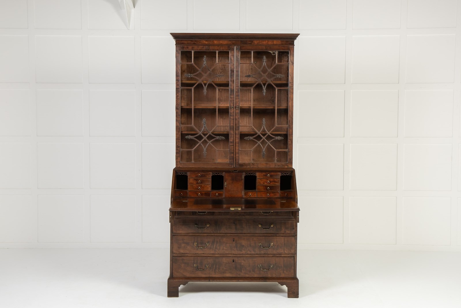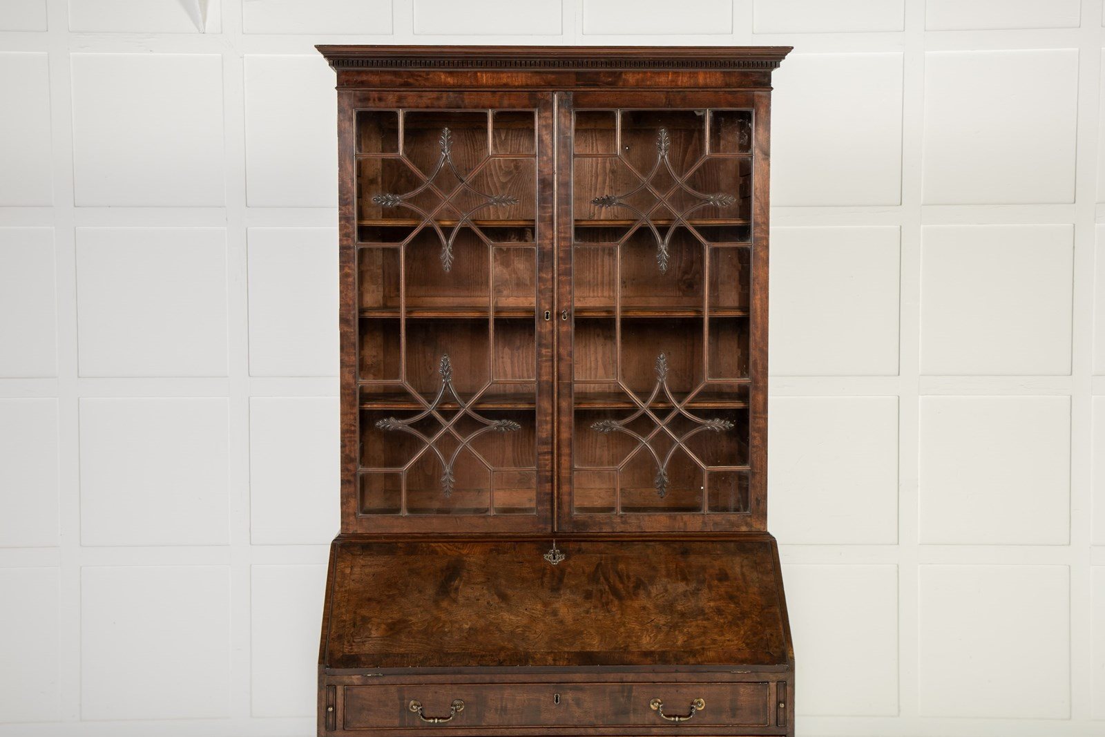 This bureau cabinet or bookcase is veneered throughout in highly figured mahogany. Beginning at the top, the piece has a dentilled cornice above a pair of glazed doors with an intricate astragal glazing bar pattern. The pattern consists of two concave-sided diamonds with leafy carved detailing to each point set against a series of geometric patterns. This intricate and very elegant design relates very closely to a series of drawings for glazing bars made by the London cabinet maker George Speer. One of the leading makers of the period, you can learn more about Speer and his output here: