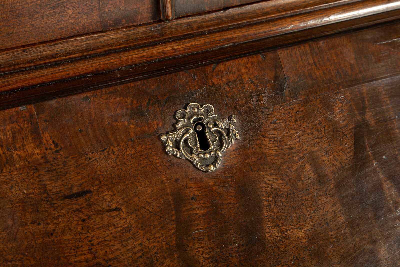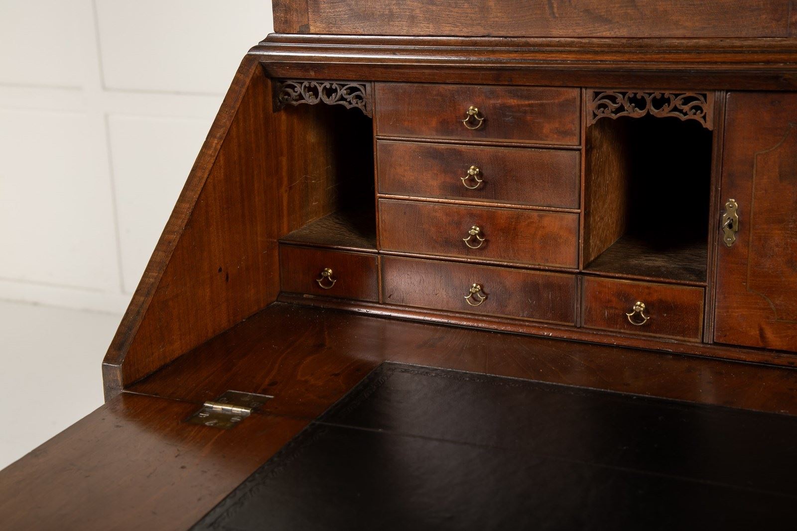 The interior of this bureau has fine fretwork sections above the pigeon holes and delightful axe head handles used on the small drawers, as well as the lovely handles and escutcheons used on the external drawers, are all original and of the highest quality. The back of the piece is panelled, another sign of great quality, and it has a lovely colour and patination. An exceptional example.