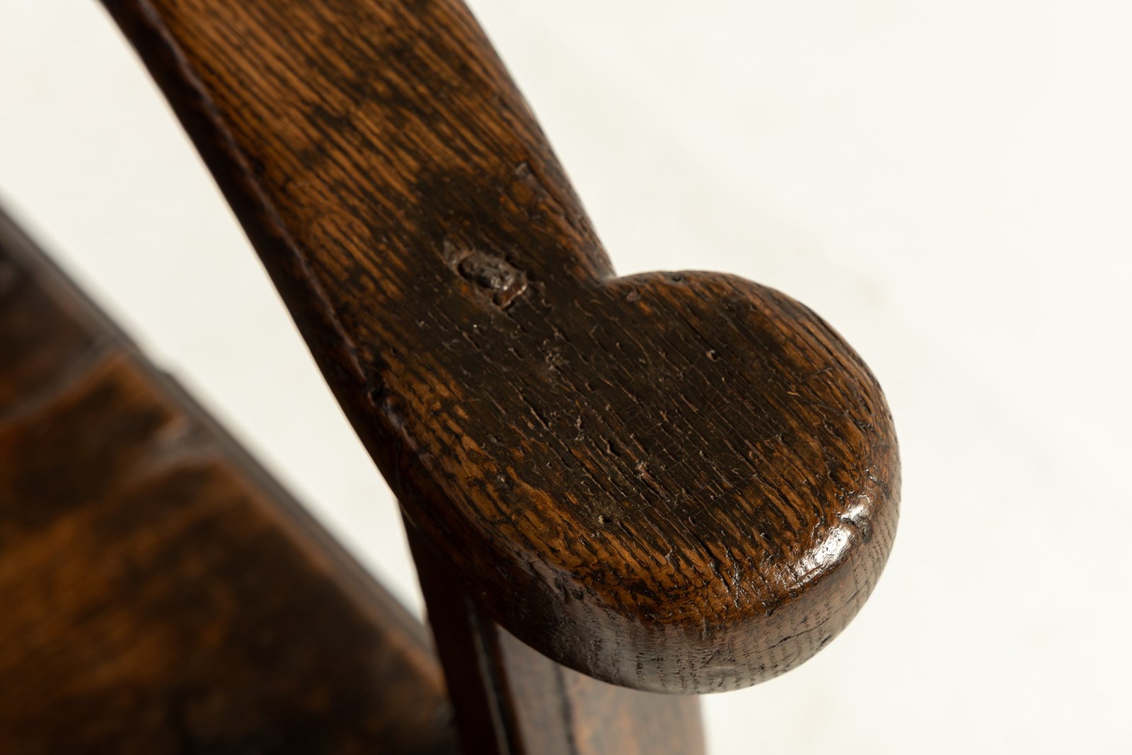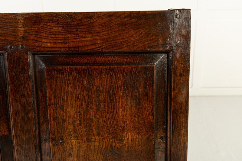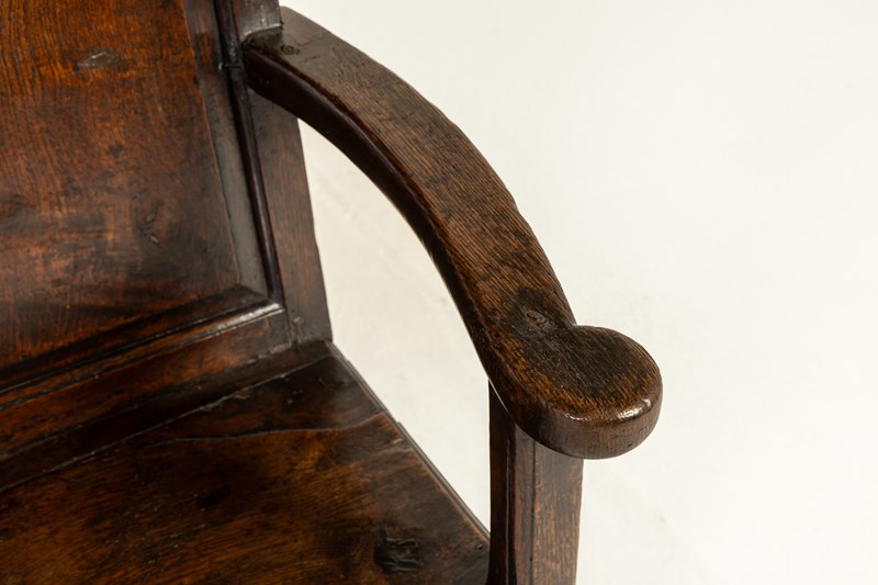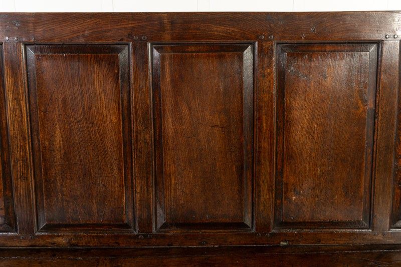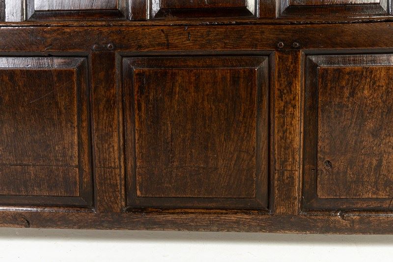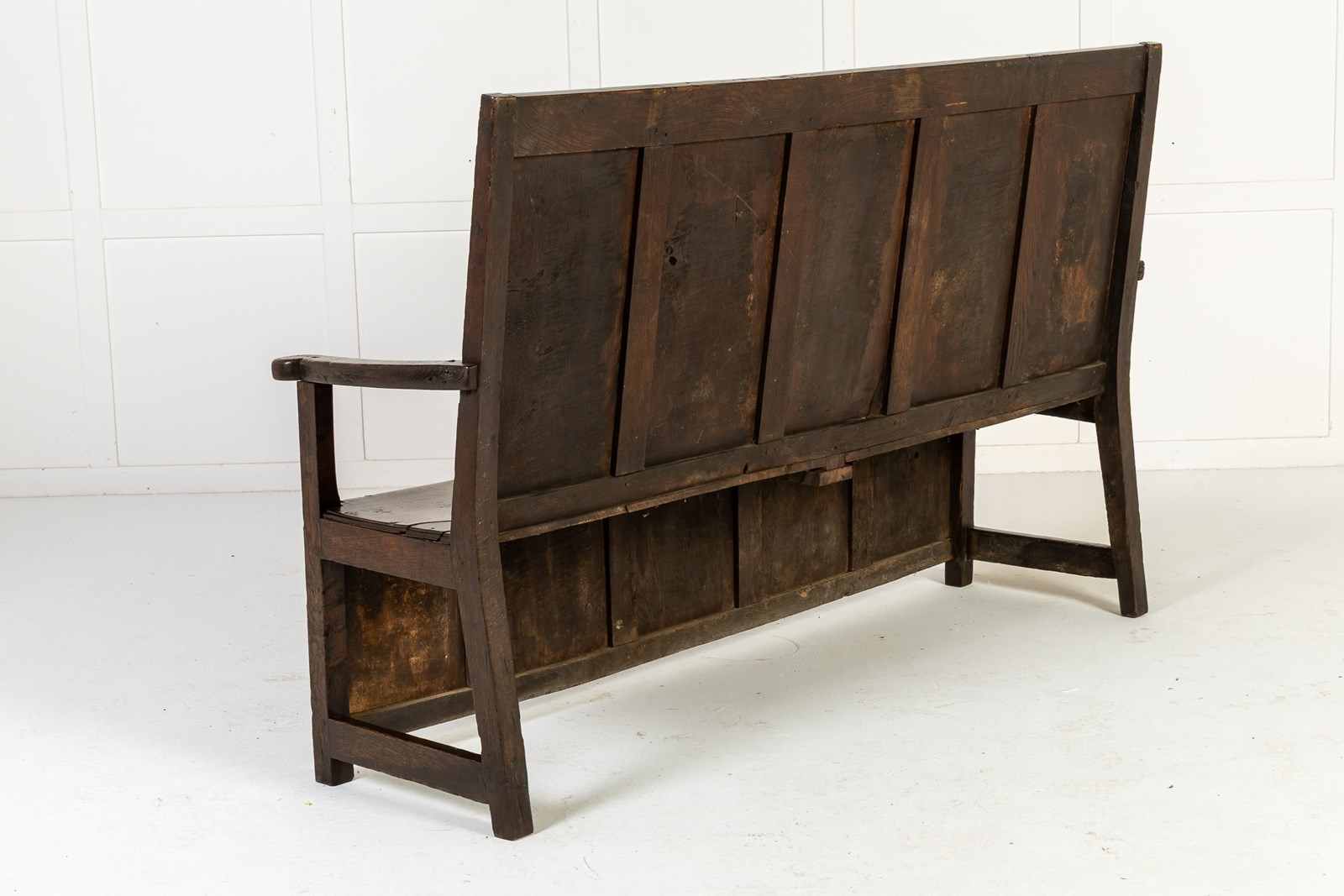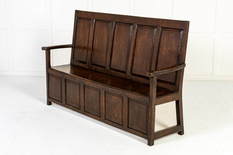 18th Century English oak settle with a high back. Unusual format of five fielded panels at the back mirrored on the font panel, and having open arms.