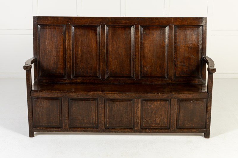 https://www.decorativecollective.com/dealers/lee-wright-antiques18th Century English oak settle with a high back. Unusual format of five fielded panels at the back mirrored on the font panel, and having open arms.