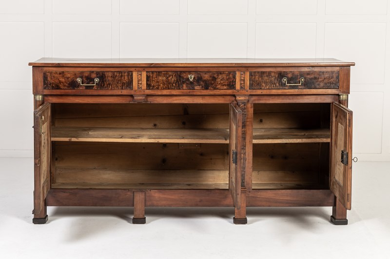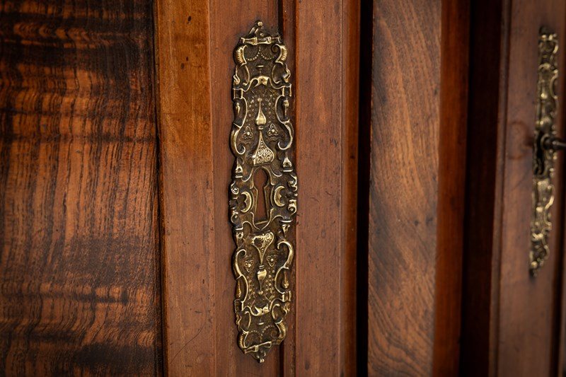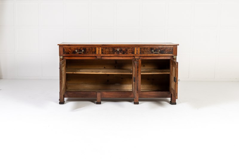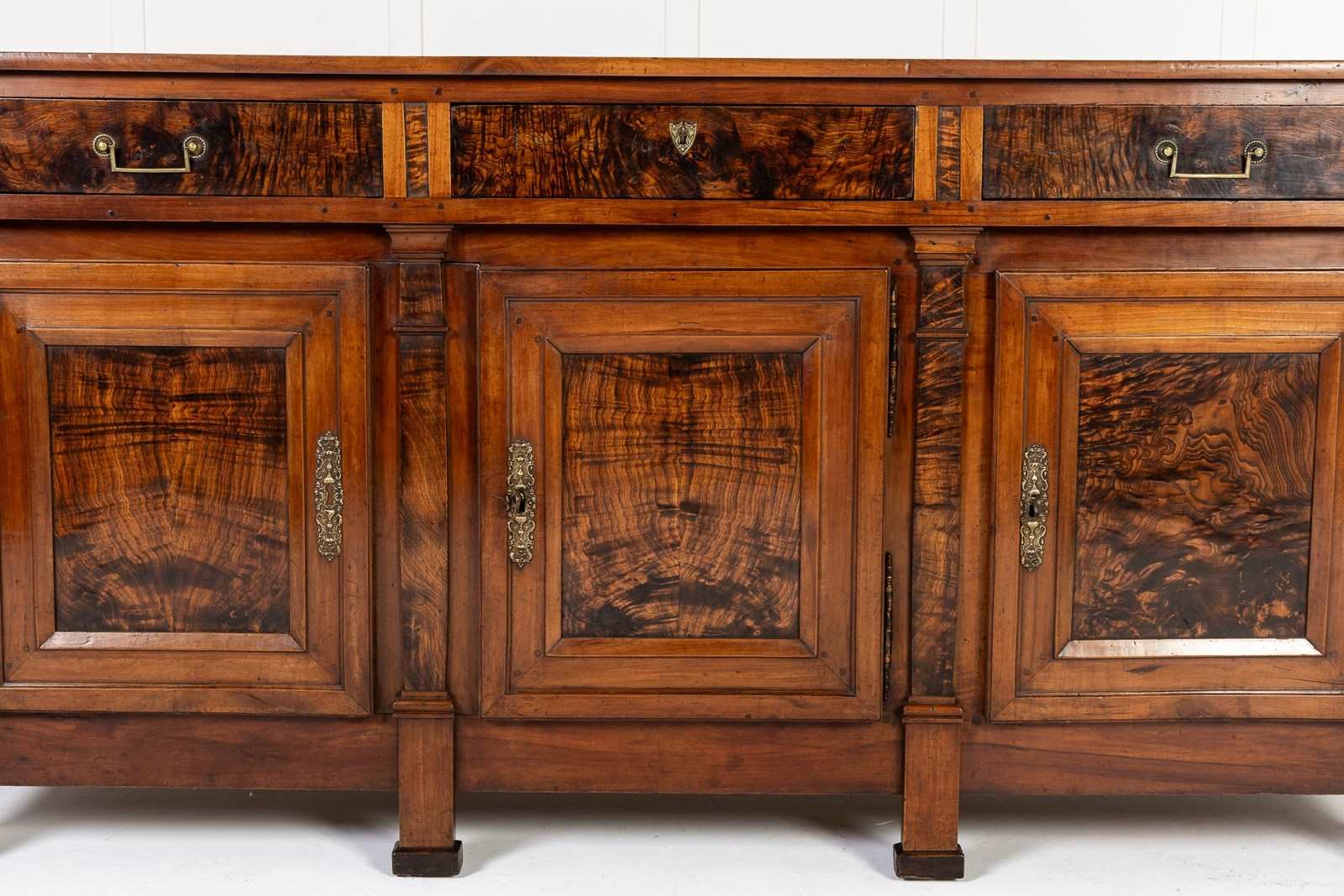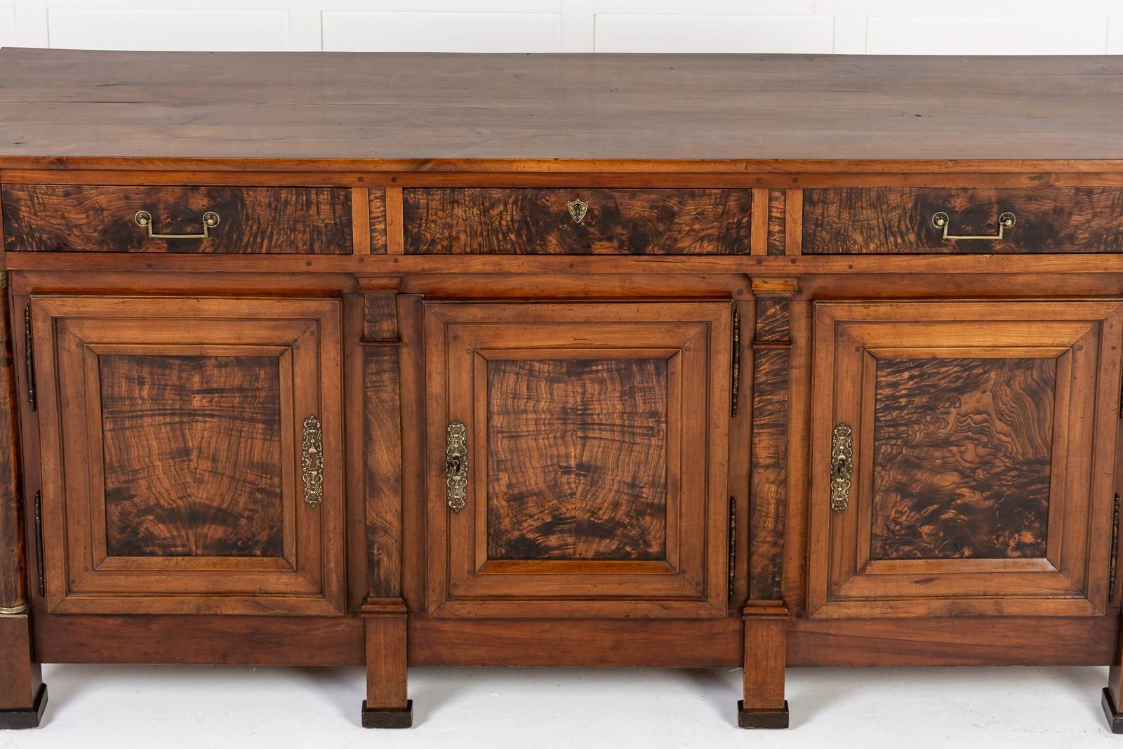 The majority of this enfilade is made from cherry wood but the drawer fronts and the centres of the door panels and the pilasters are highlighted with exceptionally figured panels of burr ash. The top is made from three planks of cherrywood. The metalware is original throughout, the handles having squared bails and wreath-form backplates. The long escutcheon plates on the cupboard sections are decorated with detailed designs of grotesques. The smaller escutcheons on the drawers are of shield form. There are ormolu capital mounts to the top of the columnar pilasters. The hinges on the cupboard doors are japanned and decorated in gilt. This decoration survives in remarkable original condition. There are three drawers above the three cupboard formation. Standing on squared toupie feet.