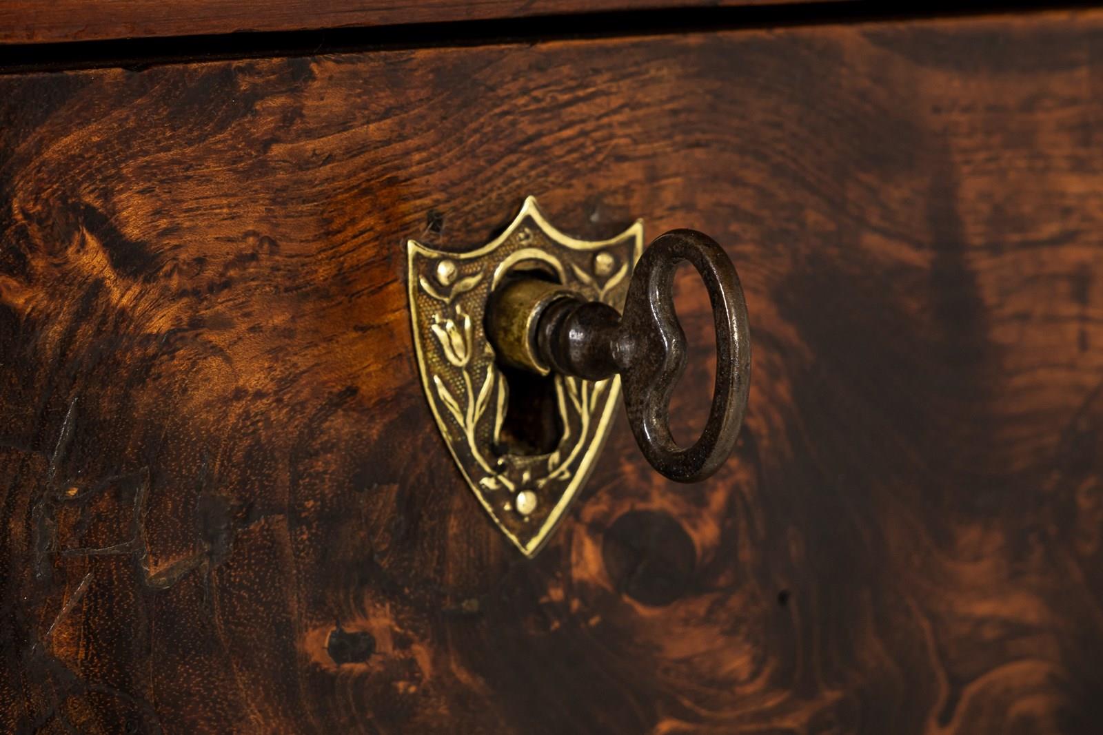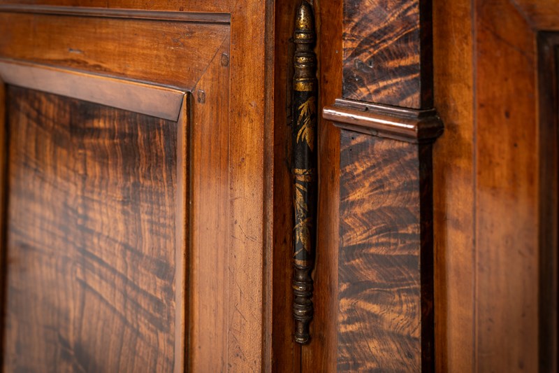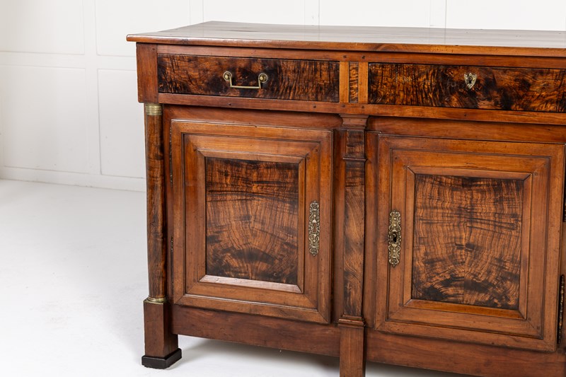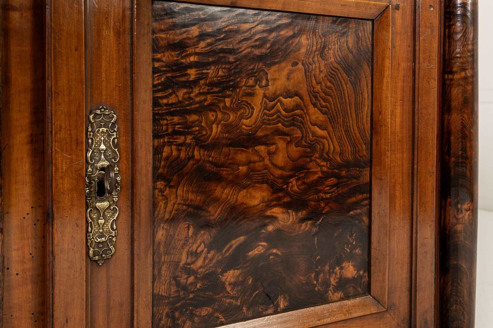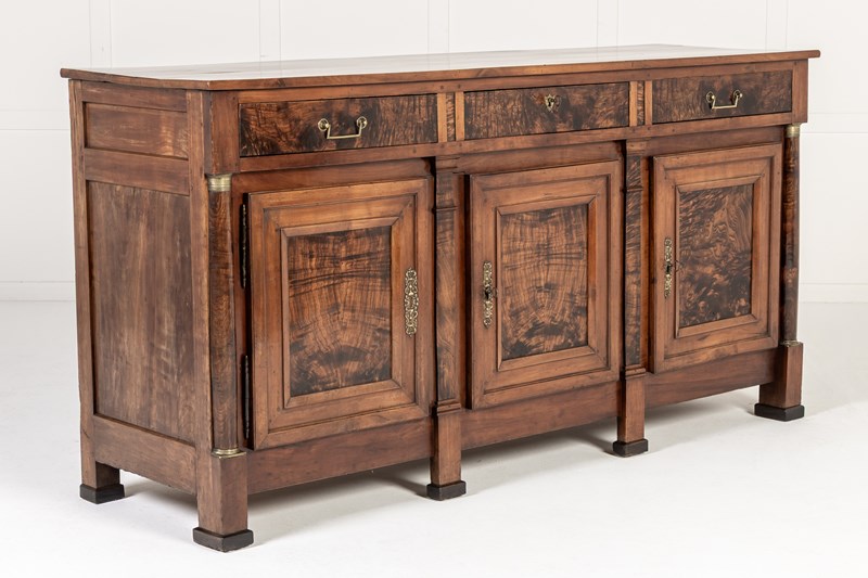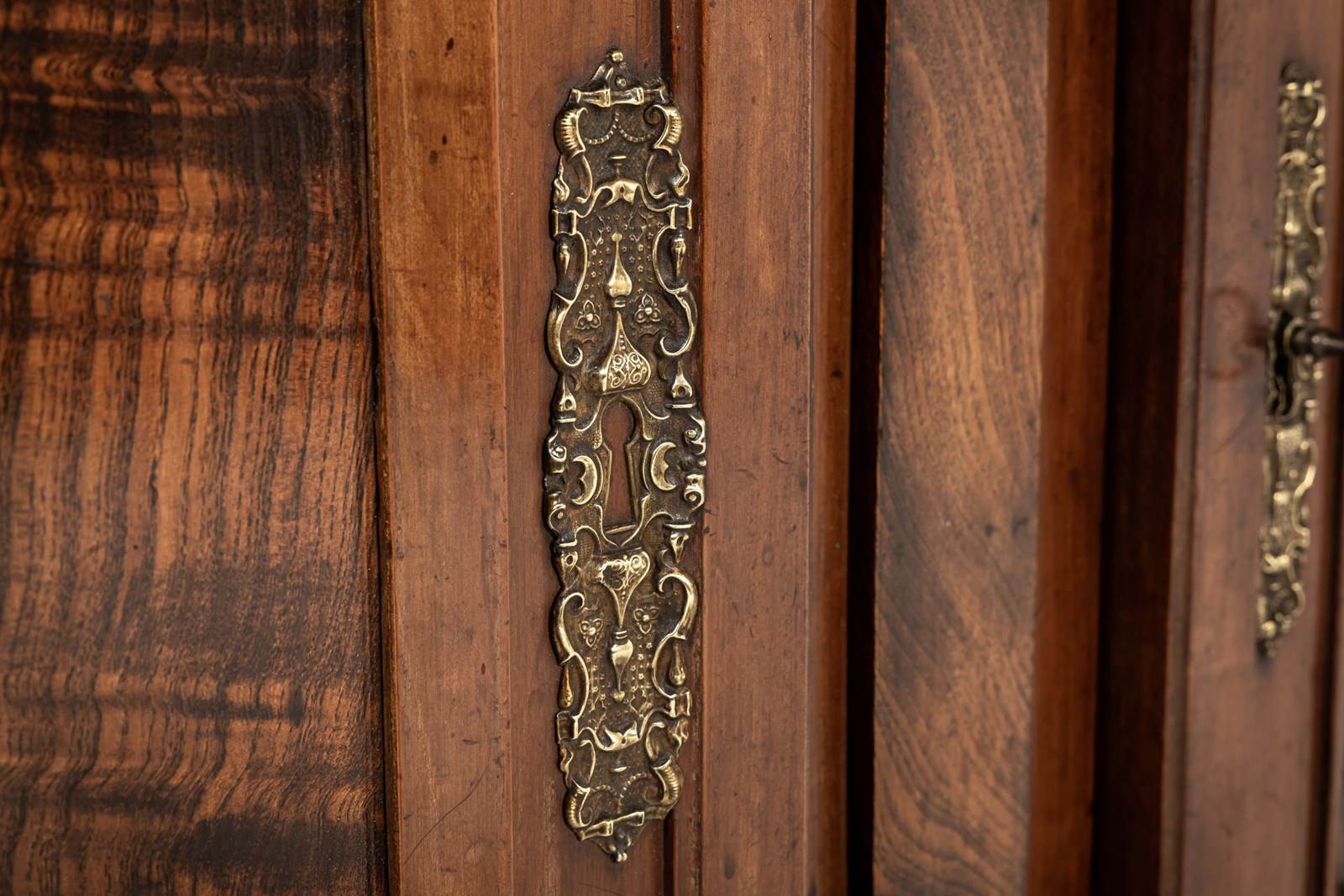 The majority of this enfilade is made from cherry wood but the drawer fronts and the centres of the door panels and the pilasters are highlighted with exceptionally figured panels of burr ash. The top is made from three planks of cherrywood. The metalware is original throughout, the handles having squared bails and wreath-form backplates. The long escutcheon plates on the cupboard sections are decorated with detailed designs of grotesques. The smaller escutcheons on the drawers are of shield form. There are ormolu capital mounts to the top of the columnar pilasters. The hinges on the cupboard doors are japanned and decorated in gilt. This decoration survives in remarkable original condition. There are three drawers above the three cupboard formation. Standing on squared toupie feet.
