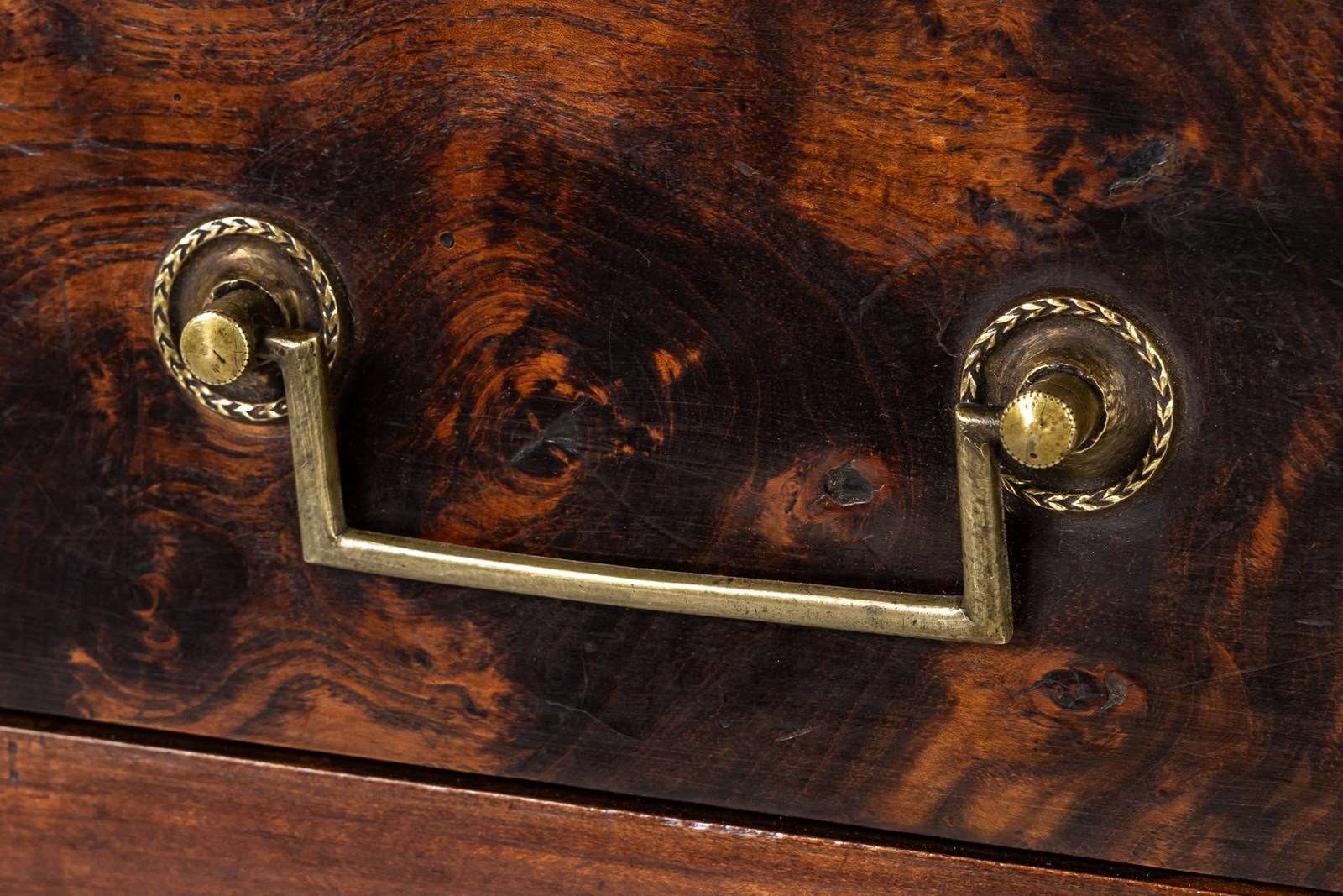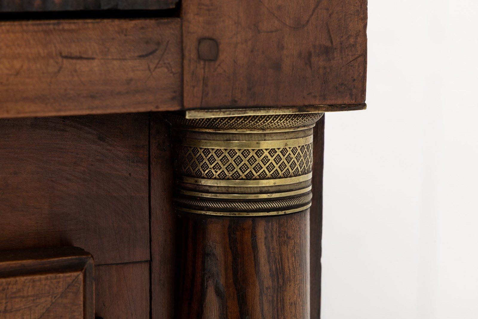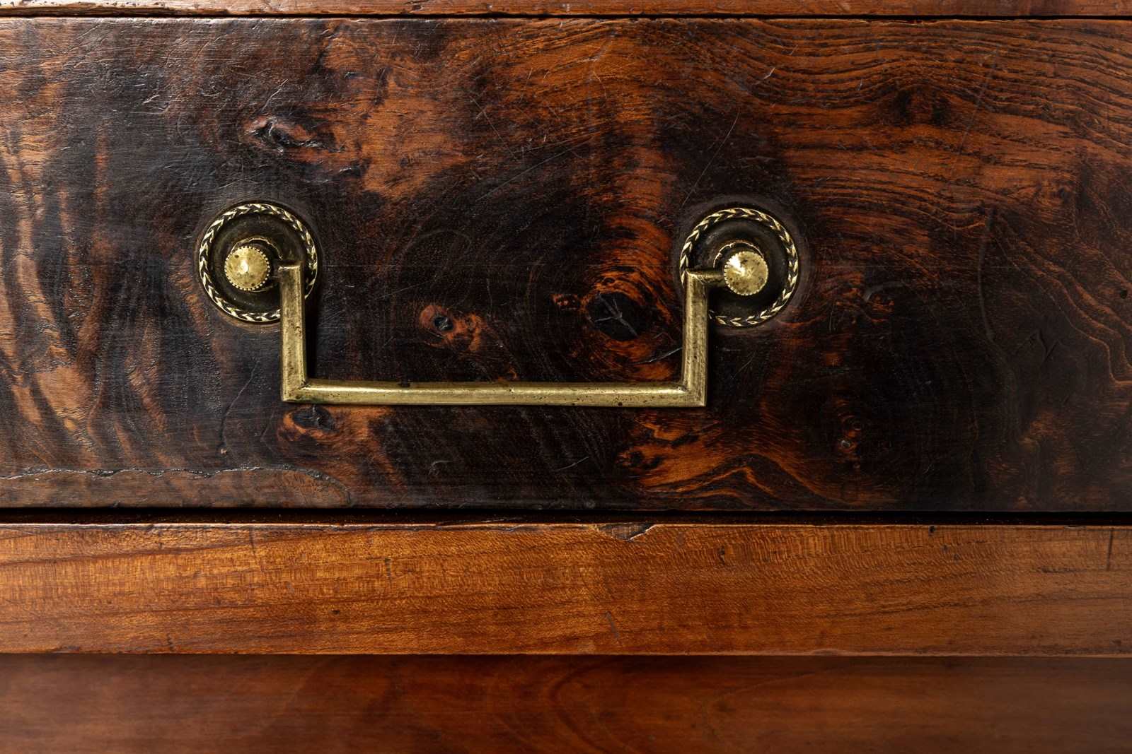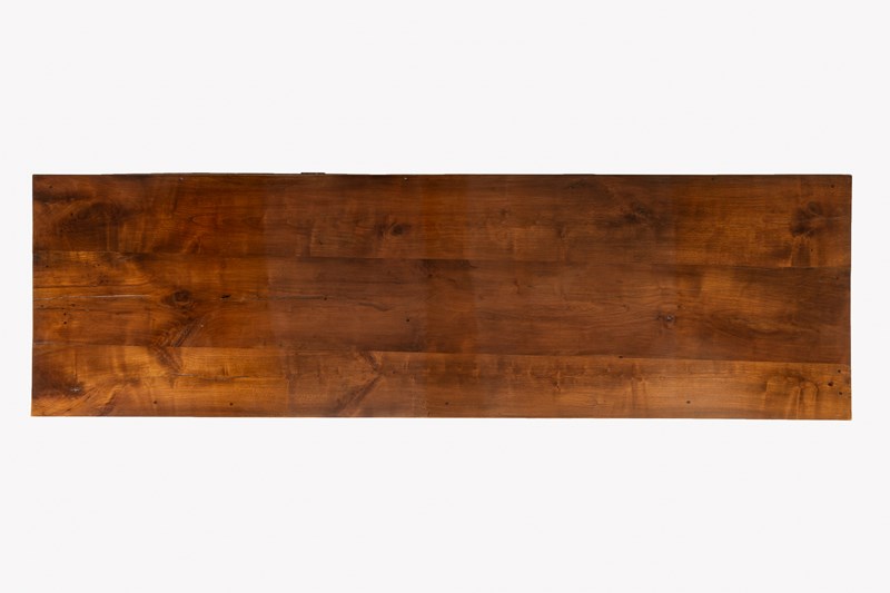 The majority of this enfilade is made from cherry wood but the drawer fronts and the centres of the door panels and the pilasters are highlighted with exceptionally figured panels of burr ash. The top is made from three planks of cherrywood. The metalware is original throughout, the handles having squared bails and wreath-form backplates. The long escutcheon plates on the cupboard sections are decorated with detailed designs of grotesques. The smaller escutcheons on the drawers are of shield form. There are ormolu capital mounts to the top of the columnar pilasters. The hinges on the cupboard doors are japanned and decorated in gilt. This decoration survives in remarkable original condition. There are three drawers above the three cupboard formation. Standing on squared toupie feet.