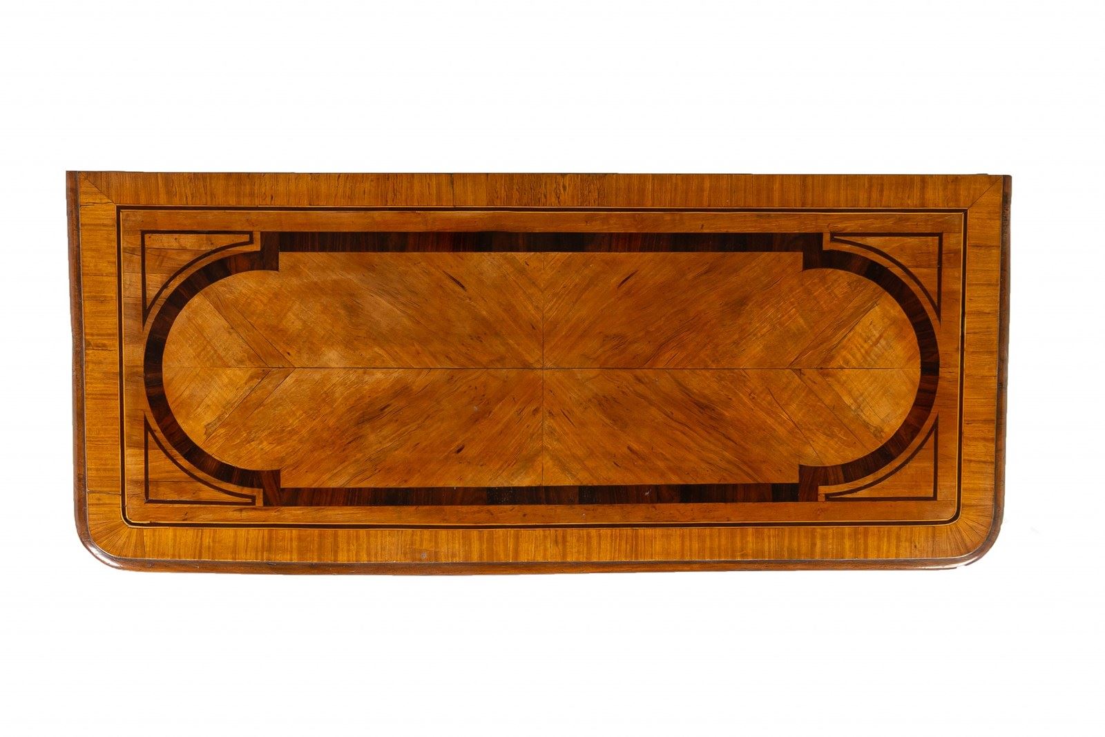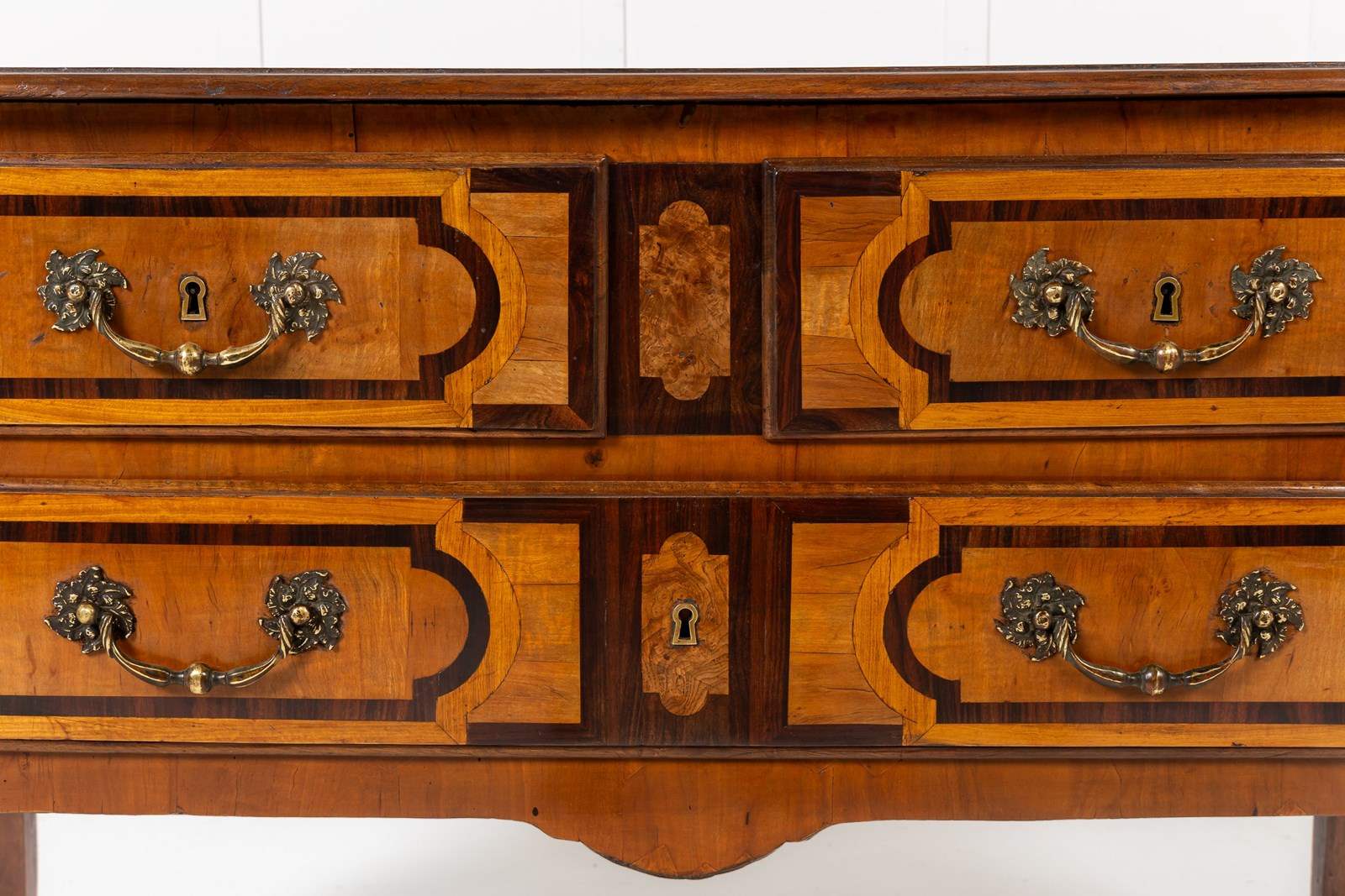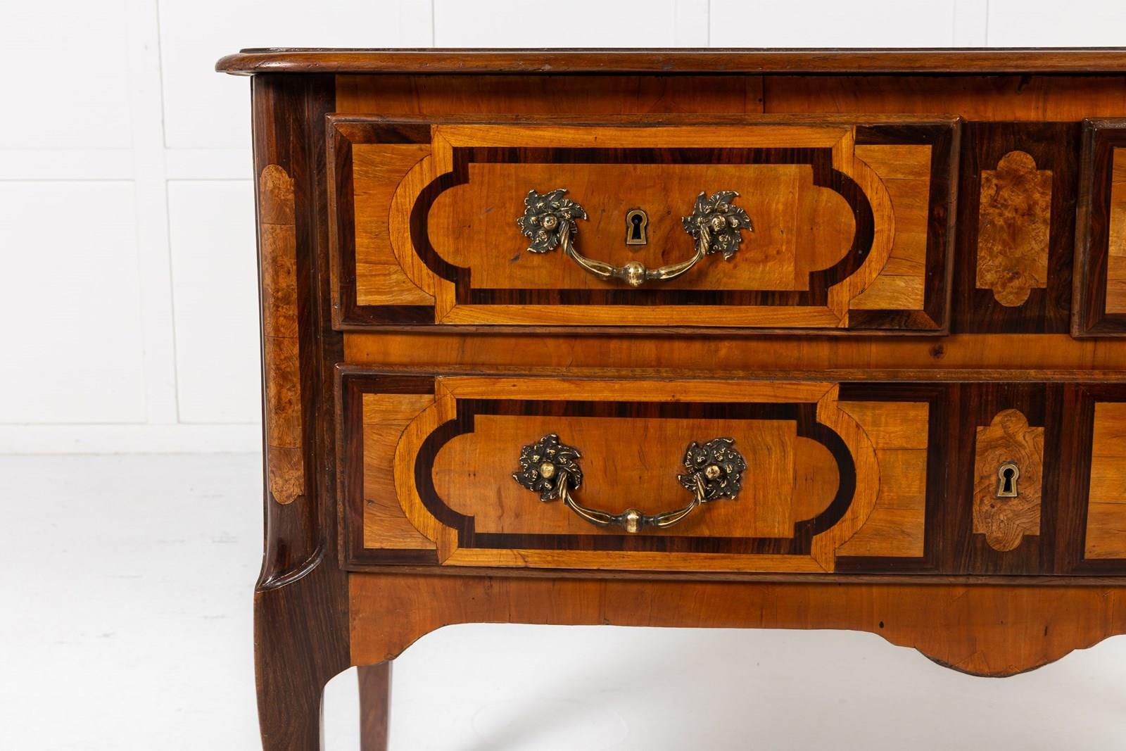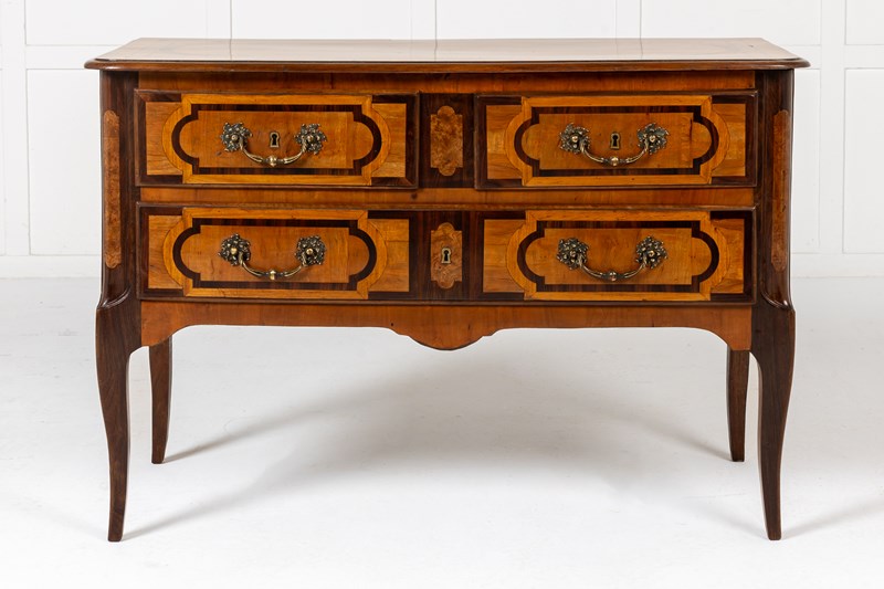 This commode is a good example of French provincial furniture in the late Louis XV and early Louis XVI taste. The legs are restrained cabriole legs of that period. The handles are of restrained rococo rather than neoclassical pattern. Veneered in cherrywood, and inlaid in contrasting satinwood and rosewood. The inlay scheme is beautiful and consistent. The top features a large inlaid panel in rosewood with contrasting bookmatched timber in the centre. This same design is then used on the drawer fronts and pilasters which are also inlaid and panalled.